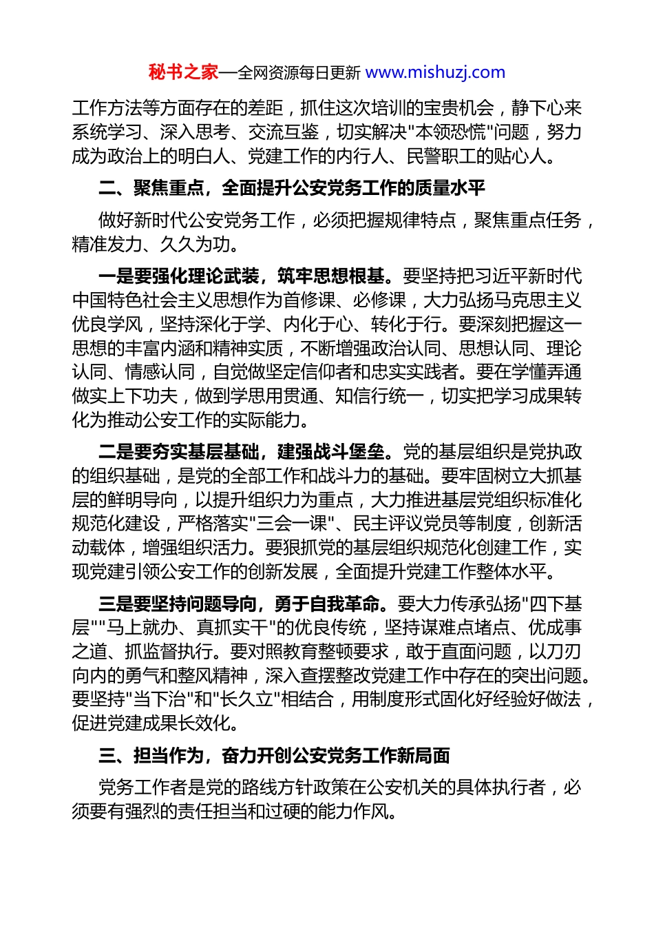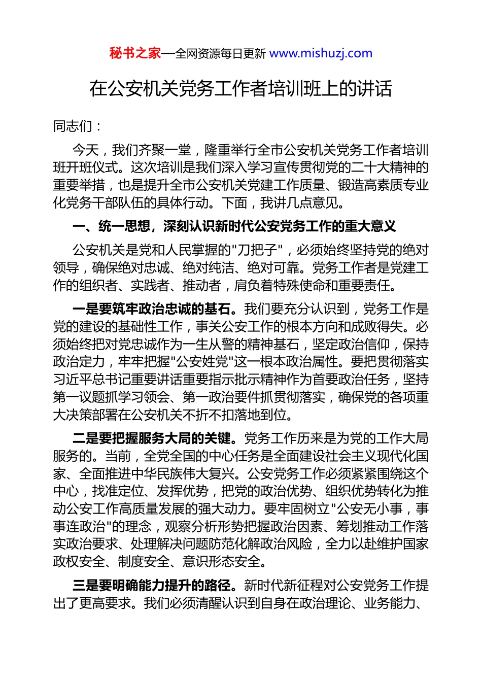 秘书之家—全网资源每日更新 www.mishuzj.com在公安机关党务工作者培训班上的讲话同志们:今天,我们齐聚一堂,隆重举行全市公安机关党务工作者培训班开班仪式。这次培训是我们深入学习宣传贯彻党的二十大精神的重要举措,也是提升全市公安机关党建工作质量、锻造高素质专业化党务干部队伍的具体行动。下面,我讲几点意见。一、统一思想,深刻认识新时代公安党务工作的重大意义公安机关是党和人民掌握的"刀把子",必须始终坚持党的绝对领导,确保绝对忠诚、绝对纯洁、绝对可靠。党务工作者是党建工作的组织者、实践者、推动者,肩负着特殊使命和重要责任。一是要筑牢政治忠诚的基石。我们要充分认识到,党务工作是党的建设的基础性工作,事关公安工作的根本方向和成败得失。必须始终把对党忠诚作为一生从警的精神基石,坚定政治信仰,保持政治定力,牢牢把握"公安姓党"这一根本政治属性。要把贯彻落实习近平总书记重要讲话重要指示批示精神作为首要政治任务,坚持第一议题抓学习领会、第一政治要件抓贯彻落实,确保党的各项重大决策部署在公安机关不折不扣落地到位。二是要把握服务大局的关键。党务工作历来是为党的工作大局服务的。当前,全党全国的中心任务是全面建设社会主义现代化国家、全面推进中华民族伟大复兴。公安党务工作必须紧紧围绕这个中心,找准定位、发挥优势,把党的政治优势、组织优势转化为推动公安工作高质量发展的强大动力。要牢固树立"公安无小事,事事连政治"的理念,观察分析形势把握政治因素、筹划推动工作落实政治要求、处理解决问题防范化解政治风险,全力以赴维护国家政权安全、制度安全、意识形态安全。三是要明确能力提升的路径。新时代新征程对公安党务工作提出了更高要求。我们必须清醒认识到自身在政治理论、业务能力、秘书之家—全网资源每日更新 www.mishuzj.com工作方法等方面存在的差距,抓住这次培训的宝贵机会,静下心来系统学习、深入思考、交流互鉴,切实解决"本领恐慌"问题,努力成为政治上的明白人、党建工作的内行人、民警职工的贴心人。二、聚焦重点,全面提升公安党务工作的质量水平做好新时代公安党务工作,必须把握规律特点,聚焦重点任务,精准发力、久久为功。一是要强化理论武装,筑牢思想根基。要坚持把习近平新时代中国特色社会主义思想作为首修课、必修课,大力弘扬马克思主义优良学风,坚持深化于学、内化于心、转化于行。要深刻把握这一思想的丰富内涵和精神实质,不断增强政治认同、思想认同、理论认同、情感认同,自觉做坚定信仰者和忠实实践者。要在学懂弄通做实上下功夫,做到学思用贯通、知信行统一,切实把学习成果转化为推动公安工作的实际能力。二是要夯实基层基础,建强战斗堡垒。党的基层组织是党执政的组织基础,是党的全部工作和战斗力的基础。要牢固树立大抓基层的鲜明导向,以提升组织力为重点,大力推进基层党组织标准化规范化建设,严格落实"三会一课"、民主评议党员等制度,创新活动载体,增强组织活力。要狠抓党的基层组织规范化创建工作,实现党建引领公安工作的创新发展,全面提升党建工作整体水平。三是要坚持问题导向,勇于自我革命。要大力传承弘扬"四下基层""马上就办、真抓实干"的优良传统,坚持谋难点堵点、优成事之道、抓监督执行。要对照教育整顿要求,敢于直面问题,以刀刃向内的勇气和整风精神,深入查摆整改党建工作中存在的突出问题。要坚持"当下治"和"长久立"相结合,用制度形式固化好经验好做法,促进党建成果长效化。三、担当作为,奋力开创公安党务工作新局面党务工作者是党的路线方针政策在公安机关的具体执行者,必须要有强烈的责任担当和过硬的能力作风。秘书之家—全网资源每日更新 www.mishuzj.com一是要提升政治能力,把稳方向之舵。要善于从政治上看问题,不断提高政治判断力、政治领悟力、政治执行力,始终在思想上政治上行动上同以习近平同志为核心的党中央保持高度一致。要切实提升战略思维、辩证思维、系统思维、创新思维、历史思维、法治思维、底线思维能力,立足复杂局面谋划推动工作,善于透过现象看本质,真正做到"托底""守底""保底"到位。二是要树立服务理念,践...