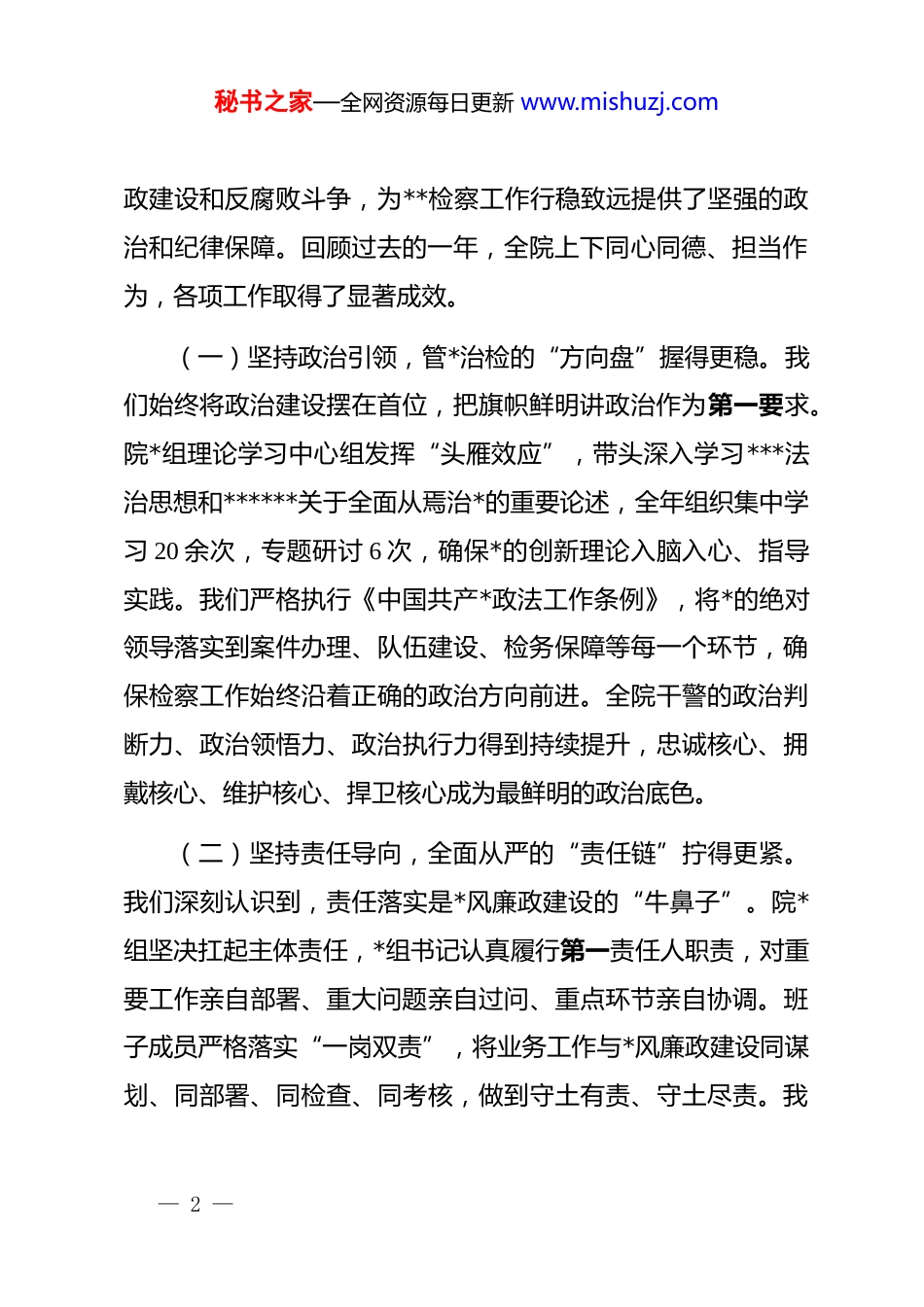 秘书之家—全网资源每日更新 www.mishuzj.com在县人民检察院 2025 年度*风廉政建设工作总结会上的讲话同志们:今天,我们在这里召开 2025 年度全院*风廉政建设工作总结会,主要任务是深入学习贯彻*的二十大及二十届历次全会精神,全面总结回顾我院一年来的*风廉政建设和反腐败工作,深刻分析当前面临的形势和挑战,研究部署 2026 年的重点任务。这既是一次回顾过去、总结经验的“盘点会”,也是一次正视问题、剖析不足的“分析会”,更是一次明确方向、加压奋进的“动员会”。下面,我讲三点意见。一、肯定成绩,正视过往,深刻认识 2025 年*风廉政建设取得的新成效2025 年是全面贯彻落实*的二十大精神的关键之年,也是我院检察事业在高质量发展道路上砥砺前行的一年。院*组始终坚持以**************思想为指导,深刻领悟“两个确立”的决定性意义,坚决做到“两个维护”,将全面从严管*治检的战略方针贯穿于检察工作全过程、各方面,坚定不移地推进*风廉— 1 —秘书之家—全网资源每日更新 www.mishuzj.com政建设和反腐败斗争,为**检察工作行稳致远提供了坚强的政治和纪律保障。回顾过去的一年,全院上下同心同德、担当作为,各项工作取得了显著成效。(一)坚持政治引领,管*治检的“方向盘”握得更稳。我们始终将政治建设摆在首位,把旗帜鲜明讲政治作为第一要求。院*组理论学习中心组发挥“头雁效应”,带头深入学习***法治思想和******关于全面从焉治*的重要论述,全年组织集中学习 20 余次,专题研讨 6 次,确保*的创新理论入脑入心、指导实践。我们严格执行《中国共产*政法工作条例》,将*的绝对领导落实到案件办理、队伍建设、检务保障等每一个环节,确保检察工作始终沿着正确的政治方向前进。全院干警的政治判断力、政治领悟力、政治执行力得到持续提升,忠诚核心、拥戴核心、维护核心、捍卫核心成为最鲜明的政治底色。(二)坚持责任导向,全面从严的“责任链”拧得更紧。我们深刻认识到,责任落实是*风廉政建设的“牛鼻子”。院*组坚决扛起主体责任,*组书记认真履行第一责任人职责,对重要工作亲自部署、重大问题亲自过问、重点环节亲自协调。班子成员严格落实“一岗双责”,将业务工作与*风廉政建设同谋划、同部署、同检查、同考核,做到守土有责、守土尽责。我— 2 —秘书之家—全网资源每日更新 www.mishuzj.com们全力支持配合县派驻纪检组开展监督工作,主动接受监督,定期会商研判,形成了主体责任和监督责任贯通协同、一体推进的良好格局。各内设机构负责人也切实担负起本部门的廉政责任,层层传导压力,逐级压实责任,确保全面从严治*的要求在基层一线落地生根,无“中梗阻”、无“温差感”。(三)坚持标本兼治,纪律作风的“防护网”织得更密。作风建设永远在路上。我们持之以恒落实中央八项规定及其实施细则精神,对“四风”问题露头就打,坚决防止隐形变异、反弹回潮。我们以 dj 学习教育为契机,组织全院干警原原本本、逐章逐条学习新修订的《中国共产 dj 律处分条例》,让纪律规矩真正成为日常言行的衡量标尺。警示教育实现常态化、制度化,通过集中观看警示教育片、通报剖析反面典型案例、参观廉政教育基地等多种形式,用“身边事”警醒“身边人”,引导干警知敬畏、存戒惧、守底线。院内开设的“*风廉政专栏”,定期推送廉政文章、纪律要求和案例剖析,全年共更新信息 86条,实现了对全院干警的 100%覆盖,营造了崇廉尚洁的浓厚氛围。我们还持续深化防止干预司法“三个规定”的再学习、再教育,组织全院干警进行自查自纠,确保“逢问必录”成为一种行动自觉,坚决维护了司法公正和司法廉洁。— 3 —秘书之家—全网资源每日更新 www.mishuzj.com(四)坚持关口前移,权力运行的“风险点”控得更准。规范检察权运行是廉政风险防控的关键。我们立足检察工作实际,紧盯案件办理、项目管理、财务管理、选人用人等重点领域和关键环节,深入开展廉政风险隐患排查,精准识别出 25 个风险点,并逐一制定了务实管用的防控措施,形成了覆盖全面、责任明晰的廉政风险防控体系。充分发挥案件管理部门的流程监控、质量评查职能和检务...