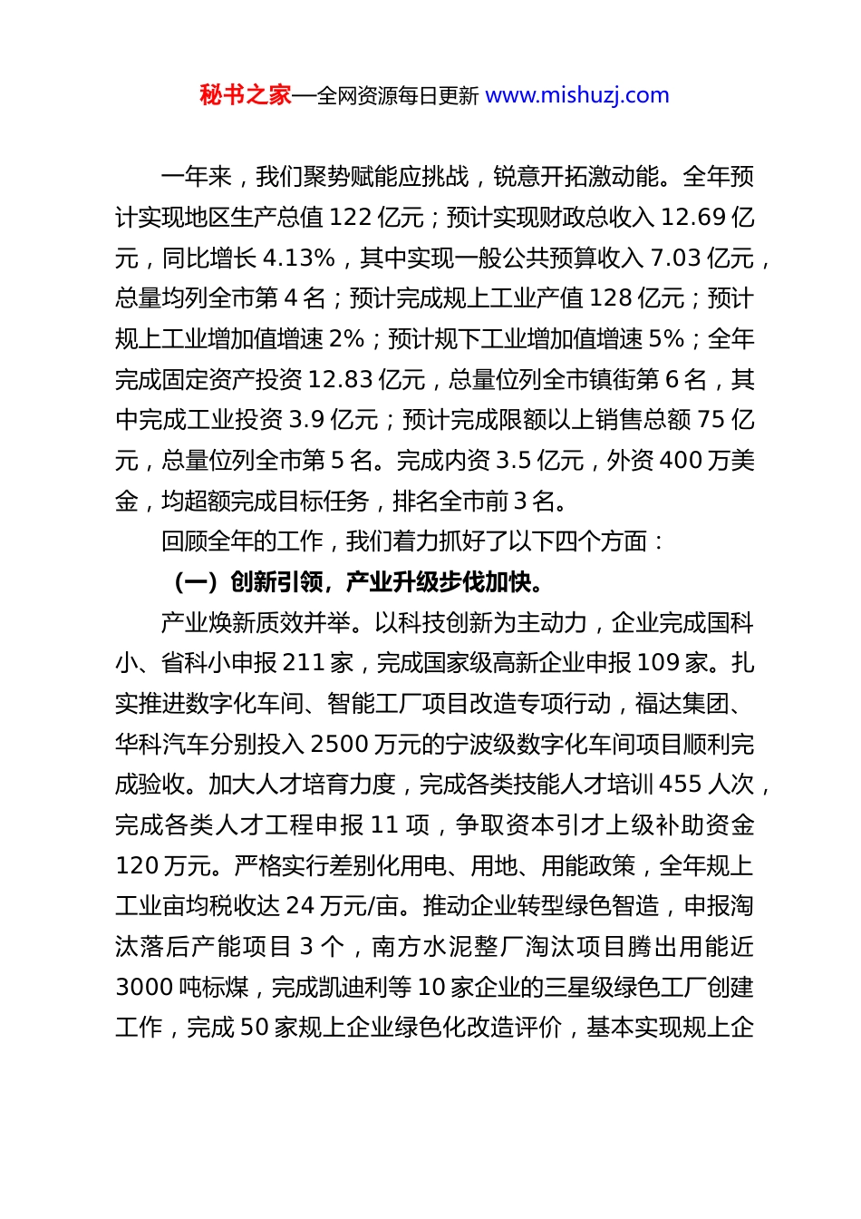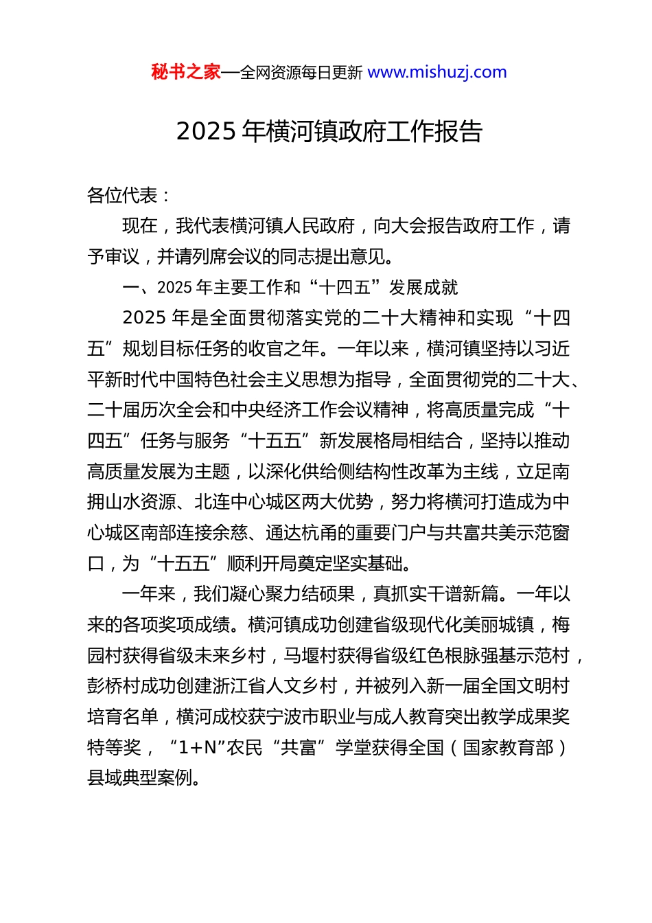 秘书之家—全网资源每日更新 www.mishuzj.com2025 年横河镇政府工作报告各位代表:现在,我代表横河镇人民政府,向大会报告政府工作,请予审议,并请列席会议的同志提出意见。一、2025 年主要工作和“十四五”发展成就2025 年是全面贯彻落实党的二十大精神和实现“十四五”规划目标任务的收官之年。一年以来,横河镇坚持以习近平新时代中国特色社会主义思想为指导,全面贯彻党的二十大、二十届历次全会和中央经济工作会议精神,将高质量完成“十四五”任务与服务“十五五”新发展格局相结合,坚持以推动高质量发展为主题,以深化供给侧结构性改革为主线,立足南拥山水资源、北连中心城区两大优势,努力将横河打造成为中心城区南部连接余慈、通达杭甬的重要门户与共富共美示范窗口,为“十五五”顺利开局奠定坚实基础。一年来,我们凝心聚力结硕果,真抓实干谱新篇。一年以来的各项奖项成绩。横河镇成功创建省级现代化美丽城镇,梅园村获得省级未来乡村,马堰村获得省级红色根脉强基示范村,彭桥村成功创建浙江省人文乡村,并被列入新一届全国文明村培育名单,横河成校获宁波市职业与成人教育突出教学成果奖特等奖,“1+N”农民“共富”学堂获得全国(国家教育部)县域典型案例。秘书之家—全网资源每日更新 www.mishuzj.com一年来,我们聚势赋能应挑战,锐意开拓激动能。全年预计实现地区生产总值 122 亿元;预计实现财政总收入 12.69 亿元,同比增长 4.13%,其中实现一般公共预算收入 7.03 亿元,总量均列全市第 4 名;预计完成规上工业产值 128 亿元;预计规上工业增加值增速 2%;预计规下工业增加值增速 5%;全年完成固定资产投资 12.83 亿元,总量位列全市镇街第 6 名,其中完成工业投资 3.9 亿元;预计完成限额以上销售总额 75 亿元,总量位列全市第 5 名。完成内资 3.5 亿元,外资 400 万美金,均超额完成目标任务,排名全市前 3 名。回顾全年的工作,我们着力抓好了以下四个方面:(一)创新引领,产业升级步伐加快。产业焕新质效并举。以科技创新为主动力,企业完成国科小、省科小申报 211 家,完成国家级高新企业申报 109 家。扎实推进数字化车间、智能工厂项目改造专项行动,福达集团、华科汽车分别投入 2500 万元的宁波级数字化车间项目顺利完成验收。加大人才培育力度,完成各类技能人才培训 455 人次,完成各类人才工程申报 11 项,争取资本引才上级补助资金120 万元。严格实行差别化用电、用地、用能政策,全年规上工业亩均税收达 24 万元/亩。推动企业转型绿色智造,申报淘汰落后产能项目 3 个,南方水泥整厂淘汰项目腾出用能近3000 吨标煤,完成凯迪利等 10 家企业的三星级绿色工厂创建工作,完成 50 家规上企业绿色化改造评价,基本实现规上企秘书之家—全网资源每日更新 www.mishuzj.com业绿色化改造全覆盖。乡村振兴共富同行。持续夯实农业发展基础,新建高标准农田 3347 亩,提前实现全域覆盖。拓展杨梅销售路径,开展杨梅专场直播,冷链快递发运杨梅超 45 万单,高端市场售价突破 300 元/公斤。加快推动农业产业现代化发展,成功申报宁波市现代设施农业项目 2 个,预计吸引民间资金 200 万元。聚焦乡村共富,东畈村文创服务中心项目和梅湖村保障性租赁住房项目历时 4 年全面竣工,预计两村村集体经济增收超 50万元,“乡村振兴重点帮促村”成功摘帽。立足乡村振兴,实施彭南村文化礼堂建设工程等农村综合改革项目 7 个,项目总投资 1813 万元,争取上级资金超 500 万元。着力培育农村人才队伍,新增各类涉农人才 427 名。服务优化动能培育。“双抓行动”全力推进,积极抢占新能源汽车赛道,华为“问界”汽车销售强劲,年销售额达 7 亿元,增速超 200%;“尚界”、理想、奇瑞等品牌顺利落户,“尊界、智界、享界”及马自达新能源品牌有序招引;高效利用原慈兴厂区 100 亩土地,前期基础设施投入超 3000 万元,引进优质汽车企业 2 家。农文旅融合项目扎实推进,舜祥酒业总投资近 9000 万元,四明虹生态农场已开园,销售公司装修收尾。梅园荀岙示范区一期“溪上茶咖”...