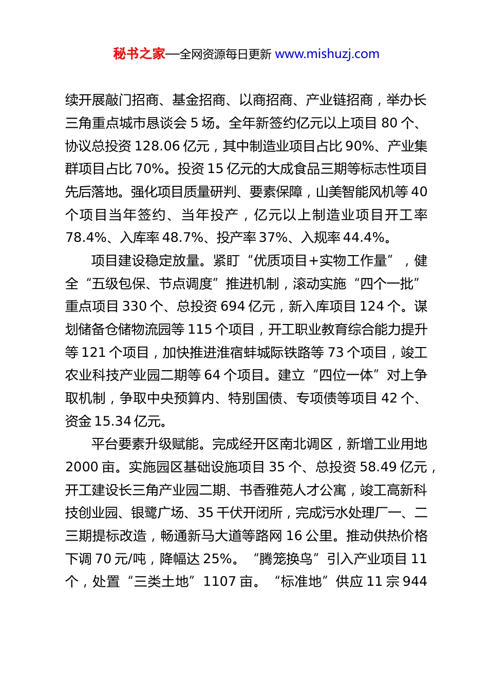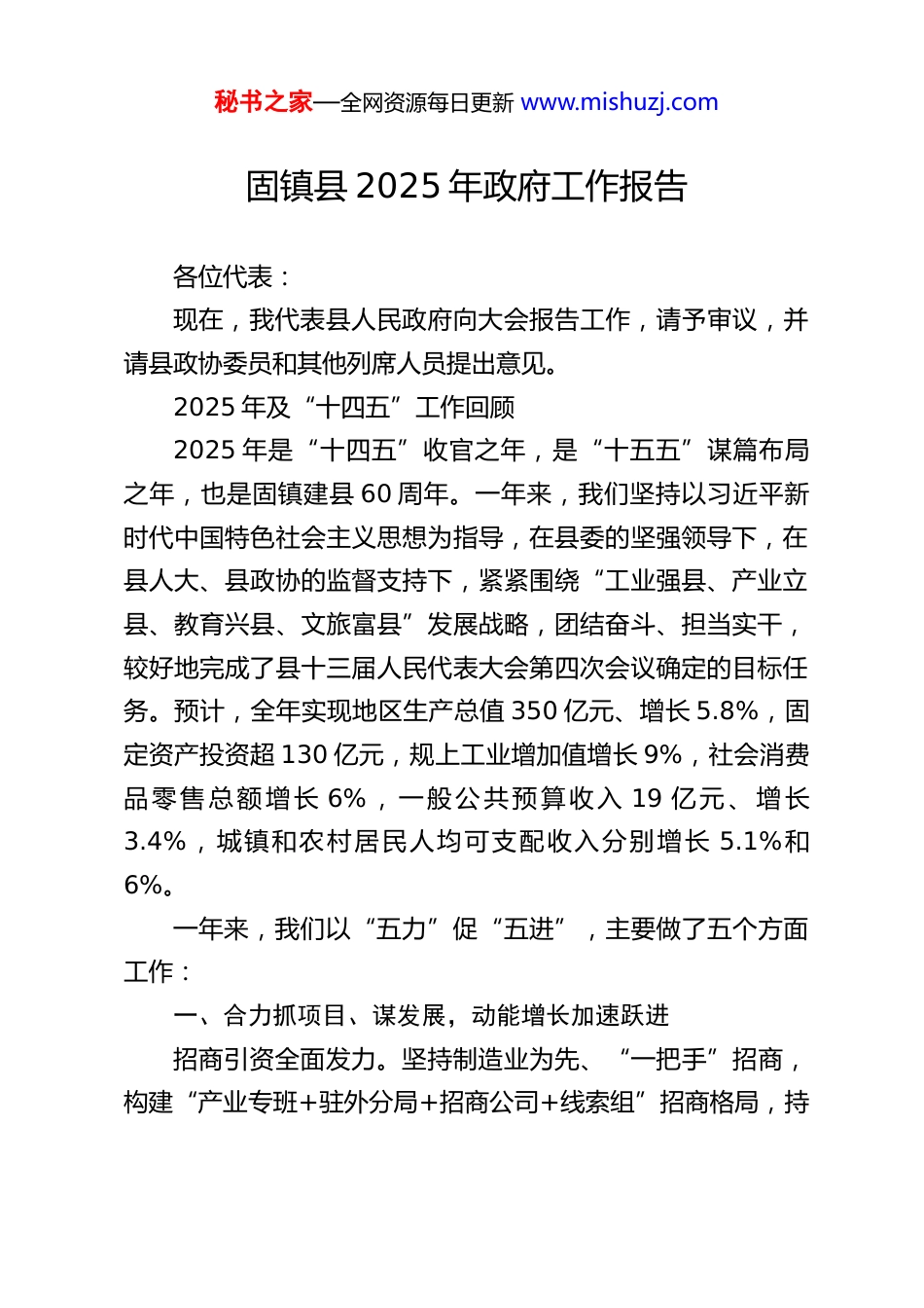 秘书之家—全网资源每日更新 www.mishuzj.com固镇县 2025 年政府工作报告各位代表:现在,我代表县人民政府向大会报告工作,请予审议,并请县政协委员和其他列席人员提出意见。2025 年及“十四五”工作回顾2025 年是“十四五”收官之年,是“十五五”谋篇布局之年,也是固镇建县 60 周年。一年来,我们坚持以习近平新时代中国特色社会主义思想为指导,在县委的坚强领导下,在县人大、县政协的监督支持下,紧紧围绕“工业强县、产业立县、教育兴县、文旅富县”发展战略,团结奋斗、担当实干,较好地完成了县十三届人民代表大会第四次会议确定的目标任务。预计,全年实现地区生产总值 350 亿元、增长 5.8%,固定资产投资超 130 亿元,规上工业增加值增长 9%,社会消费品零售总额增长 6%,一般公共预算收入 19 亿元、增长3.4%,城镇和农村居民人均可支配收入分别增长 5.1%和6%。一年来,我们以“五力”促“五进”,主要做了五个方面工作:一、合力抓项目、谋发展,动能增长加速跃进招商引资全面发力。坚持制造业为先、“一把手”招商,构建“产业专班+驻外分局+招商公司+线索组”招商格局,持秘书之家—全网资源每日更新 www.mishuzj.com续开展敲门招商、基金招商、以商招商、产业链招商,举办长三角重点城市恳谈会 5 场。全年新签约亿元以上项目 80 个、协议总投资 128.06 亿元,其中制造业项目占比 90%、产业集群项目占比 70%。投资 15 亿元的大成食品三期等标志性项目先后落地。强化项目质量研判、要素保障,山美智能风机等 40个项目当年签约、当年投产,亿元以上制造业项目开工率78.4%、入库率 48.7%、投产率 37%、入规率 44.4%。项目建设稳定放量。紧盯“优质项目+实物工作量”,健全“五级包保、节点调度”推进机制,滚动实施“四个一批”重点项目 330 个、总投资 694 亿元,新入库项目 124 个。谋划储备仓储物流园等 115 个项目,开工职业教育综合能力提升等 121 个项目,加快推进淮宿蚌城际铁路等 73 个项目,竣工农业科技产业园二期等 64 个项目。建立“四位一体”对上争取机制,争取中央预算内、特别国债、专项债等项目 42 个、资金 15.34 亿元。平台要素升级赋能。完成经开区南北调区,新增工业用地2000 亩。实施园区基础设施项目 35 个、总投资 58.49 亿元,开工建设长三角产业园二期、书香雅苑人才公寓,竣工高新科技创业园、银鹭广场、35 千伏开闭所,完成污水处理厂一、二三期提标改造,畅通新马大道等路网 16 公里。推动供热价格下调 70 元/吨,降幅达 25%。“腾笼换鸟”引入产业项目 11个,处置“三类土地”1107 亩。“标准地”供应 11 宗 944秘书之家—全网资源每日更新 www.mishuzj.com亩,“交地即交证”100%。宇格明叶项目“四证齐发”,实现首例“拿地即开工”。二、聚力抓工业、强实体,产业培塑齐头并进工业强县稳步起势。聚焦打造百亿级产业、十亿级企业,新增规上工业企业 27 家,工业总产值突破 210 亿元,规上工业增加值增长 9%。生物化工、绿色食品优势产业产值分别达到 70 亿元、98 亿元,新能源汽车及零部件、高端装备制造产业产值分别增长 30%、5%。争取设备更新国债及制造强省强市项目 162 个、资金 3973.61 万元,牵引工业投资 47.5 亿元、技改投资 29 亿元。安固高科、吉孚力多孔碳等 15 个亿元以上项目竣工。全面答好科技创新“47 问”,着力推进 134 项破题举措。丰原生物新材料获评省级企业研发中心,聚乳酸获批省重点产业链标志性产品,贝甲保温板材获省首批次新材料认定,生物基聚合材料产业集群入选省级中小企业特色产业集群、全市唯一。文旅富县蓄势勃发。入选安徽省“当景区邂逅非遗”典型案例,获评省研学旅游基地品质提升试点县。谷阳城遗址公园、国防教育研学基地上榜“皖美消费”新场景名单。建成投用垓下遗址博物馆、楚汉文化体验馆、戎马归来民宿,纳入“春学江淮 研读安徽”精品线路。谷阳城遗址、县博物馆入选全省研学旅游基地品质提升试点单位。“四季四节”持续火热,谷阳供销大集、刘集哪吒闹海、连城荷花美食季多点开花,九湾入...