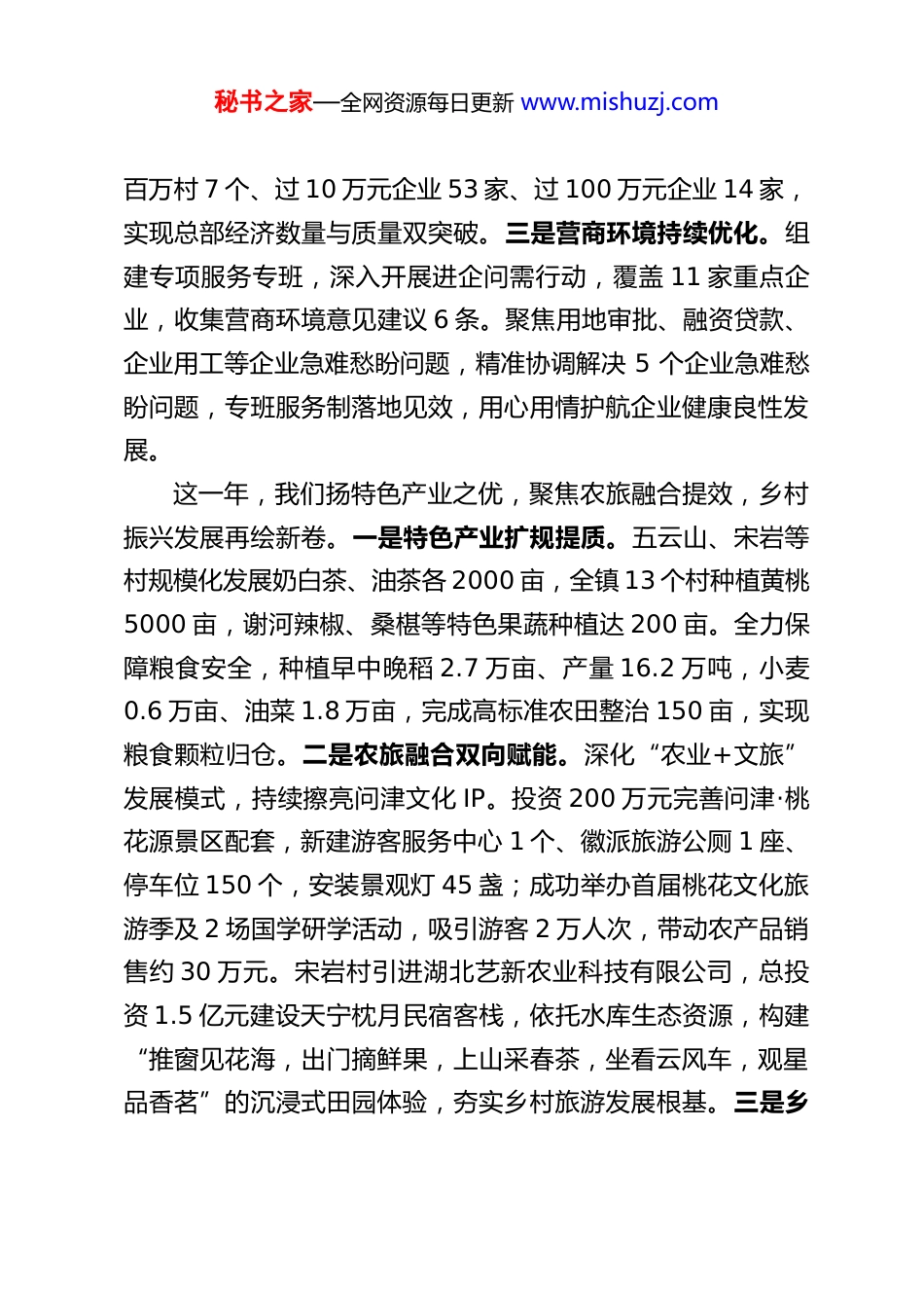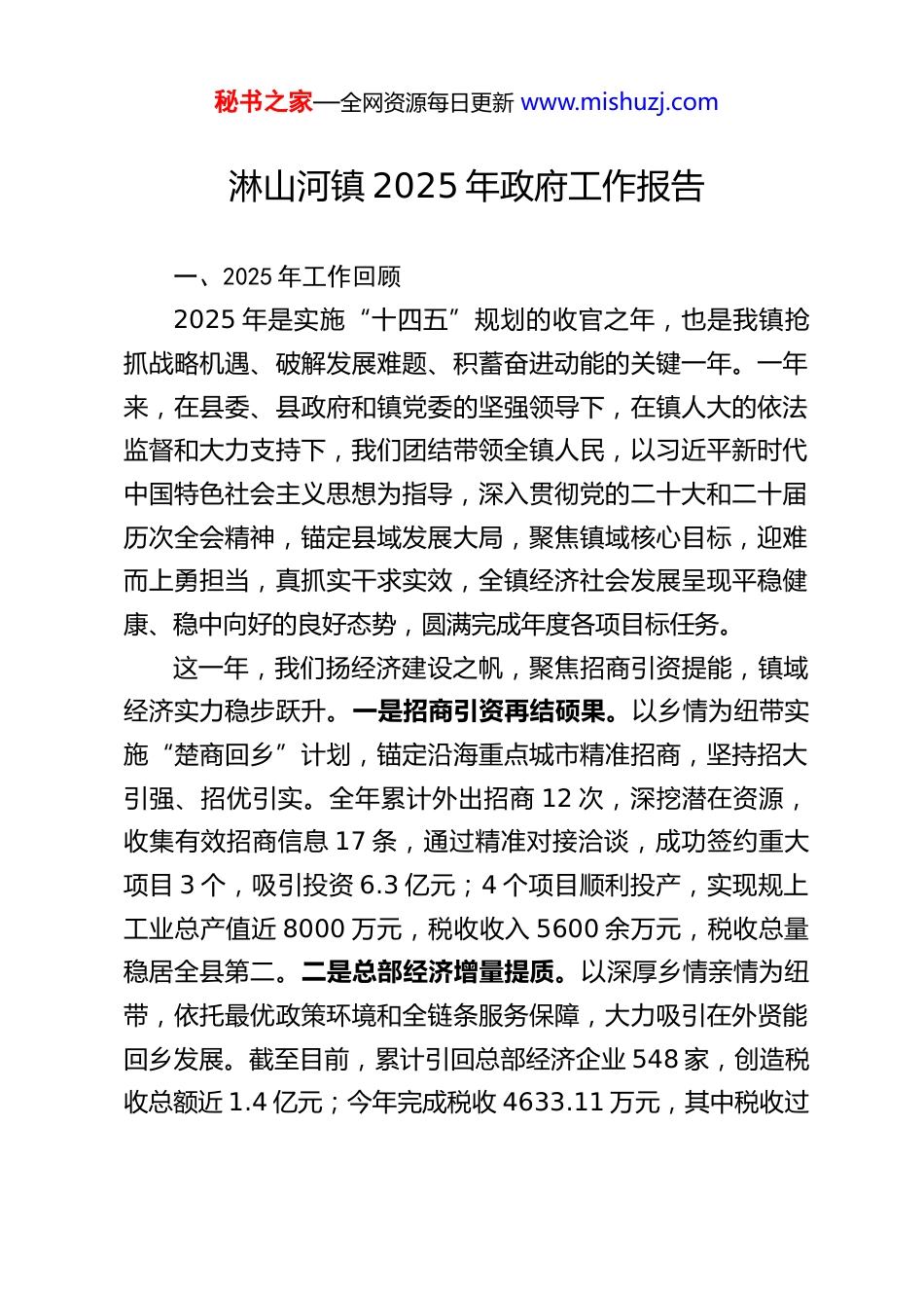 秘书之家—全网资源每日更新 www.mishuzj.com淋山河镇 2025 年政府工作报告一、2025 年工作回顾2025 年是实施“十四五”规划的收官之年,也是我镇抢抓战略机遇、破解发展难题、积蓄奋进动能的关键一年。一年来,在县委、县政府和镇党委的坚强领导下,在镇人大的依法监督和大力支持下,我们团结带领全镇人民,以习近平新时代中国特色社会主义思想为指导,深入贯彻党的二十大和二十届历次全会精神,锚定县域发展大局,聚焦镇域核心目标,迎难而上勇担当,真抓实干求实效,全镇经济社会发展呈现平稳健康、稳中向好的良好态势,圆满完成年度各项目标任务。这一年,我们扬经济建设之帆,聚焦招商引资提能,镇域经济实力稳步跃升。一是招商引资再结硕果。以乡情为纽带实施“楚商回乡”计划,锚定沿海重点城市精准招商,坚持招大引强、招优引实。全年累计外出招商 12 次,深挖潜在资源,收集有效招商信息 17 条,通过精准对接洽谈,成功签约重大项目 3 个,吸引投资 6.3 亿元;4 个项目顺利投产,实现规上工业总产值近 8000 万元,税收收入 5600 余万元,税收总量稳居全县第二。二是总部经济增量提质。以深厚乡情亲情为纽带,依托最优政策环境和全链条服务保障,大力吸引在外贤能回乡发展。截至目前,累计引回总部经济企业 548 家,创造税收总额近 1.4 亿元;今年完成税收 4633.11 万元,其中税收过秘书之家—全网资源每日更新 www.mishuzj.com百万村 7 个、过 10 万元企业 53 家、过 100 万元企业 14 家,实现总部经济数量与质量双突破。三是营商环境持续优化。组建专项服务专班,深入开展进企问需行动,覆盖 11 家重点企业,收集营商环境意见建议 6 条。聚焦用地审批、融资贷款、企业用工等企业急难愁盼问题,精准协调解决 5 个企业急难愁盼问题,专班服务制落地见效,用心用情护航企业健康良性发展。这一年,我们扬特色产业之优,聚焦农旅融合提效,乡村振兴发展再绘新卷。一是特色产业扩规提质。五云山、宋岩等村规模化发展奶白茶、油茶各 2000 亩,全镇 13 个村种植黄桃5000 亩,谢河辣椒、桑椹等特色果蔬种植达 200 亩。全力保障粮食安全,种植早中晚稻 2.7 万亩、产量 16.2 万吨,小麦0.6 万亩、油菜 1.8 万亩,完成高标准农田整治 150 亩,实现粮食颗粒归仓。二是农旅融合双向赋能。深化“农业+文旅”发展模式,持续擦亮问津文化 IP。投资 200 万元完善问津·桃花源景区配套,新建游客服务中心 1 个、徽派旅游公厕 1 座、停车位 150 个,安装景观灯 45 盏;成功举办首届桃花文化旅游季及 2 场国学研学活动,吸引游客 2 万人次,带动农产品销售约 30 万元。宋岩村引进湖北艺新农业科技有限公司,总投资 1.5 亿元建设天宁枕月民宿客栈,依托水库生态资源,构建“推窗见花海,出门摘鲜果,上山采春茶,坐看云风车,观星品香茗”的沉浸式田园体验,夯实乡村旅游发展根基。三是乡秘书之家—全网资源每日更新 www.mishuzj.com村振兴成效显著。成功获批 2025 年乡村振兴项目 57 个、资金 2000 余万元,紧扣“村容整洁、立面美观、规划有序、红色传承”主基调打造示范村,推进五云山片区“一村一示范湾组”建设,持续提升群众幸福感。这一年,我们扬基层共治之力,聚焦环境整治提级,镇域生态底色愈发靓丽。一是生态环境保护持续向好。全面落实河湖长制,完成退垸还湖 276 亩,黄毛咀湖、刘家垱湖退出劣五类水行列;严格落实林长制,完成国家森林可持续经营项目980 亩,扎实推进生态修复和松材线虫病防控。依托 5G+平台和村级摄像头,实现秸秆禁烧、森林防火全天候可视化监管;强化饮用水源地保护、畜禽养殖污染防治、黑臭水体整治,全域生态环境持续改善。二是集镇综合治理效能提升。投入 60万元打造新河堤一河两岸景观带,投入 50 万元升级改造集镇农贸市场,11 万元全面维修 5 个集镇公厕,100 万元新增垃圾车 4 台。同时,启动五云山大道高标准建设,常态化开展集镇街道整治,集镇面貌显著提升。三是农村人居环境整体跃升。投入 1200 万元打造程湾、宋岩、张岗 3 个和美乡村,...