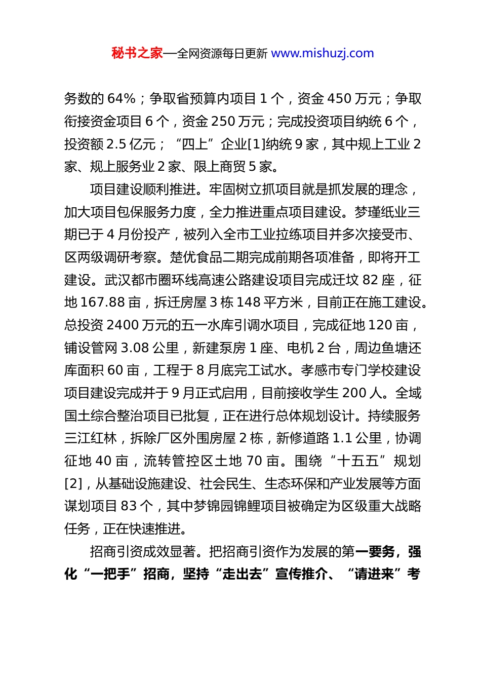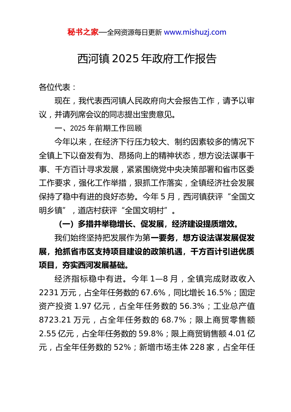 秘书之家—全网资源每日更新 www.mishuzj.com西河镇 2025 年政府工作报告各位代表:现在,我代表西河镇人民政府向大会报告工作,请予以审议,并请列席会议的同志提出宝贵意见。一、2025 年前期工作回顾今年以来,在经济下行压力较大、制约因素较多的情况下全镇上下以奋发有为、昂扬向上的精神状态,想方设法谋事干事、千方百计寻求发展,紧紧围绕党中央决策部署和省市区委工作要求,强化工作举措,狠抓工作落实,全镇经济社会发展保持了稳中有进的良好态势。今年 5 月,西河镇获评“全国文明乡镇”,道店村获评“全国文明村”。(一)多措并举稳增长、促发展,经济建设提质增效。我们始终坚持把发展作为第一要务,想方设法谋发展促发展,抢抓省市区支持项目建设的政策机遇,千方百计引进优质项目,夯实西河发展基础。经济指标稳中有进。今年 1—8 月,全镇完成财政收入2231 万元,占全年任务数的 67.6%,同比增长 16.5%;固定资产投资 1.97 亿元,占全年任务数的 56.3%;工业总产值8723.21 万元,占全年任务数的 68.7%;限上商贸零售额2.55 亿元,占全年任务数的 59.8%;限上商贸销售额 4.01 亿元,占全年任务数的 52%;新增市场主体 228 家,占全年任秘书之家—全网资源每日更新 www.mishuzj.com务数的 64%;争取省预算内项目 1 个,资金 450 万元;争取衔接资金项目 6 个,资金 250 万元;完成投资项目纳统 6 个,投资额 2.5 亿元;“四上”企业[1]纳统 9 家,其中规上工业 2家、规上服务业 2 家、限上商贸 5 家。项目建设顺利推进。牢固树立抓项目就是抓发展的理念,加大项目包保服务力度,全力推进重点项目建设。梦瑾纸业三期已于 4 月份投产,被列入全市工业拉练项目并多次接受市、区两级调研考察。楚优食品二期完成前期各项准备,即将开工建设。武汉都市圈环线高速公路建设项目完成迁坟 82 座,征地 167.88 亩,拆迁房屋 3 栋 148 平方米,目前正在施工建设。总投资 2400 万元的五一水库引调水项目,完成征地 120 亩,铺设管网 3.08 公里,新建泵房 1 座、电机 2 台,周边鱼塘还库面积 60 亩,工程于 8 月底完工试水。孝感市专门学校建设项目建设完成并于 9 月正式启用,目前接收学生 200 人。全域国土综合整治项目已批复,正在进行总体规划设计。持续服务三江红林,拆除厂区外围房屋 2 栋,新修道路 1.1 公里,协调征地 40 亩,流转管控区土地 70 亩。围绕“十五五”规划[2],从基础设施建设、社会民生、生态环保和产业发展等方面谋划项目 83 个,其中梦锦园锦鲤项目被确定为区级重大战略任务,正在快速推进。招商引资成效显著。把招商引资作为发展的第一要务,强化“一把手”招商,坚持“走出去”宣传推介、“请进来”考秘书之家—全网资源每日更新 www.mishuzj.com察对接,采取以商招商、亲情招商的方式,分期分批组织外出招商活动 4 次,接待外地客商来镇考察 5 次,签约项目 6 个,合同引资额 7 亿元,均落地开工。(二)上下联动聚合力、夯基础,乡村振兴高位推进。我们坚持把全面推进乡村振兴作为实现西河高质量发展的基础工程,严格落实“三个以”[3]工作路径,重点抓好“五个一”牵引性工作[4],加快打造“全省乡村振兴示范镇”。“万树村”创建初见成效。采取“三个结合”[5]的办法全面推进创建工作。截至目前,完成了道店村、五桂村、前进村、胜利村 4 个村的创建任务,累计栽种苗木 6.5 万棵,占全年任务的 80%。龙河村、翟岗新村 2 个村正在建设中,计划栽种苗木 3 万棵。人居环境整治难中有成。坚持按照“三个一”[6]推进人居环境整治,对西河村西刘湾、道店村秦家松林、前进村后陡坡、红林新村朱家岗等 15 个自然湾开展了人居环境整治工作,其中前进村后陡坡整治成效明显,群众满意度较高。截至目前,全镇累计完成了 53 个自然湾的整治任务,占人口集中保留湾的 2/3 以上。土地流失整改持续发力。采取统筹谋划、分类施策、压茬推进的总体思路,全力以赴推进耕地恢复工作。坚持先易后难的整治策略,按照“协调-清表-复垦-上图”的步骤压茬推进,...