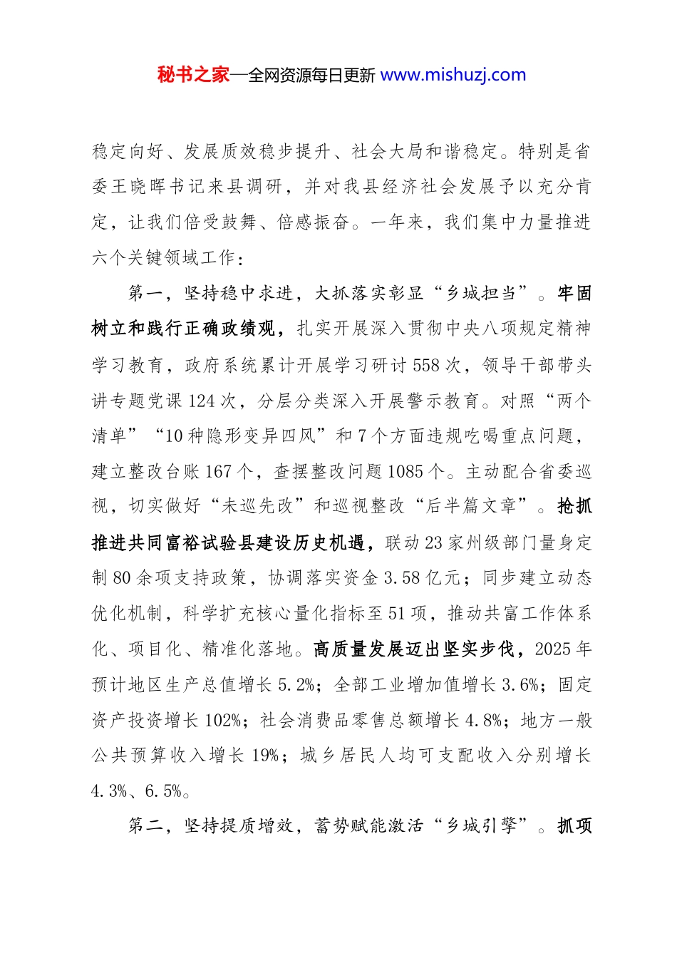 秘书之家—全网资源每日更新 www.mishuzj.com乡城县十五届人大五次会议材料之一政 府 工 作 报 告(2026 年 1 月 8 日在乡城县第十五届人民代表大会第五次会议上)乡城县人民政府县长 尼玛西日各位代表:现在,我代表县人民政府,向大会报告工作,请予审议,并请县政协委员和列席会议的同志提出意见。一、2025 年工作回顾和“十四五”发展主要成就过去的 2025 年,既是承载“十四五”圆满收官重任的一年,又是肩负“十五五”谋篇布局使命的一年。面对严峻复杂的外部形势和多重困难挑战,我们坚持以习近平新时代中国特色社会主义思想为指导,在县委的坚强领导下,在县人大和县政协的监督支持下,紧扣县委“12563”总体工作格局,凝心聚力拼经济、攻坚克难补短板、创新创造求突破,全县经济运行秘书之家—全网资源每日更新 www.mishuzj.com稳定向好、发展质效稳步提升、社会大局和谐稳定。特别是省委王晓晖书记来县调研,并对我县经济社会发展予以充分肯定,让我们倍受鼓舞、倍感振奋。一年来,我们集中力量推进六个关键领域工作:第一,坚持稳中求进,大抓落实彰显“乡城担当”。牢固树立和践行正确政绩观,扎实开展深入贯彻中央八项规定精神学习教育,政府系统累计开展学习研讨 558 次,领导干部带头讲专题党课 124 次,分层分类深入开展警示教育。对照“两个清单”“10 种隐形变异四风”和 7 个方面违规吃喝重点问题,建立整改台账 167 个,查摆整改问题 1085 个。主动配合省委巡视,切实做好“未巡先改”和巡视整改“后半篇文章”。抢抓推进共同富裕试验县建设历史机遇,联动 23 家州级部门量身定制 80 余项支持政策,协调落实资金 3.58 亿元;同步建立动态优化机制,科学扩充核心量化指标至 51 项,推动共富工作体系化、项目化、精准化落地。高质量发展迈出坚实步伐,2025 年预计地区生产总值增长 5.2%;全部工业增加值增长 3.6%;固定资产投资增长 102%;社会消费品零售总额增长 4.8%;地方一般公共预算收入增长 19%;城乡居民人均可支配收入分别增长4.3%、6.5%。第二,坚持提质增效,蓄势赋能激活“乡城引擎”。抓项秘书之家—全网资源每日更新 www.mishuzj.com目,聚焦国省重大战略部署,精心谋划储备 115 个,总投资 132亿元。S460 绕城段公路、青德乡村振兴示范项目等一批州县重大项目全速推进,年度完成投资 17.8 亿元。“十五五”规划,谋划重大基础设施项目 295 个,总投资 248 亿元。强营商,持续优化营商环境,全年招商引资到位资金 8 亿元,新增市场主体 2694 户,主动兑现减税降费及退税 6492 万元,出口总额达2000 万元。促转型,加速推进乡城建德、乡城泸县“飞地”产业园区建设,无缝衔接甘眉园区项目招引推动。成立乡城粮油公司建德分公司,扩大对外合作平台。成立乡城数智科技有限公司,“中高原无人机试飞基地+培训基地”项目顺利通过省级评审,创新推出“松茸 12 小时鲜达成都”物流模式,拓宽低空经济+数字建设新赛道。第三,坚持强链扩群,争先干劲打造“乡城特色”。全域旅游“出圈”,聚焦大香格里拉文旅协作体系建设,深耕“田园白藏房·净土香巴拉”品牌,推出“七湖徒步”等 7 条特色线路,在丽江、成都等地举办 4 场旅游推介会,与四川旅游学院达成校地合作意向。圆满举办白色灌礼文化周,白藏房营造技艺入选省级非遗扩展项目,新发现文物点 19 处,新增“圣洁甘孜”品牌民宿 3 家。扎实推进智慧旅游,上线“一部手机游乡城”,打造“乡城猫局”IP,完善高德地图 5 处入境点位扎点秘书之家—全网资源每日更新 www.mishuzj.com播报。全年接待游客 65.2 万人次,实现旅游收入 7.17 亿元。有机农牧“出彩”,新增有机农产品 11 个、认证证书 9 张,认证面积达 9213 亩,年产值突破 6000 万元,成功入围全国首批、涉藏州县首个“质量认证服务强企强链强县有机融合试点”。荣获“中国藏鸡之乡”称号,“乡城藏猪”获评国家生态原产地保护产品。试点推广农业全程机械化 200 亩,全年粮食产量达 9917 吨。投用“光伏+牦牛”养殖基地,开工建设水洼藏猪扩繁基地和...
