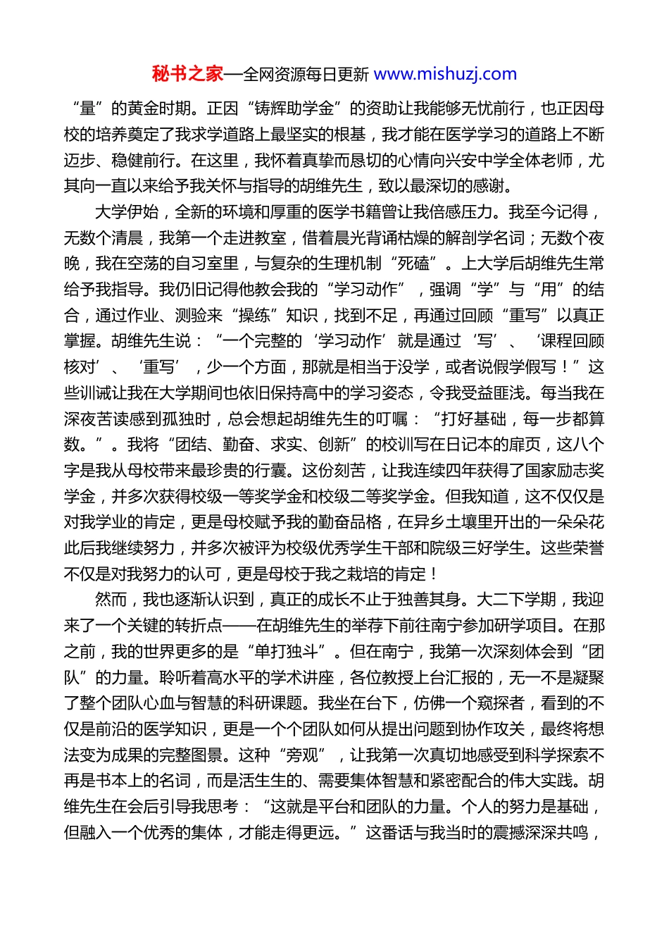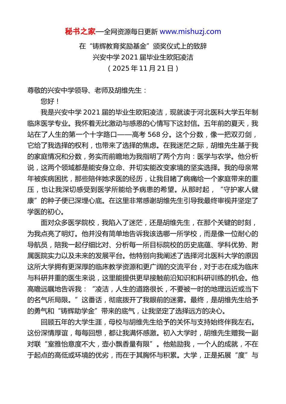 秘书之家—全网资源每日更新 www.mishuzj.com在“铸辉教育奖励基金”颁奖仪式上的致辞兴安中学 2021 届毕业生欧阳凌洁(2025 年 11 月 21 日)尊敬的兴安中学领导、老师及胡维先生:您好!我是兴安中学 2021 届的毕业生欧阳凌洁,现就读于河北医科大学五年制临床医学专业。我怀着无比激动与感恩的心情写下这封信。五年前的夏天,我站在了人生的第一个十字路口——高考 568 分。这个分数,像一把双刃剑,它给了我选择的权利,也带来了选择的焦虑。在我迷茫之际,胡维先生基于我的家庭情况和分数,务实而前瞻地为我指明了两个方向:医学与农学。他分析说,这两个领域都是能安身立命、并切实能改变家境的坚实选择。我的母亲常年被疾病困扰,那些陪伴她求医的经历,让我目睹了病痛给一个家庭带来的重压,也让我深切感受到医学所能给予病患的希望。从那时起,“守护家人健康”的种子便已深埋心底。在这里非常感谢胡维先生引导我最终审视并坚定了学医的初心。面对众多医学院校,我陷入了迷茫,还是胡维先生,在那个关键的时刻,为我点亮了明灯。他并没有简单地告诉我该选哪一所学校,而是像一位耐心的导航员,陪我一起仔细比对、分析每一所目标院校的历史底蕴、学科优势、附属医院实力以及未来的发展平台。他特别向我阐述了选择河北医科大学的原因这所大学拥有更深厚的临床教学资源和更广阔的交流平台,对于志在成为临床与科研并重的医生来说,这里能提供更早接触前沿知识和科研训练的机会。他高瞻远瞩地告诉我:“凌洁,人生的道路很长,不要被一时的地理远近或当下的名气所局限。”这番话,彻底拨开了我眼前的迷雾。最终,是胡维先生给予的勇气和“铸辉助学金”带来的底气,让我坚定了选择远方的决心。回顾五年的大学生涯,母校与胡维先生给予的关怀与支持始终伴我左右。这份深情厚谊,每每回想,都让我满怀感激。初入大学时,胡维先生赠我一副对联“室雅怡意度不大,壶小飘香量有限”。他勉励我,一个人的成就,不在于起点的高低或环境的优劣,而在于其胸怀与积累。大学,正是拓展“度”与秘书之家—全网资源每日更新 www.mishuzj.com“量”的黄金时期。正因“铸辉助学金”的资助让我能够无忧前行,也正因母校的培养奠定了我求学道路上最坚实的根基,我才能在医学学习的道路上不断迈步、稳健前行。在这里,我怀着真挚而恳切的心情向兴安中学全体老师,尤其向一直以来给予我关怀与指导的胡维先生,致以最深切的感谢。大学伊始,全新的环境和厚重的医学书籍曾让我倍感压力。我至今记得,无数个清晨,我第一个走进教室,借着晨光背诵枯燥的解剖学名词;无数个夜晚,我在空荡的自习室里,与复杂的生理机制“死磕”。上大学后胡维先生常给予我指导。我仍旧记得他教会我的“学习动作”,强调“学”与“用”的结合,通过作业、测验来“操练”知识,找到不足,再通过回顾“重写”以真正掌握。胡维先生说:“一个完整的‘学习动作’就是通过‘写’、‘课程回顾核对’、‘重写’,少一个方面,那就是相当于没学,或者说假学假写!”这些训诫让我在大学期间也依旧保持高中的学习姿态,令我受益匪浅。每当我在深夜苦读感到孤独时,总会想起胡维先生的叮嘱:“打好基础,每一步都算数。”。我将“团结、勤奋、求实、创新”的校训写在日记本的扉页,这八个字是我从母校带来最珍贵的行囊。这份刻苦,让我连续四年获得了国家励志奖学金,并多次获得校级一等奖学金和校级二等奖学金。但我知道,这不仅仅是对我学业的肯定,更是母校赋予我的勤奋品格,在异乡土壤里开出的一朵朵花此后我继续努力,并多次被评为校级优秀学生干部和院级三好学生。这些荣誉不仅是对我努力的认可,更是母校于我之栽培的肯定!然而,我也逐渐认识到,真正的成长不止于独善其身。大二下学期,我迎来了一个关键的转折点——在胡维先生的举荐下前往南宁参加研学项目。在那之前,我的世界更多的是“单打独斗”。但在南宁,我第一次深刻体会到“团队”的力量。聆听着高水平的学术讲座,各位教授上台汇报的,无一不是凝聚了整个团队心血与智慧的科研课题。我坐在台下,仿佛一个窥探者,看到的不仅是前沿的医学知识,更...
