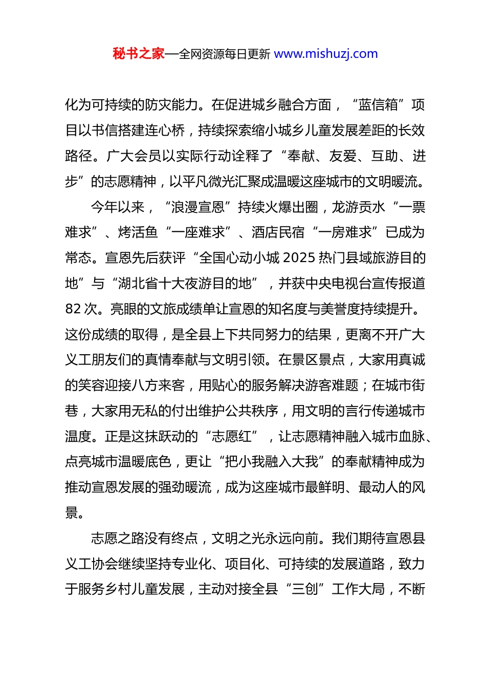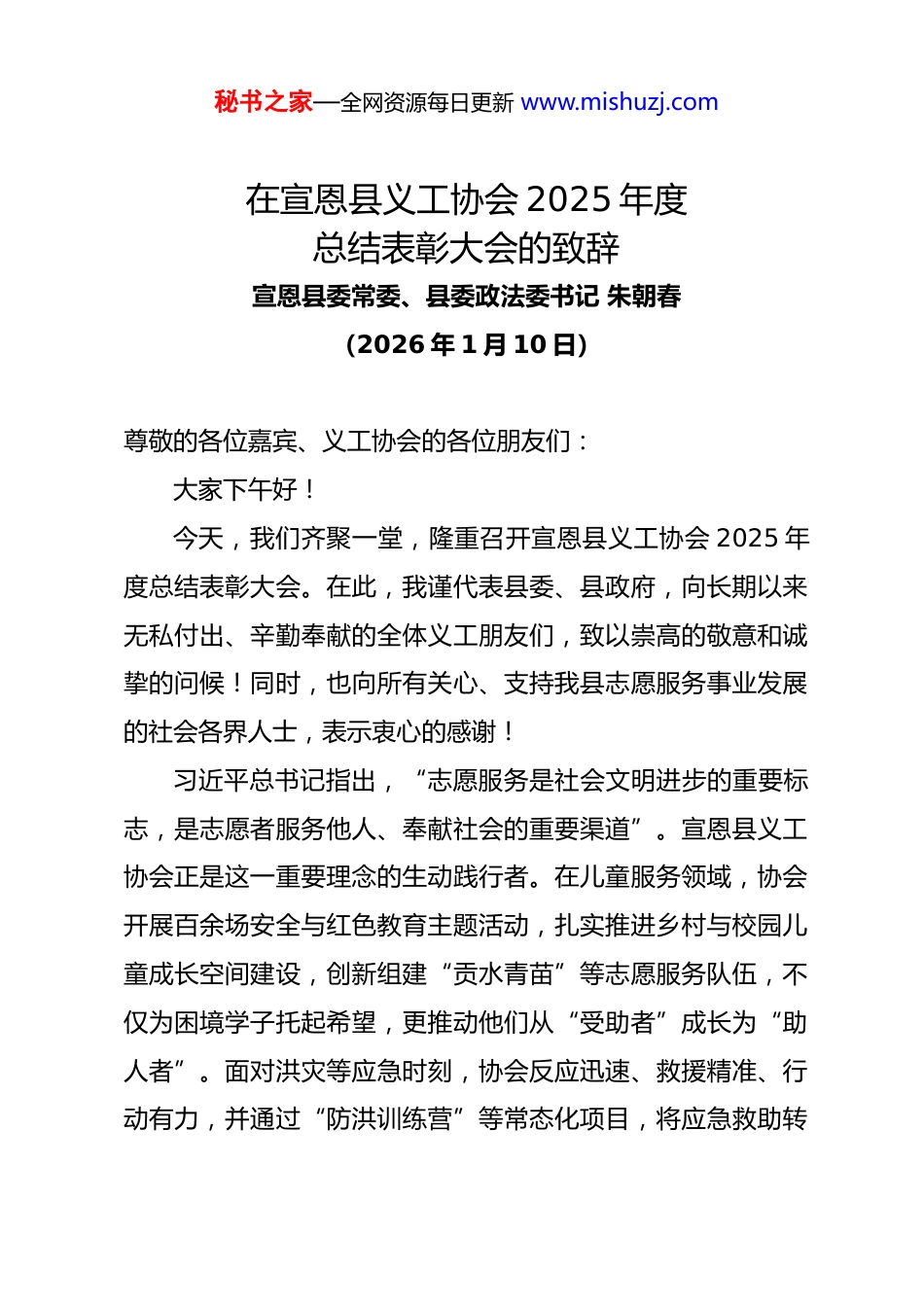 秘书之家—全网资源每日更新 www.mishuzj.com在宣恩县义工协会 2025 年度总结表彰大会的致辞宣恩县委常委、县委政法委书记 朱朝春(2026 年 1 月 10 日)尊敬的各位嘉宾、义工协会的各位朋友们:大家下午好!今天,我们齐聚一堂,隆重召开宣恩县义工协会 2025 年度总结表彰大会。在此,我谨代表县委、县政府,向长期以来无私付出、辛勤奉献的全体义工朋友们,致以崇高的敬意和诚挚的问候!同时,也向所有关心、支持我县志愿服务事业发展的社会各界人士,表示衷心的感谢!习近平总书记指出,“志愿服务是社会文明进步的重要标志,是志愿者服务他人、奉献社会的重要渠道”。宣恩县义工协会正是这一重要理念的生动践行者。在儿童服务领域,协会开展百余场安全与红色教育主题活动,扎实推进乡村与校园儿童成长空间建设,创新组建“贡水青苗”等志愿服务队伍,不仅为困境学子托起希望,更推动他们从“受助者”成长为“助人者”。面对洪灾等应急时刻,协会反应迅速、救援精准、行动有力,并通过“防洪训练营”等常态化项目,将应急救助转秘书之家—全网资源每日更新 www.mishuzj.com化为可持续的防灾能力。在促进城乡融合方面,“蓝信箱”项目以书信搭建连心桥,持续探索缩小城乡儿童发展差距的长效路径。广大会员以实际行动诠释了“奉献、友爱、互助、进步”的志愿精神,以平凡微光汇聚成温暖这座城市的文明暖流。今年以来,“浪漫宣恩”持续火爆出圈,龙游贡水“一票难求”、烤活鱼“一座难求”、酒店民宿“一房难求”已成为常态。宣恩先后获评“全国心动小城 2025 热门县域旅游目的地”与“湖北省十大夜游目的地”,并获中央电视台宣传报道82 次。亮眼的文旅成绩单让宣恩的知名度与美誉度持续提升。这份成绩的取得,是全县上下共同努力的结果,更离不开广大义工朋友们的真情奉献与文明引领。在景区景点,大家用真诚的笑容迎接八方来客,用贴心的服务解决游客难题;在城市街巷,大家用无私的付出维护公共秩序,用文明的言行传递城市温度。正是这抹跃动的“志愿红”,让志愿精神融入城市血脉、点亮城市温暖底色,更让“把小我融入大我”的奉献精神成为推动宣恩发展的强劲暖流,成为这座城市最鲜明、最动人的风景。志愿之路没有终点,文明之光永远向前。我们期待宣恩县义工协会继续坚持专业化、项目化、可持续的发展道路,致力于服务乡村儿童发展,主动对接全县“三创”工作大局,不断秘书之家—全网资源每日更新 www.mishuzj.com打造特色鲜明、影响广泛的志愿服务品牌。同时,也希望协会进一步发挥桥梁纽带作用,汇聚更多社会力量与爱心资源,让每一份善意汇聚成推动宣恩高质量发展的强大合力。最后,衷心祝愿宣恩县义工协会事业蒸蒸日上、越办越好祝愿全体义工朋友们及在场各位身体健康、工作顺利、阖家幸福、万事顺意!谢谢大家!