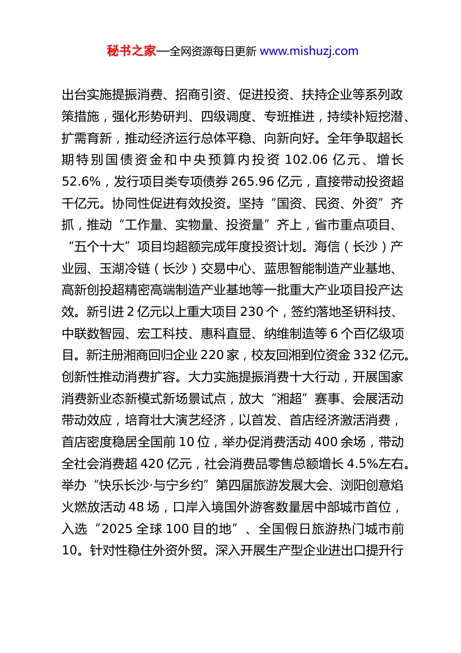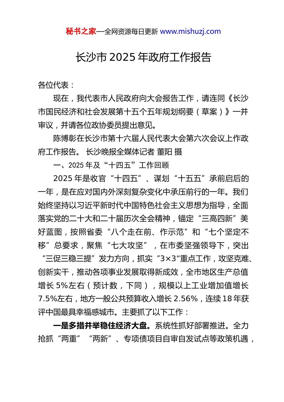 秘书之家—全网资源每日更新 www.mishuzj.com长沙市 2025 年政府工作报告各位代表:现在,我代表市人民政府向大会报告工作,请连同《长沙市国民经济和社会发展第十五个五年规划纲要(草案)》一并审议,并请各位政协委员提出意见。陈博彰在长沙市第十六届人民代表大会第六次会议上作政府工作报告。 长沙晚报全媒体记者 董阳 摄一、2025 年及“十四五”工作回顾2025 年是收官“十四五”、谋划“十五五”承前启后的一年,是在应对国内外深刻复杂变化中承压前行的一年。我们始终坚持以习近平新时代中国特色社会主义思想为指导,全面落实党的二十大和二十届历次全会精神,锚定“三高四新”美好蓝图,按照省委“八个走在前、作示范”和“七个坚定不移”总要求,聚焦“七大攻坚”,在市委坚强领导下,突出“三促三稳三提”发力方向,抓实“3×3”重点工作,攻坚克难、创新实干,推动各项事业发展取得新成效,全市地区生产总值增长 5%左右(预计数,下同),规模以上工业增加值增长7.5%左右,地方一般公共预算收入增长 2.56%,连续 18 年获评中国最具幸福感城市。主要抓了以下工作:一是多措并举稳住经济大盘。系统性抓好部署推进。全力抢抓“两重”“两新”、专项债项目自审自发试点等政策机遇,秘书之家—全网资源每日更新 www.mishuzj.com出台实施提振消费、招商引资、促进投资、扶持企业等系列政策措施,强化形势研判、四级调度、专班推进,持续补短挖潜、扩需育新,推动经济运行总体平稳、向新向好。全年争取超长期 特 别 国 债 资 金 和 中 央 预 算 内 投 资 102.06 亿 元 、 增 长52.6%,发行项目类专项债券 265.96 亿元,直接带动投资超千亿元。协同性促进有效投资。坚持“国资、民资、外资”齐抓,推动“工作量、实物量、投资量”齐上,省市重点项目、“五个十大”项目均超额完成年度投资计划。海信(长沙)产业园、玉湖冷链(长沙)交易中心、蓝思智能制造产业基地、高新创投超精密高端制造产业基地等一批重大产业项目投产达效。新引进 2 亿元以上重大项目 230 个,签约落地圣钘科技、中联数智园、宏工科技、惠科直显、纳维制造等 6 个百亿级项目。新注册湘商回归企业 220 家,校友回湘到位资金 332 亿元。创新性推动消费扩容。大力实施提振消费十大行动,开展国家消费新业态新模式新场景试点,放大“湘超”赛事、会展活动带动效应,培育壮大演艺经济,以首发、首店经济激活消费,首店密度稳居全国前 10 位,举办促消费活动 400 余场,带动全社会消费超 420 亿元,社会消费品零售总额增长 4.5%左右。举办“快乐长沙·与宁乡约”第四届旅游发展大会、浏阳创意焰火燃放活动 48 场,口岸入境国外游客数量居中部城市首位,入选“2025 全球 100 目的地”、全国假日旅游热门城市前10。针对性稳住外资外贸。深入开展生产型企业进出口提升行秘书之家—全网资源每日更新 www.mishuzj.com动,支持长沙优质产能和产品“走出去”,实际使用外资、对外实际投资分别增长 14.4%、30%,进出口总额增长 3%左右,总量占全省比重达 53%、创历史新高。其中对共建“一带一路 ” 国 家 、 RCEP 成 员 国 、 非 洲 国 家 贸 易 分 别 增 长11%、10.3%、45.3%,“新三样”产品出口增长 86.7%。二是深耕细作夯实产业根基。提质升级园区发展。深入推进园区制造业提升行动,抓实“两清单、两增量”工作机制,签 约 落 地 、 新 开 工 、 新 投 产 项 目 分 别 增 长59%、14%、36%,超额完成年度目标。园区规模以上工业总产值占全市 75%左右,园区制造业税收增长 7%左右。长沙高新区、长沙经开区连续 5 年上榜高质量发展百强园区,宁乡经开区、浏阳经开区再次上榜先进制造业百强园区,望城经开区再次上榜生物医药百强园区。持续壮大产业链群。坚持“一链一策”,深化“五长联动”,促进“五链融合”,工程机械产业集群入选世界级产业集群培育样本,检验检测仪器设备产业集群获评国家级中小企业特色产业集群,电子信息、先进能源材料产业分别增长 10%、22.9%,智能建造产值突破 2000亿元。“人工...