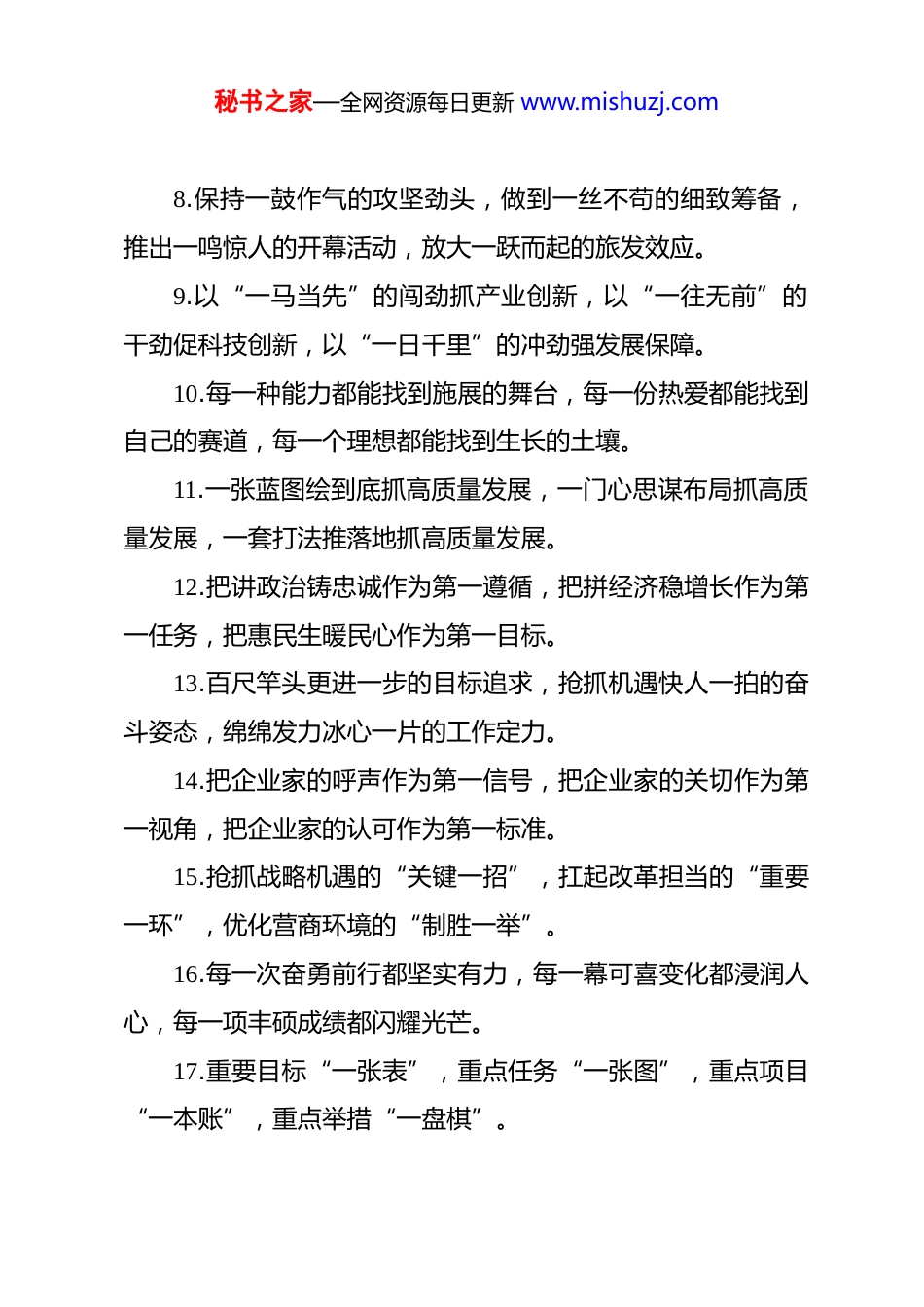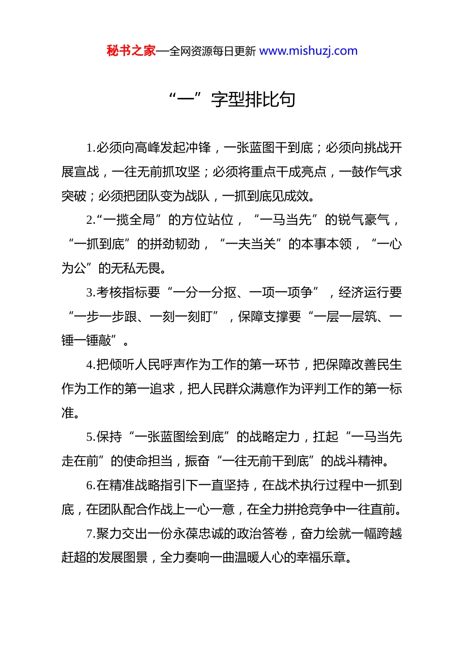 秘书之家—全网资源每日更新 www.mishuzj.com“一”字型排比句 1.必须向高峰发起冲锋,一张蓝图干到底;必须向挑战开展宣战,一往无前抓攻坚;必须将重点干成亮点,一鼓作气求突破;必须把团队变为战队,一抓到底见成效。2.“一揽全局”的方位站位,“一马当先”的锐气豪气,“一抓到底”的拼劲韧劲,“一夫当关”的本事本领,“一心为公”的无私无畏。3.考核指标要“一分一分抠、一项一项争”,经济运行要“一步一步跟、一刻一刻盯”,保障支撑要“一层一层筑、一锤一锤敲”。4.把倾听人民呼声作为工作的第一环节,把保障改善民生作为工作的第一追求,把人民群众满意作为评判工作的第一标准。5.保持“一张蓝图绘到底”的战略定力,扛起“一马当先走在前”的使命担当,振奋“一往无前干到底”的战斗精神。6.在精准战略指引下一直坚持,在战术执行过程中一抓到底,在团队配合作战上一心一意,在全力拼抢竞争中一往直前。7.聚力交出一份永葆忠诚的政治答卷,奋力绘就一幅跨越赶超的发展图景,全力奏响一曲温暖人心的幸福乐章。秘书之家—全网资源每日更新 www.mishuzj.com8.保持一鼓作气的攻坚劲头,做到一丝不苟的细致筹备,推出一鸣惊人的开幕活动,放大一跃而起的旅发效应。9.以“一马当先”的闯劲抓产业创新,以“一往无前”的干劲促科技创新,以“一日千里”的冲劲强发展保障。10.每一种能力都能找到施展的舞台,每一份热爱都能找到自己的赛道,每一个理想都能找到生长的土壤。11.一张蓝图绘到底抓高质量发展,一门心思谋布局抓高质量发展,一套打法推落地抓高质量发展。12.把讲政治铸忠诚作为第一遵循,把拼经济稳增长作为第一任务,把惠民生暖民心作为第一目标。13.百尺竿头更进一步的目标追求,抢抓机遇快人一拍的奋斗姿态,绵绵发力冰心一片的工作定力。14.把企业家的呼声作为第一信号,把企业家的关切作为第一视角,把企业家的认可作为第一标准。15.抢抓战略机遇的“关键一招”,扛起改革担当的“重要一环”,优化营商环境的“制胜一举”。16.每一次奋勇前行都坚实有力,每一幕可喜变化都浸润人心,每一项丰硕成绩都闪耀光芒。17.重要目标“一张表”,重点任务“一张图”,重点项目“一本账”,重点举措“一盘棋”。秘书之家—全网资源每日更新 www.mishuzj.com18.决不能有一丝的麻痹疏忽,决不能有一毫的侥幸幻想,决不能有一刻的拖延敷衍。19.一马当先的闯劲提速进位,一往无前的拼劲争先进位,一抓到底的狠劲赶超进位。20.以一严到底的决心抓整治,以一查到底的狠劲抓整治,以一贯到底的力度抓整治。21.一切任务超前推进,一切工作打造亮点,一切难题有解思维,一切计划末端落实。22.经济工作的“第一菜单”,领导干部的“第一责任”,绩效考核的“第一指标”。23.“一条心”干事业,“一盘棋”抓工作,“一股劲”促发展,“一条链”保落实。24.扩大开放的“第一窗口”,营商环境的“第一印象”,招商引资的“第一要素”。25.赢得了一场场大战大考,跨越了一个个难关险阻,谱写了一篇篇精彩华章。26.一个目标一个目标分解,一项任务一项任务执行,一个节点一个节点推进。27.事情一敲定就马上落实,工作一部署就马上动手,任务一完成就马上反馈。秘书之家—全网资源每日更新 www.mishuzj.com28.“一盘棋”全领域推进,“一张网”全要素保障,“一股劲”全过程落实。29.保持一流的精神状态,树立一流的工作标准,争创一流的发展业绩。30.风险排查一处不漏,防范措施一招不让,责任落实一点不空。31.悉心保护一片蓝天,精心呵护一川碧水,用心守护一方净土。32.一鼓作气全面推进,一丝不苟求精求效,一以贯之狠抓落实。33.把每一份文稿写实,把每一次协调做细,把每一个环节守牢。34.碰到困难时停一停,遭遇阻力时绕一绕,触及利益时等一等。35.一马当先的拼劲,一鼓作气的韧劲,一抓到底的狠劲。36.抓紧每一天时间,抓实每一项任务,抓好每一处细节。37.一刻不停抢政策,一招不让抢项目,一往无前争试点。38.一抓到底的狠劲,一以贯之的韧劲,一鼓作气的拼劲。39.一以贯之拼经济,一马当先抓改革,一刻不停促发展。40.一马当先勇破难,一往无前善创新,一以贯之抓落实。