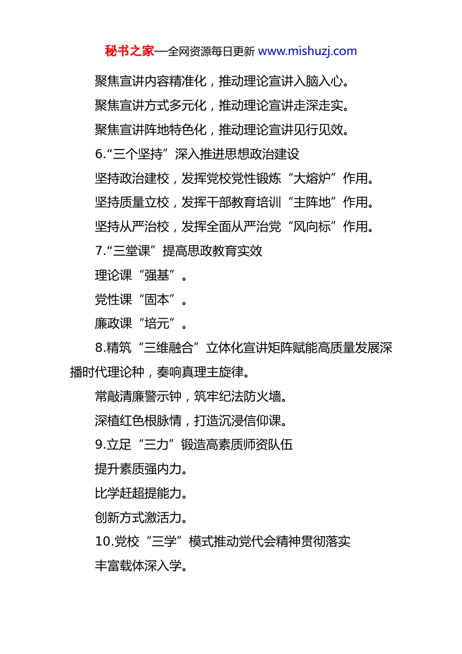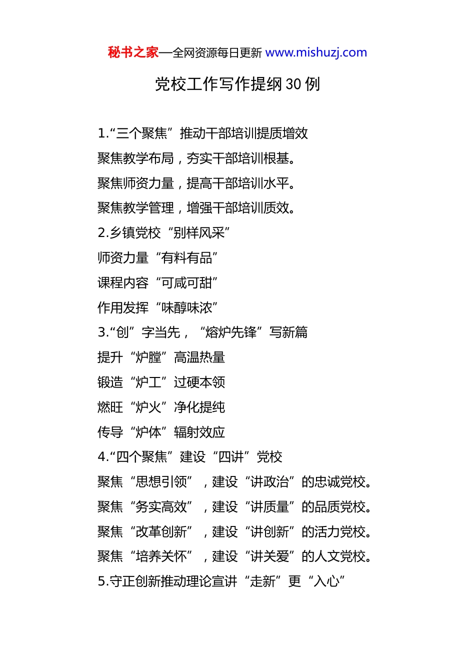秘书之家—全网资源每日更新 www.mishuzj.com党校工作写作提纲 30 例 1.“三个聚焦”推动干部培训提质增效聚焦教学布局,夯实干部培训根基。聚焦师资力量,提高干部培训水平。聚焦教学管理,增强干部培训质效。2.乡镇党校“别样风采”师资力量“有料有品”课程内容“可咸可甜”作用发挥“味醇味浓”3.“创”字当先,“熔炉先锋”写新篇提升“炉膛”高温热量锻造“炉工”过硬本领燃旺“炉火”净化提纯传导“炉体”辐射效应4.“四个聚焦”建设“四讲”党校聚焦“思想引领”,建设“讲政治”的忠诚党校。聚焦“务实高效”,建设“讲质量”的品质党校。聚焦“改革创新”,建设“讲创新”的活力党校。聚焦“培养关怀”,建设“讲关爱”的人文党校。5.守正创新推动理论宣讲“走新”更“入心”秘书之家—全网资源每日更新 www.mishuzj.com聚焦宣讲内容精准化,推动理论宣讲入脑入心。聚焦宣讲方式多元化,推动理论宣讲走深走实。聚焦宣讲阵地特色化,推动理论宣讲见行见效。6.“三个坚持”深入推进思想政治建设坚持政治建校,发挥党校党性锻炼“大熔炉”作用。坚持质量立校,发挥干部教育培训“主阵地”作用。坚持从严治校,发挥全面从严治党“风向标”作用。7.“三堂课”提高思政教育实效理论课“强基”。党性课“固本”。廉政课“培元”。8.精筑“三维融合”立体化宣讲矩阵赋能高质量发展深播时代理论种,奏响真理主旋律。常敲清廉警示钟,筑牢纪法防火墙。深植红色根脉情,打造沉浸信仰课。9.立足“三力”锻造高素质师资队伍提升素质强内力。比学赶超提能力。创新方式激活力。10.党校“三学”模式推动党代会精神贯彻落实丰富载体深入学。秘书之家—全网资源每日更新 www.mishuzj.com专题备课解读学。宣传带动广泛学。11.三常三抓推动“四坚定四摒弃”作风整治行动走深走实常学习,抓教育引导打“底子”。常警示,抓纪律规矩扣“扣子”。常检查,抓防微杜渐立“样子”。12.用好“四种”教学模式力促干部培训提质增效创新“讲座式”教学。组织“体验式”教学。开展“研讨式”教学。进行“实践式”教学。13.“三举措”持续提升教师能力素质以“学”为基本方式,增加教师理论储备。以“讲”为练兵平台,提高教师授课水平。以“研”为提升抓手,促进教师理论转化。14.“四项举措”提升干部教育培训实效聚焦一条主线,健全课程体系。创新教学方法,激发课堂活力。强基提能铸魂,淬炼专业本领。下足绣花功夫,打磨精品课程。秘书之家—全网资源每日更新 www.mishuzj.com15.“三举措”强化机关作风效能建设目标责任定岗定责。督查落实提能提效。分层分类抓早抓小。16.“五个红心”照亮“五型”机关底色红心向党,在打造“政治型”机关上立标杆。红心铸魂,在打造“学习型”机关上下真功。红心育才,在打造“服务型”机关上有温度。红心执教,在打造“创新型”机关上显特色。红心建家,在打造“活力型”机关上展形象。17.楼道变身“微党校”撬动社区“大治理”服务与治理相结合,打通为民服务路径。学习与示范相结合,营造红色文化氛围。普法与解难相结合,夯实平安建设基础。育人与养成相结合,打造筑梦未来平台。18.“三聚焦”着力提升干部培训质量聚焦主责主业,抓实干部教育。聚焦队伍建设,提升教学水平。聚焦方式创新,增强培训活力。19.“三个聚焦”推动干部教育培训工作提质增效聚焦多维度教学,创新教学培训形式。秘书之家—全网资源每日更新 www.mishuzj.com聚焦多元化师资,加强教师队伍建设。聚焦多举措管理,严格学员培训考核。20.上好“三堂课”提高思政教育实效理论课“强基”。党性课“固本”。廉政课“培元”。21.市委党校深入贯彻落实“四高四争先”推动理论和实践融合发展一是理论筑基,把牢核心要义。二是案例赋能,深化实践认知。三是研讨助力,凝聚发展共识。22.深入贯彻落实“四高四争先”战略部署奋力谱写中国式现代化**篇章锚定战略导向,构建课程体系多维互动赋能,提升培训实效强化思想引领,促进成果转化23.坚持“三抓三促”推动深入贯彻中央八项规定精神学习教育走深走实一是抓师资能力强基固本,促教学水平全面提升。二是抓课程质量从严把关,促育人效能...