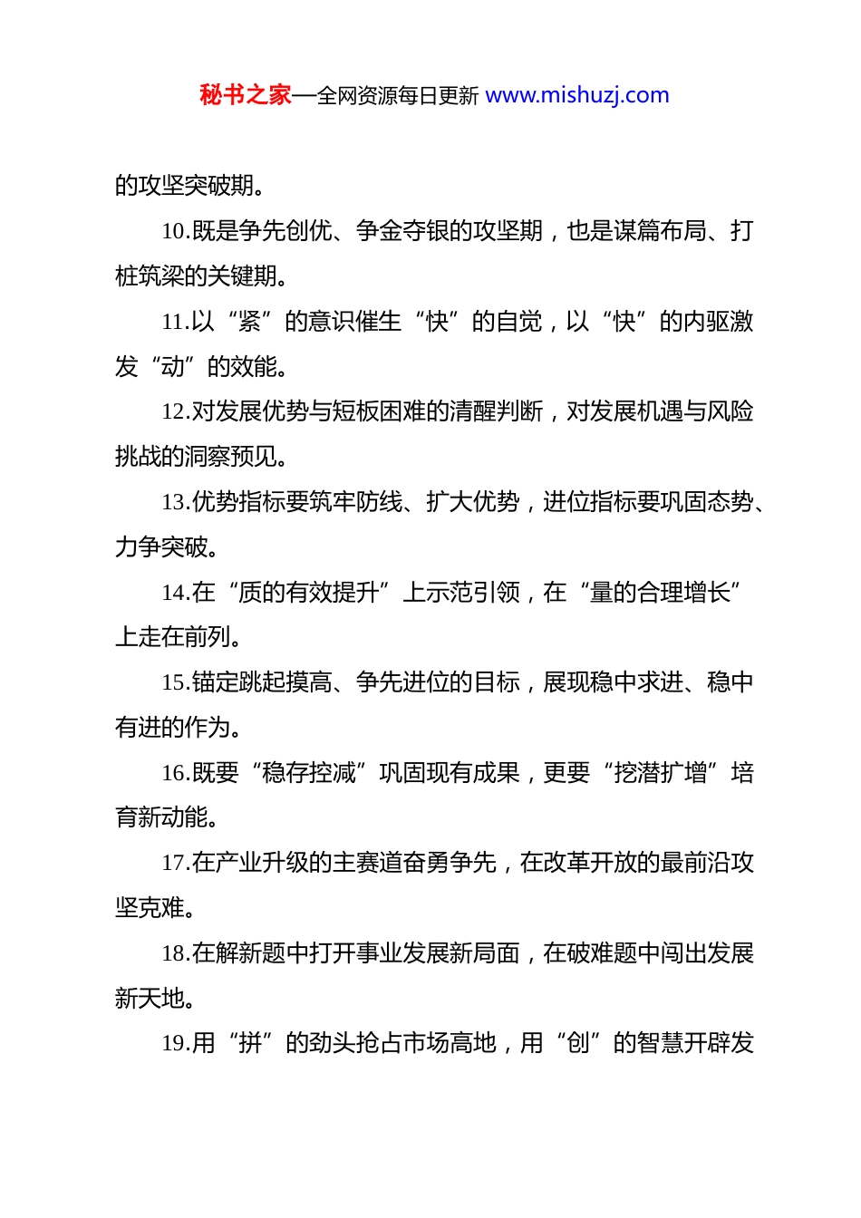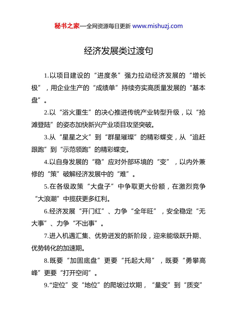 秘书之家—全网资源每日更新 www.mishuzj.com经济发展类过渡句 1.以项目建设的“进度条”强力拉动经济发展的“增长极”,用企业生产的“成绩单”持续夯实高质量发展的“基本盘”。2.以“浴火重生”的决心推进传统产业转型升级,以“抢滩登陆”的姿态加快新兴产业项目攻坚突破。3.从“星星之火”到“群星璀璨”的精彩蝶变,从“追赶跟跑”到“示范领跑”的精彩蝶变。4.以自身发展的“稳”应对外部环境的“变”,以内外兼修的“策”破解经济发展中的“难”。5.在各级政策“大盘子”中争取更大份额,在激烈竞争“大浪潮”中揽获更多红利。6.经济发展“开门红”、力争“全年旺”,安全稳定“无大事”、力争“不出事”。7.进入机遇汇集、优势迸发的新阶段,迎来能级跃升期、优势转化的加速期。8.既要“加固底盘”更要“托起大局”,既要“勇攀高峰”更要“打开空间”。9.“定位”变“地位”的爬坡过坎期,“量变”到“质变”秘书之家—全网资源每日更新 www.mishuzj.com的攻坚突破期。10.既是争先创优、争金夺银的攻坚期,也是谋篇布局、打桩筑梁的关键期。11.以“紧”的意识催生“快”的自觉,以“快”的内驱激发“动”的效能。12.对发展优势与短板困难的清醒判断,对发展机遇与风险挑战的洞察预见。13.优势指标要筑牢防线、扩大优势,进位指标要巩固态势、力争突破。14.在“质的有效提升”上示范引领,在“量的合理增长”上走在前列。15.锚定跳起摸高、争先进位的目标,展现稳中求进、稳中有进的作为。16.既要“稳存控减”巩固现有成果,更要“挖潜扩增”培育新动能。17.在产业升级的主赛道奋勇争先,在改革开放的最前沿攻坚克难。18.在解新题中打开事业发展新局面,在破难题中闯出发展新天地。19.用“拼”的劲头抢占市场高地,用“创”的智慧开辟发秘书之家—全网资源每日更新 www.mishuzj.com展新局。20.以“小场景”撬动“大创新”,以“大场景”培育“新产业”。21.把综合优势转化为发展胜势,把战略支撑转化为增量产出。22.在破解发展难题中展现作为,在推动转型升级中开创新局。23.把政策红利转化为发展动力,把政策增量转化为发展增量。24.以开拓之志破除发展藩篱,以系统思维构筑未来新格局。25.在融合中提升创新策源能力,在应用中加速成果产业化。26.经济分析看的是“真本事”,项目观摩比的是“硬作风”。27.在转化政策机遇上勇争先,在打造发展支撑上筑优势。28.以科技创新驱动产业升级,以产业需求倒逼技术突破。29.以创新思维破冰发展壁垒,以群众合力激活发展动能。30.“转”是产业跃迁的抉择,“进”是动能转换的突围。31.传统产业“老树发新芽”,新兴产业“盆景变风景”。32.优势是发展的“先手棋”,发展是优势的“放大器”。33.以“稳”更好地求“进”,以“进”更好的促“稳”。秘书之家—全网资源每日更新 www.mishuzj.com34.以产能之稳应市场之变,以供给之优搏发展之先。35.在发现优势中厚植优势,在看到短板中补齐短板。36.进入新常态的发展形势,步入紧约束的发展条件。37.锚定主航道的战略定力,坚守主赛道的发展定力。38.找准化危为机的新赛道,干出逆势而上的新业绩。39.立足发展大局找准定位,把握发展形势精准施策。40.围绕产业链部署创新链,围绕创新链布局产业链。41.在市场开拓中勇立潮头,在发展转型中奋楫争先。42.辩证分析存量变量增量,精准拿出实招新招硬招。43.产业发展是根基命脉,项目建设是源头活水。44.巩固传统电商基本盘,抢占人工智能新赛道。45.面对经济的起伏波动,面对发展的困难问题。46.扭住“稳”的关键点,找准“进”的切入口。47.积极布局“新赛道”,全面投身“新蓝海”。48.以产业协同为纽带,以应用场景为突破。49.坚持主赛道不移,保持加速度不减。50.培育发展新动能,增创竞争新优势。