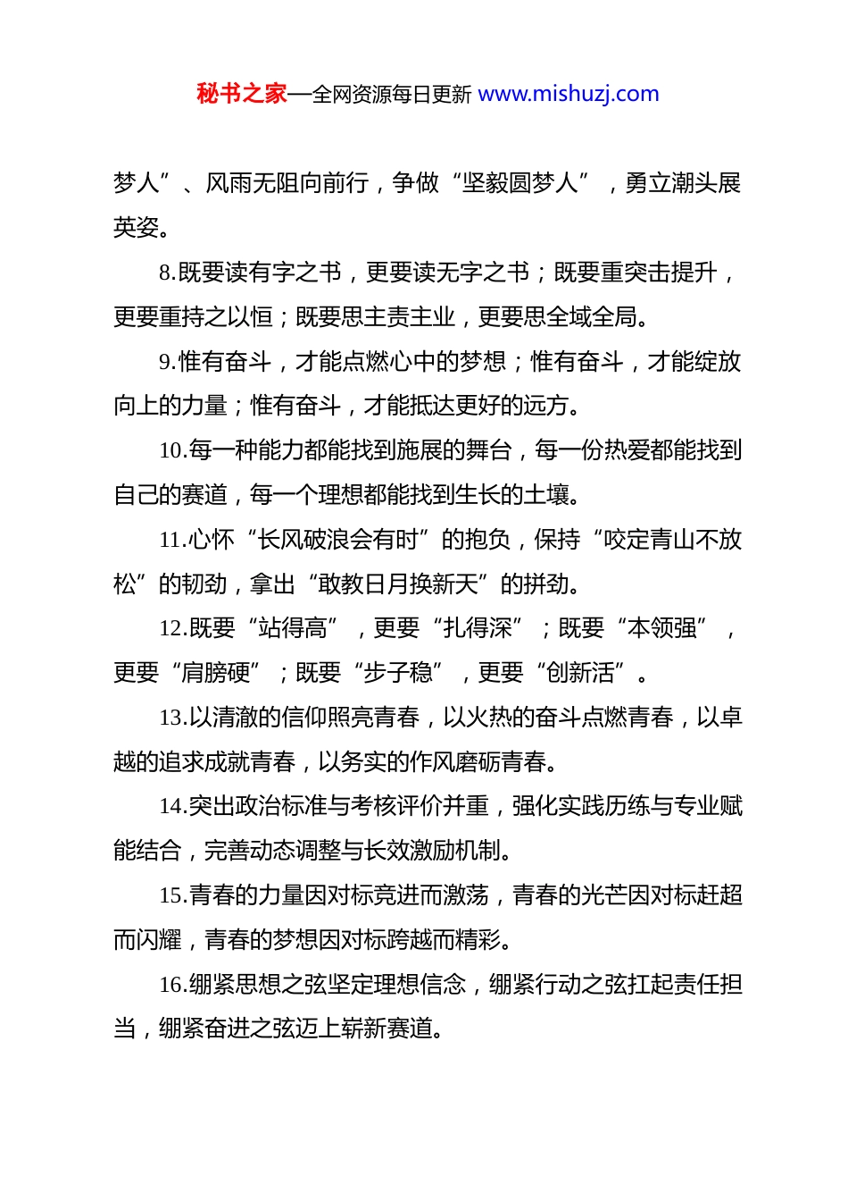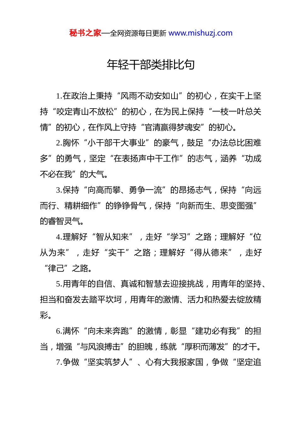 秘书之家—全网资源每日更新 www.mishuzj.com年轻干部类排比句1.在政治上秉持“风雨不动安如山”的初心,在实干上坚持“咬定青山不放松”的初心,在为民上保持“一枝一叶总关情”的初心,在作风上守持“官清赢得梦魂安”的初心。2.胸怀“小干部干大事业”的豪气,鼓足“办法总比困难多”的勇气,坚定“在表扬声中干工作”的志气,涵养“功成不必在我”的大气。3.保持“向高而攀、勇争一流”的昂扬志气,保持“向远而行、精耕细作”的铮铮骨气,保持“向新而生、思变图强”的睿智灵气。4.理解好“智从知来”,走好“学习”之路;理解好“位从为来”,走好“实干”之路;理解好“得从德来”,走好“律己”之路。5.用青年的自信、真诚和智慧去迎接挑战,用青年的坚持、担当和奋发去踏平坎坷,用青年的激情、活力和热爱去绽放精彩。6.满怀“向未来奔跑”的激情,彰显“建功必有我”的担当,增强“与风浪搏击”的胆魄,练就“厚积而薄发”的才干。7.争做“坚实筑梦人”、心有大我报家国,争做“坚定追秘书之家—全网资源每日更新 www.mishuzj.com梦人”、风雨无阻向前行,争做“坚毅圆梦人”,勇立潮头展英姿。8.既要读有字之书,更要读无字之书;既要重突击提升,更要重持之以恒;既要思主责主业,更要思全域全局。9.惟有奋斗,才能点燃心中的梦想;惟有奋斗,才能绽放向上的力量;惟有奋斗,才能抵达更好的远方。10.每一种能力都能找到施展的舞台,每一份热爱都能找到自己的赛道,每一个理想都能找到生长的土壤。11.心怀“长风破浪会有时”的抱负,保持“咬定青山不放松”的韧劲,拿出“敢教日月换新天”的拼劲。12.既要“站得高”,更要“扎得深”;既要“本领强”,更要“肩膀硬”;既要“步子稳”,更要“创新活”。13.以清澈的信仰照亮青春,以火热的奋斗点燃青春,以卓越的追求成就青春,以务实的作风磨砺青春。14.突出政治标准与考核评价并重,强化实践历练与专业赋能结合,完善动态调整与长效激励机制。15.青春的力量因对标竞进而激荡,青春的光芒因对标赶超而闪耀,青春的梦想因对标跨越而精彩。16.绷紧思想之弦坚定理想信念,绷紧行动之弦扛起责任担当,绷紧奋进之弦迈上崭新赛道。秘书之家—全网资源每日更新 www.mishuzj.com17.祛躁气、涵养一颗务实之心,祛惰气、涵养一颗勤学之心,祛庸气、涵养一颗进取之心。18.以坚定的信念筑牢廉洁之基、以严格的自律守住行为底线、以务实的担当践行廉洁初心。19.在砥砺前行中逐梦未来,在接续奋斗中实现人生价值,在实干笃行中书写无悔青春。20.用崇高理想坚定青春信仰,用过硬本领展现青春风采,用不懈奋斗贡献青春力量。21.落实是最好的表态,工作是最亮的名片,本领是最大的本钱,实干是最好的捷径。22.树牢矢志报国的鸿鹄之志,秉持拼搏向上的进取之心,锤炼律己向善的修身之德。23.以正确的政绩观守牢正气、以强烈的事业心激发志气、以强大的执行力增强锐气。24.“激情燃烧”的奋斗热忱,“趁热打铁”的创新激情,“热火朝天”的干事劲头。25.以奋斗者的姿态砥砺前行,以追赶者的执着奋勇争先,以拼搏者的坚毅担当实干。26.在奋进的浪潮中更显夺目,在服务民生中更见真章,在时代考验中更彰价值。秘书之家—全网资源每日更新 www.mishuzj.com27.增强本领不够的危机感,增强适应形势的紧迫感,增强履职尽责的责任感。28.不负韶华的“行动派”,开拓创新的“实干家”,锐意进取的“奋斗者”。29.昂扬敢打敢拼的志气,提振创新争先的心气,充盈清正廉洁的底气。30.用“修身”开启人生,用“奉献”彰显价值,用“务实”拼搏未来。31.往基层一线上“派”,往重大项目上“赶”,往艰苦岗位上“放”。32.认真就是水平,落实就是能力,实干就是本事,谋事就是人才。33.经常性“施肥浇水”,有意识“疏枝剪叶”,常态化“驱虫防病”。34.素质好有定力,悟性高有潜力,敢斗争有魄力,肯吃苦不惜力。35.一片丹心向党,一往无前奋斗,一心一意为民,一身正气从政。36.“追赶者”的清醒,“实践者”的笃定,“探索者”的锐气。秘书之家—全网资源每日更新 www.mishuzj.com37.盯着位子做工作,掰着指头排顺序,掐着时间算提升。38.不甘落...