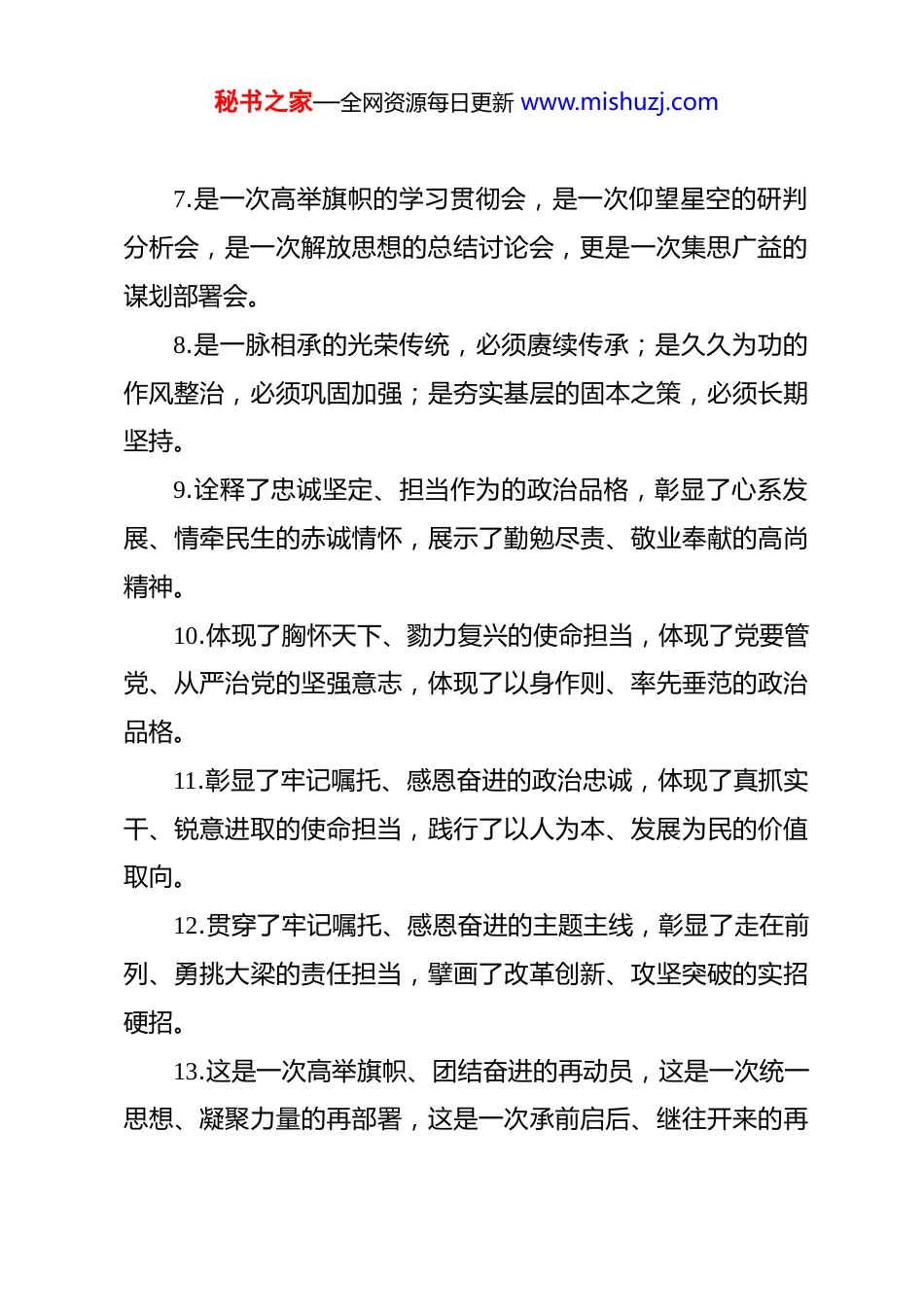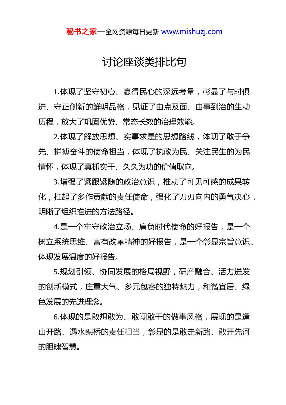 秘书之家—全网资源每日更新 www.mishuzj.com讨论座谈类排比句 1.体现了坚守初心、赢得民心的深远考量,彰显了与时俱进、守正创新的鲜明品格,见证了由点及面、由事到治的生动历程,放大了巩固优势、常态长效的治理效能。2.体现了解放思想、实事求是的思想路线,体现了敢于争先、拼搏奋斗的使命担当,体现了执政为民、关注民生的为民情怀,体现了真抓实干、久久为功的价值取向。3.增强了紧跟紧随的政治意识,推动了可见可感的成果转化,扛起了多作贡献的责任使命,强化了刀刃向内的勇气决心,明晰了组织推进的方法路径。4.是一个牢守政治立场、肩负时代使命的好报告,是一个树立系统思维、富有改革精神的好报告,是一个彰显宗旨意识、体现发展温度的好报告。5.规划引领、协同发展的格局视野,研产融合、活力迸发的创新模式,庄重大气、多元包容的独特魅力,和谐宜居、绿色发展的先进理念。6.体现的是敢想敢为、敢闯敢干的做事风格,展现的是逢山开路、遇水架桥的责任担当,彰显的是敢走新路、敢开先河的胆魄智慧。秘书之家—全网资源每日更新 www.mishuzj.com7.是一次高举旗帜的学习贯彻会,是一次仰望星空的研判分析会,是一次解放思想的总结讨论会,更是一次集思广益的谋划部署会。8.是一脉相承的光荣传统,必须赓续传承;是久久为功的作风整治,必须巩固加强;是夯实基层的固本之策,必须长期坚持。9.诠释了忠诚坚定、担当作为的政治品格,彰显了心系发展、情牵民生的赤诚情怀,展示了勤勉尽责、敬业奉献的高尚精神。10.体现了胸怀天下、勠力复兴的使命担当,体现了党要管党、从严治党的坚强意志,体现了以身作则、率先垂范的政治品格。11.彰显了牢记嘱托、感恩奋进的政治忠诚,体现了真抓实干、锐意进取的使命担当,践行了以人为本、发展为民的价值取向。12.贯穿了牢记嘱托、感恩奋进的主题主线,彰显了走在前列、勇挑大梁的责任担当,擘画了改革创新、攻坚突破的实招硬招。13.这是一次高举旗帜、团结奋进的再动员,这是一次统一思想、凝聚力量的再部署,这是一次承前启后、继往开来的再秘书之家—全网资源每日更新 www.mishuzj.com宣誓。14.彰显了高举旗帜、维护核心的政治自觉,增强了接续奋斗、笃定前行的信心决心,体现了求真务实、争先进位的价值追求。15.发出了凤凰涅槃、再创辉煌的动员令,彰显了加速崛起、重塑优势的坚定决心,擂响了大抓落实、狠抓落实的战鼓。16.大气包容的开放格局,矢志创新的坚毅定力,项目为王的决心豪气,可感可及的共富路径,干字当头的工作作风。17.盘点今年以来的“成绩单”,开出当前问题的“诊断书”,制定下步工作的“作战图”,吹响开局起步的“冲锋号”。18.彰显了坚定追随的忠诚心,交出了难能可贵的高分卷,体现了初心如磐的人民性,吹响了奋勇争先的冲锋号。19.好在高举旗帜、主题鲜明,好在鼓舞人心、催人奋进,好在任务明晰、凝心聚力,好在勇于担当、务实重干。20.对标追随的高站位,谋篇布局的大手笔,改革创新的勇作为,人民至上的硬担当,实干争先的精气神。21.感恩奋进的新成效,续写新篇的新使命,引领改革的新目标,攻坚突破的新举措,自我革命的新自觉。22.察大势的敏锐清晰,擘未来的历史主动,求变革的强烈秘书之家—全网资源每日更新 www.mishuzj.com担当,防风险的远见卓识,强肌体的清醒坚定。23.系统施治、全局统筹的谋略,乘势而上、接续奋斗的姿态,稳扎稳打、善作善成的韧劲。24.全力以赴拼经济的强烈信号,经济大市挑大梁的豪情魄力,笃行不怠抓落实的实干作风。25.体现了紧跟核心的政治自觉,凸显了一以贯之的战略定力,彰显了勇挑大梁的担当意识。26.贯穿着对标对表的政治自觉,彰显着唯实唯干的鲜明导向,传递着奋发奋进的坚定决心。27.是战略指引,也是实践要求;是奋斗目标,也是实现路径;是铿锵宣告,也是强力动员。28.传递了拼经济的坚定信心,释放了促发展的强烈信号,吹响了实干拼搏的冲锋号角。29.思想认识坚定不移,目标指标科学合理,总体布局聚焦主题,方式方法集思广益。30.列举的成效数据振奋人心,梳理的工作实绩鼓舞人心,呈现的发展态势激励人心。31.关乎全局的战略性,与时俱进的开创...