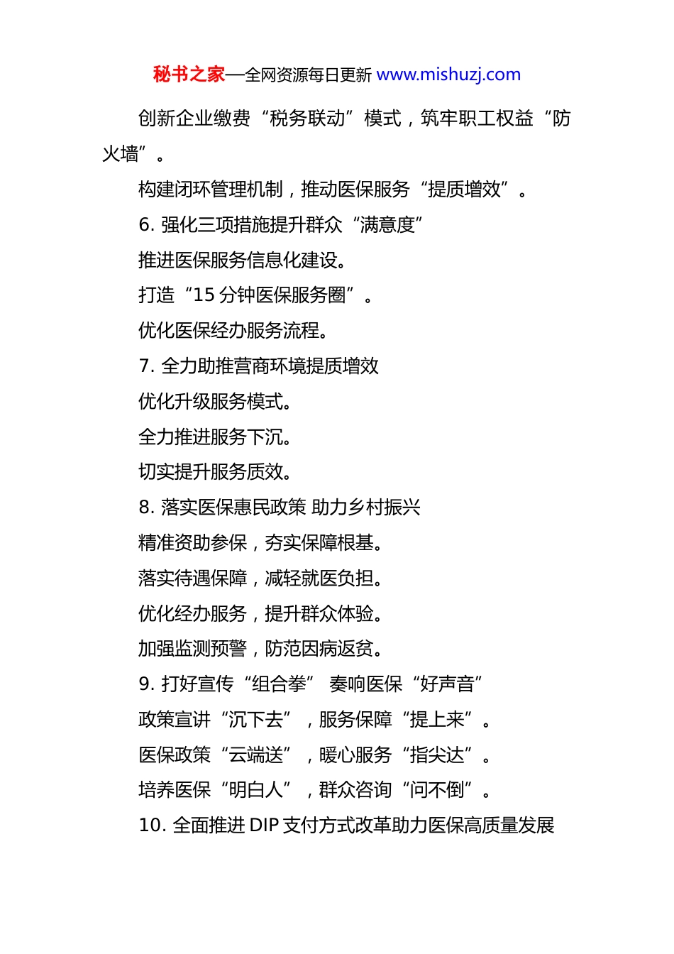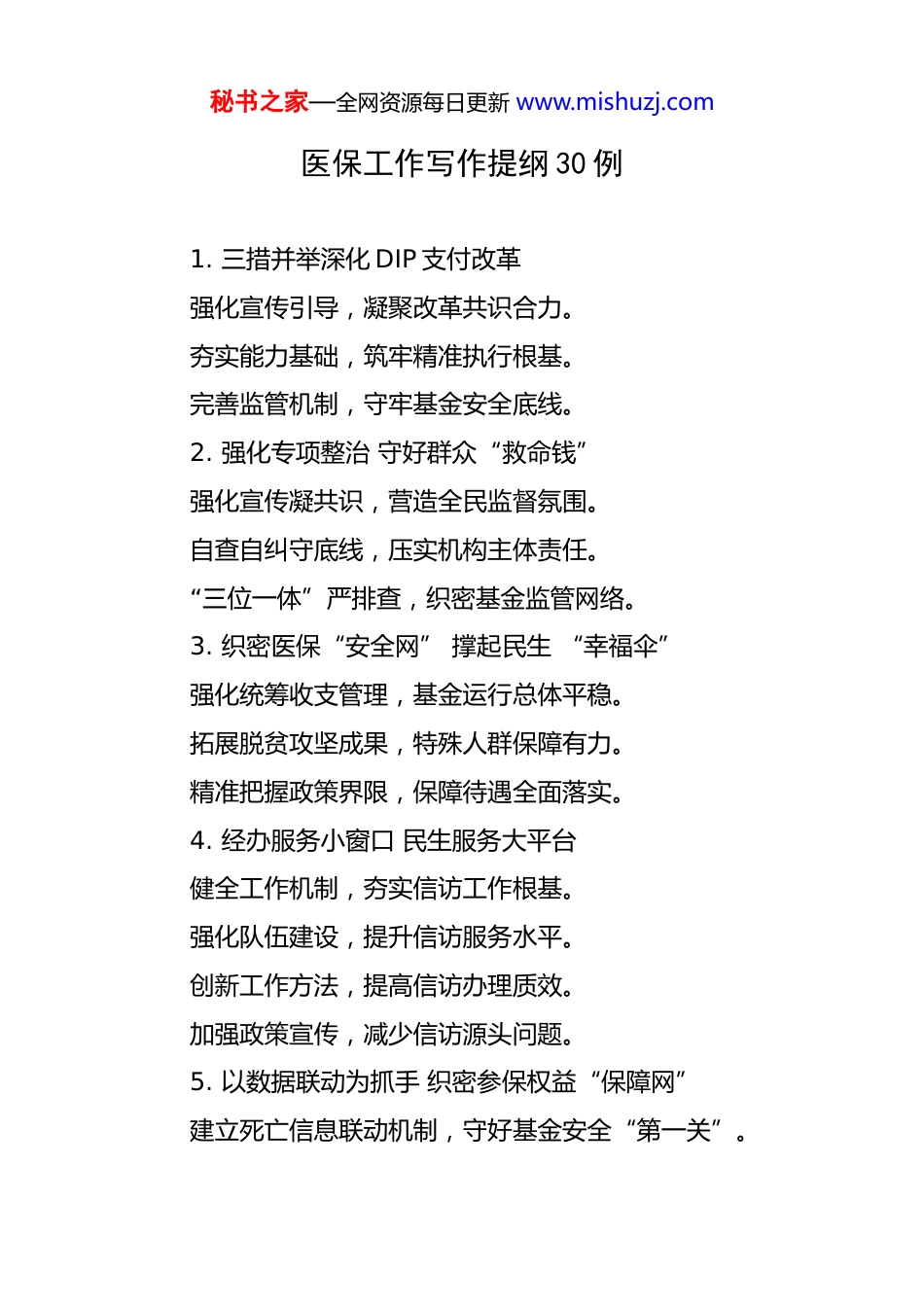 秘书之家—全网资源每日更新 www.mishuzj.com医保工作写作提纲 30 例 1. 三措并举深化 DIP 支付改革强化宣传引导,凝聚改革共识合力。夯实能力基础,筑牢精准执行根基。完善监管机制,守牢基金安全底线。2. 强化专项整治 守好群众“救命钱”强化宣传凝共识,营造全民监督氛围。自查自纠守底线,压实机构主体责任。“三位一体”严排查,织密基金监管网络。3. 织密医保“安全网” 撑起民生 “幸福伞”强化统筹收支管理,基金运行总体平稳。拓展脱贫攻坚成果,特殊人群保障有力。精准把握政策界限,保障待遇全面落实。4. 经办服务小窗口 民生服务大平台健全工作机制,夯实信访工作根基。强化队伍建设,提升信访服务水平。创新工作方法,提高信访办理质效。加强政策宣传,减少信访源头问题。5. 以数据联动为抓手 织密参保权益“保障网”建立死亡信息联动机制,守好基金安全“第一关”。秘书之家—全网资源每日更新 www.mishuzj.com创新企业缴费“税务联动”模式,筑牢职工权益“防火墙”。构建闭环管理机制,推动医保服务“提质增效”。6. 强化三项措施提升群众“满意度”推进医保服务信息化建设。打造“15 分钟医保服务圈”。优化医保经办服务流程。7. 全力助推营商环境提质增效优化升级服务模式。全力推进服务下沉。切实提升服务质效。8. 落实医保惠民政策 助力乡村振兴精准资助参保,夯实保障根基。落实待遇保障,减轻就医负担。优化经办服务,提升群众体验。加强监测预警,防范因病返贫。9. 打好宣传“组合拳” 奏响医保“好声音”政策宣讲“沉下去”,服务保障“提上来”。医保政策“云端送”,暖心服务“指尖达”。培养医保“明白人”,群众咨询“问不倒”。10. 全面推进 DIP 支付方式改革助力医保高质量发展秘书之家—全网资源每日更新 www.mishuzj.com强化组织保障,构建协同推进机制。夯实数据基础,提升病案管理质效。严格督导检查,确保改革落地见效。改革成效初显,实现多方互利共赢。11. 严把外伤核查关 守好群众“救命钱”把好入院关,强化政策宣导。把好核实关,明确责任划分。把好监管关,确保公正透明。12. 积极落实医保领域“高效办成一件事 ” 推动医保服务再升级着力构建“零距离”服务网络。着力夯实“信息化”基础支撑。着力提供“少跑路”高效服务。13. “四个一”提升服务水平“一盘棋”提升站位高度。“一主线”提升聚识广度。“一导向”提升工作精度。“一聚焦”提升贡献硬度。14. 四维发力彰显医保民生温度扩面提质,织密全民参保“保障网”。改革赋能,加固基金安全“防护堤”。秘书之家—全网资源每日更新 www.mishuzj.com数字提速,跑出便民服务“加速度”。暖心为民,提升群众就医“满意度”。15. “干部大讲堂”赋能强基 推动医保工作提质增效聚焦党的政策理论,提高政治素养。聚焦医保政策解读,提升业务水平。聚焦常用工作技巧,强化综合能力。16. 强化四项措施全力打造安全医保强化总额管理,确保基金收支平衡。强化协议管理,规范医疗服务行为。强化医师管理,维护就医良好秩序。强化内控管理,推进医疗机构自律。17. 织密基金监管网共筑医保防护线丰富宣传方式,增强守法意识。开展集中检查,维护基金安全。完善监管机制,规范服务行为。18. 强化医疗保障筑牢民生之基构筑基本医疗“防护墙”。织密医疗救助“保障网”。守好百姓健康“救命钱”。提升医保服务“新形象”。19. 强化医保基金监管守牢群众“救命钱”秘书之家—全网资源每日更新 www.mishuzj.com多方联动织密“保护网”。重拳打击绷紧“高压线”。强化宣传提高“免疫力”。20. 全面推进依申请医疗救助政策落地见效政策宣传“入心”。核实认定“用心”。待遇发放“暖心”。21. 门诊慢特病药品“双通道”管理方便患者就医购药严格药店筛选,做到布局科学合理。积极宣传引导,推动惠民政策落地。加强监督检查,规范药店服务行为。22. 多举措推进医保民生实事落地见效实施“全民医保”,社会保障更加有力。推进“智慧医保”,医保服务更加便捷。落实“两个通道”,医保服务更加惠民。优化经办服务,医保服务更加高效。23. 多措并举 打造...