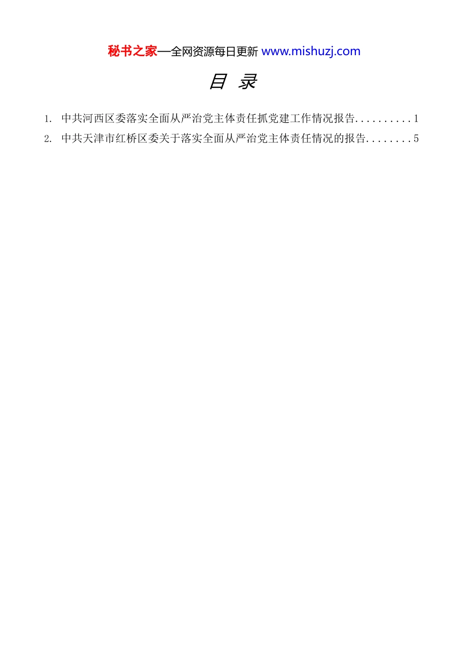 秘书之家—全网资源每日更新 www.mishuzj.com目 录1. 中共河西区委落实全面从严治党主体责任抓党建工作情况报告..........1 2. 中共天津市红桥区委关于落实全面从严治党主体责任情况的报告........5秘书之家—全网资源每日更新 www.mishuzj.com秘书之家—全网资源每日更新 www.mishuzj.com中共河西区委落实全面从严治党主体责任抓党建工作情况报告(2025 年 12 月)2025 年以来,在市委的正确领导下,区委常委会坚持以习近平新时代中国特色社会主义思想为指导,全面贯彻党的二十大和二十届历次全会精神,全面落实习近平总书记视察天津重要讲话精神和对天津工作一系列重要指示要求, 全面领会习近平总书记关于党的建设重要思想,始终把抓好党建作为最大政绩, 以党的政治建设为统领,全面推进党的各项建设,为加快建设经济强区、品质之城打牢坚实政治根基。一、坚持党的全面领导,确保党的领导贯穿于河西区高质量发展的全过程、各领域1. 强化政治引领。严格落实“第一议题”、“第一主题”、“第一主课”等制度,及时召开区委常委会会议,跟进传达学习习近平总书记重要讲话和重要指示批示精神。发挥区委理论学习中心组领学促学作用,围绕总体国家安全观、法治政府建设、生态文明等相关内容开展集体学习 14 次。带动各级党组织开展理论宣讲、辅导培训,引导全区党员干部真学真用、学以致用,不折不扣将中央精神和市委部署转化为河西实践。深入学习贯彻落实党的二十届四中全会精神,区委主要负责同志作为市委宣讲团成员作专题宣讲报告。组建区委宣讲团,入机关、入企业、入社区、入学校,推动学习宣传贯彻全会精神走深走实。召开区委十二届十一次全会,认真落实市委十二届七次全会部署,制定区委“十五五”规划建议,谋划构建“一轴贯通、两带联动、四片区协同、七功能区支撑”的“1247”生产生活生态空间格局和“3+3+5”现代化产业体系,持续增进民生福祉,持之以恒推进全面从严治党,全力推动中央精神和市委部署在河西落地生根、开花结果。组织开展“牢记嘱托勇担使命”学习贯彻习近平总书记视察天津重要讲话精神基层宣讲,开展各级各类宣讲活动,进一步推动党的创新理论深入基层、深入人心。2. 加强统筹谋划。坚持把党建工作与中心工作同部署、同落实,定期召开区委常委会会议研究全面从严治党工作。召开党的建设工作领导小组会议,研究部署组织、宣传、统战以及作风建设等各领域重点工作。召开 2024 年度各秘书之家—全网资源每日更新 www.mishuzj.com街道和有关区级部门党(工)委书记抓基层党建工作述职评议会议,推动基层党建工作责任制走深走实。及时听取区委巡察情况以及巡察“回头看”整改和成秘书之家—全网资源每日更新 www.mishuzj.com果运用情况汇报,推动巡察成果转化为实绩实效。严格落实请示报告制度,围绕全区重点工作推进情况,及时向市委呈送专题报告,把党的全面领导体现在履职尽责全过程、各方面。落实意识形态工作责任制。3. 凝聚奋进合力。支持和保障区人大及其常委会依法行使职权,组织召开市、区人大代表座谈会,持续深化民生实事项目人大代表票决制实施。拓展政协委员履职载体,打造基层协商民主平台,组织政协委员参加助力建设经济强区座谈会,广泛凝聚智慧力量。不断巩固和发展大统战工作格局,召开区委党外人士座谈会,听取对河西区“十五五”规划意见建议,全面落实党的民族、宗教、侨务等政策,成功承办 2025 年“寻美天津”活动启动会。召开区委外事工作委员会会议,深化对外交流合作,持续提升河西区的知名度和影响力。区委主要负责同志到区总工会、团区委、区妇联机关调研座谈,扎实推进群团组织建设,全力抓好党管武装各项任务,把各方力量更加紧密地团结在党的周围。二、树立选人用人正确导向,以高素质干部队伍为河西区高质量发展蓄势赋能1. 优化升级干部队伍。坚持新时代好干部标准,综合运用日常了解、多方评价、一线考察、综合研判“四位一体”政治素质考察工作机制。健全培养选拔优秀年轻干部常态化工作机制,安排年轻干部到巡视巡察、金融专班、“两办”等吃劲岗位实践锻炼,涵养优秀年轻干部“源头活水”。选派...
