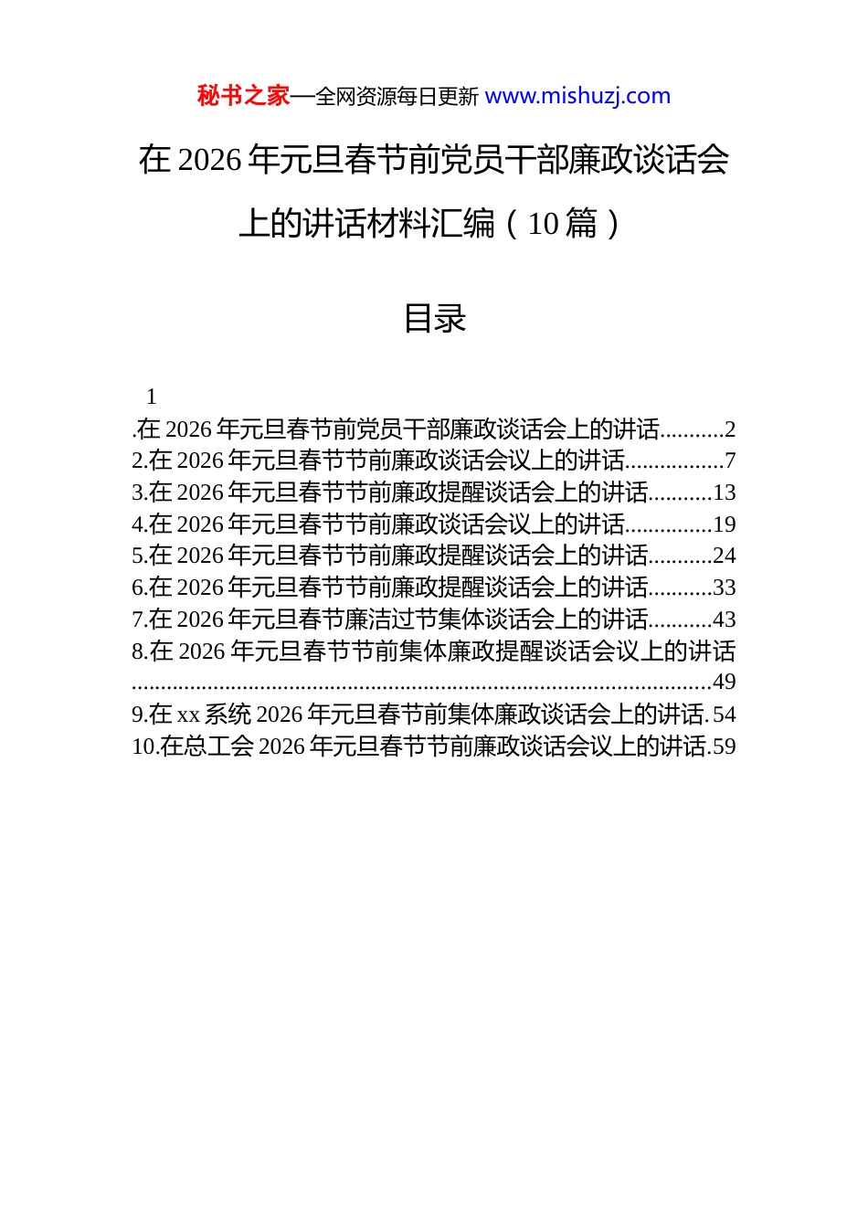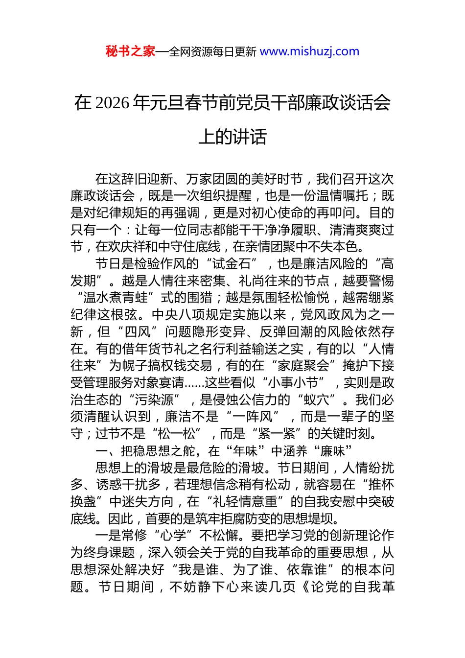 秘书之家—全网资源每日更新 www.mishuzj.com在 2026 年元旦春节前党员干部廉政谈话会上的讲话材料汇编(10 篇)目录1.在 2026 年元旦春节前党员干部廉政谈话会上的讲话...........22.在 2026 年元旦春节节前廉政谈话会议上的讲话.................73.在 2026 年元旦春节节前廉政提醒谈话会上的讲话...........134.在 2026 年元旦春节节前廉政谈话会议上的讲话...............195.在 2026 年元旦春节节前廉政提醒谈话会上的讲话...........246.在 2026 年元旦春节节前廉政提醒谈话会上的讲话...........337.在 2026 年元旦春节廉洁过节集体谈话会上的讲话...........438.在 2026 年元旦春节节前集体廉政提醒谈话会议上的讲话...................................................................................................499.在 xx 系统 2026 年元旦春节前集体廉政谈话会上的讲话.5410.在总工会 2026 年元旦春节节前廉政谈话会议上的讲话.59秘书之家—全网资源每日更新 www.mishuzj.com在 2026 年元旦春节前党员干部廉政谈话会上的讲话在这辞旧迎新、万家团圆的美好时节,我们召开这次廉政谈话会,既是一次组织提醒,也是一份温情嘱托;既是对纪律规矩的再强调,更是对初心使命的再叩问。目的只有一个:让每一位同志都能干干净净履职、清清爽爽过节,在欢庆祥和中守住底线,在亲情团聚中不失本色。节日是检验作风的“试金石”,也是廉洁风险的“高发期”。越是人情往来密集、礼尚往来的节点,越要警惕“温水煮青蛙”式的围猎;越是氛围轻松愉悦,越需绷紧纪律这根弦。中央八项规定实施以来,党风政风为之一新,但“四风”问题隐形变异、反弹回潮的风险依然存在。有的借年货节礼之名行利益输送之实,有的以“人情往来”为幌子搞权钱交易,有的在“家庭聚会”掩护下接受管理服务对象宴请……这些看似“小事小节”,实则是政治生态的“污染源”,是侵蚀公信力的“蚁穴”。我们必须清醒认识到,廉洁不是“一阵风”,而是一辈子的坚守;过节不是“松一松”,而是“紧一紧”的关键时刻。一、把稳思想之舵,在“年味”中涵养“廉味”思想上的滑坡是最危险的滑坡。节日期间,人情纷扰多、诱惑干扰多,若理想信念稍有松动,就容易在“推杯换盏”中迷失方向,在“礼轻情意重”的自我安慰中突破底线。因此,首要的是筑牢拒腐防变的思想堤坝。一是常修“心学”不松懈。要把学习党的创新理论作为终身课题,深入领会关于党的自我革命的重要思想,从思想深处解决好“我是谁、为了谁、依靠谁”的根本问题。节日期间,不妨静下心来读几页《论党的自我革秘书之家—全网资源每日更新 www.mishuzj.com命》,看一部警示教育片,想一想焦裕禄、谷文昌等楷模如何过节,比一比自己是否做到了“心不动于微利之诱,目不眩于五色之惑”。二是常怀敬畏知边界 。党纪国法是带电的“高压线”,容不得半点侥幸。新修订的《中国共产党纪律处分条例》对违规收送礼品礼金、接受宴请等行为划出更清晰红线。同志们要明白,一顿饭、一张卡、一份土特产,背后可能藏着“陷阱”。要时刻以“如履薄冰、如临深渊”的警觉,把纪律规矩刻印在心,做到“不该吃的饭坚决不吃,不该收的礼坚决不收,不该去的地方坚决不去”。三是常照镜子正衣冠。节前正是自查自省的好时机。不妨问问自己:有没有打着“联络感情”旗号搞利益交换?有没有借慰问走访之机厚此薄彼?有没有在安排节庆活动时铺张浪费?只有常掸思想尘、常破“心中贼”,才能在年关守住“廉关”。二、压实责任之链,在“团圆”中守护“清圆”全面从严治党没有“节假日”,管党治党责任不能“打烊”。各级领导干部既是廉洁自律的践行者,也是责任链条的“关键环”,必须做到守土有责、守土尽责。一是履行“一岗双责”不含糊。分管领域的党风廉政建设,不能只挂在嘴上、写在纸上。节前要主动与分管部门、联系单位的主要负责同志谈一次心,既传递组织温暖,也严明纪律要求;既要了解工作进展,也要掌握干部思想动态。对苗头性、倾向性问题,要及时“红脸出汗”,防止小错酿成大祸。二是扎紧制度笼子不松劲。针对节日期间易发多发问...