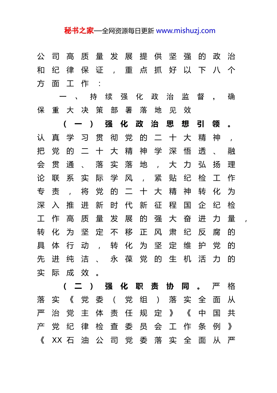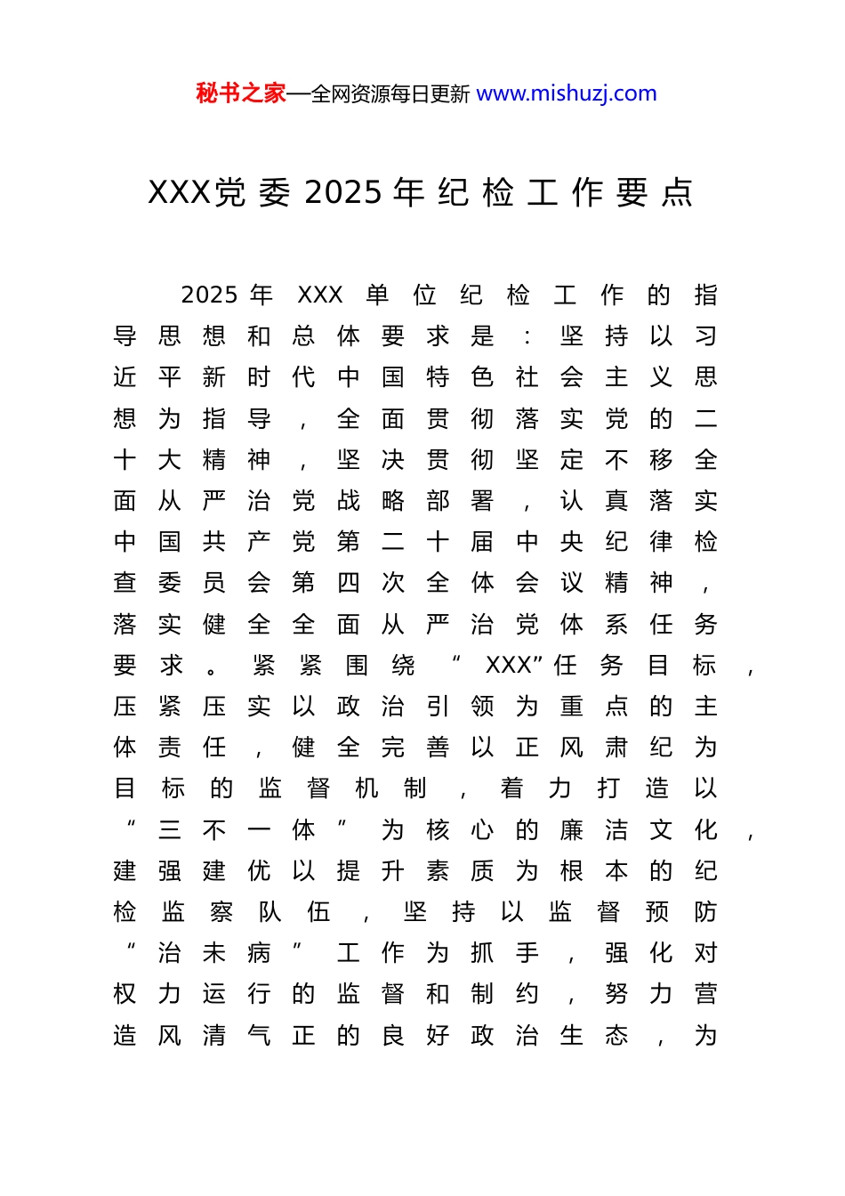 秘书之家—全网资源每日更新 www.mishuzj.comXXX党 委 2025 年 纪 检 工 作 要 点2025 年XXX单位纪检工作的指导思想和总体要求是:坚持以习近平新时代中国特色社会主义思想为指导,全面贯彻落实党的二十大精神,坚决贯彻坚定不移全面从严治党战略部署,认真落实中国共产党第二十届中央纪律检查委员会第四次全体会议精神,落实健全全面从严治党体系任务要求。紧紧围绕“XXX” 任务目标,压紧压实以政治引领为重点的主体责任,健全完善以正风肃纪为目标的监督机制,着力打造以“三不一体”为核心的廉洁文化,建强建优以提升素质为根本的纪检监察队伍,坚持以监督预防“治未病”工作为抓手,强化对权力运行的监督和制约,努力营造风清气正的良好政治生态,为秘书之家—全网资源每日更新 www.mishuzj.com公司高质量发展提供坚强的政治和纪律保证,重点抓好以下八个方面工作: 一、持续强化政治监督,确保重大决策部署落地见效(一)强化政治思想引领。认真学习贯彻党的二十大精神,把党的二十大精神学深悟透、融会贯通、落实落地,大力弘扬理论联系实际学风,紧贴纪检工作专责,将党的二十大精神转化为深入推进新时代新征程国企纪检工作高质量发展的强大奋进力量,转化为坚定不移正风肃纪反腐的具体行动,转化为坚定维护党的先进纯洁、永葆党的生机活力的实际成效。(二)强化职责协同。严格落实《党委(党组)落实全面从严治党主体责任规定》《中国共产党纪律检查委员会工作条例》《XX 石油公司党委落实全面从严秘书之家—全网资源每日更新 www.mishuzj.com治党责任制实施办法》等规定和办法,不断推进规范化、法治化、正规化建设,以高质量纪检工作推动公司全面从严治党向纵深发展。坚持履行协助职责和监督职责有机结合,建立健全相关职能部门和纪委办公室会商通报机制,推动全面从严治党党委主体责任和纪委监督专责贯通联动、一体落实、形成合力。(三)深化成果运用。坚持治企必先治党、治党务必从严,加强对两级领导班子民主生活会、组织生活会的监督,把政治监督反馈情况同党组织领导班子评价、绩效考评等相结合,严把党风廉政意见回复关,对政治上不合格的“一票否决”,对廉洁上有硬伤的“一律挡住”,坚决防范和查处“七个有之”问题,确保干部队伍纯洁可靠。二、围绕全面从严治党主体秘书之家—全网资源每日更新 www.mishuzj.com责任,推动各类监督形成合力(一)紧盯各级“一把手”和领导班子强化监督。增强“一把手”和领导班子监督实效,围绕遵守制度、落实决策、履行责任、行使权力等情况进行监督,督促各部门及分公司“一把手”严于律己、严负其责、严管所辖。抓住全面从严治党的“牛鼻子”,推动党委主体责任、书记的第一责任、班子成员“一岗双责”、职能部门的监管责任层层压实、一贯到底,健全各负其责、统一协调的管党治党责任格局。在指出问题、警示提醒和督责履责上提高针对性,坚持和完善与“一把手”的日常沟通提醒机制,及时通报中央纪委国家监委和XX 纪委监委有关党风廉政建设和反腐败工作部署要求,加强对政治生态状况研判,督促“一把手”和班子成员严格落实《党委( 党组)秘书之家—全网资源每日更新 www.mishuzj.com落实全面从严治党主体责任规定》,定期研究谋划全面从严治党工作,认真安排部署党风廉政建设和反腐败工作任务,明确目标,细化制定公司领导班子、各分公司、职能部门落实党风廉政建设责任清单,抓好纪委监督责任落实。健全全面从严治党纪实、报告、检查、考核制度,发挥协助职责、督促履责、用好问责,细化考核作用。(二)推动完善各类监督贯通协调机制。发挥党内监督主导作用,健全完善纪检与各类监督沟通联络机制,加强纪检和审计队伍建设,促进同合规管理、审计监督、财会监督、群众监督、舆论监督、安全生产检查等有机贯通形成合力,建立健全“大监督”工作格局,发挥企业审计监督的独特优势,综合运用检查抽查、民主生活会督导、信访举报秘书之家—全网资源每日更新 www.mishuzj.com研判、问题督办等方式,重点监督检查党内政治生活开展、“三会一层”重大事项请示报告以及人财物等情况,督促企业领导班子严格...