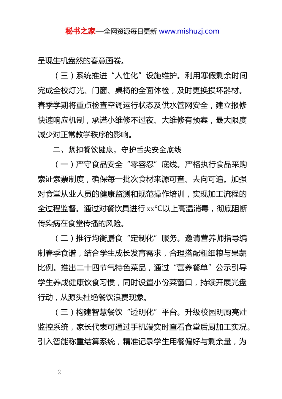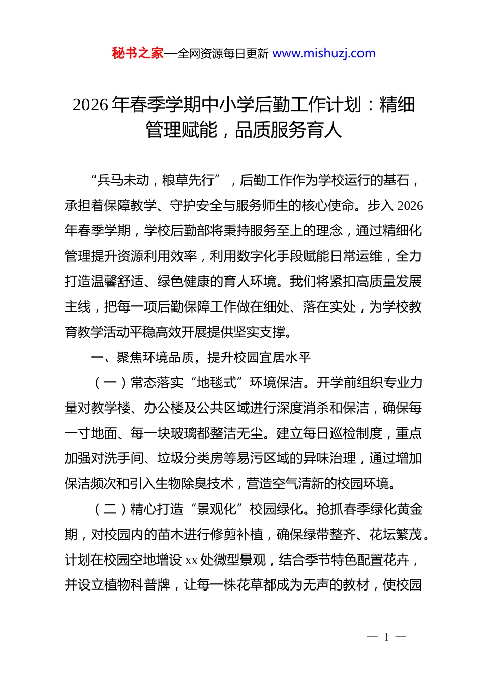 秘书之家—全网资源每日更新 www.mishuzj.com2026 年春季学期中小学后勤工作计划:精细管理赋能,品质服务育人“兵马未动,粮草先行”,后勤工作作为学校运行的基石,承担着保障教学、守护安全与服务师生的核心使命。步入 2026年春季学期,学校后勤部将秉持服务至上的理念,通过精细化管理提升资源利用效率,利用数字化手段赋能日常运维,全力打造温馨舒适、绿色健康的育人环境。我们将紧扣高质量发展主线,把每一项后勤保障工作做在细处、落在实处,为学校教育教学活动平稳高效开展提供坚实支撑。一、聚焦环境品质,提升校园宜居水平(一)常态落实“地毯式”环境保洁。开学前组织专业力量对教学楼、办公楼及公共区域进行深度消杀和保洁,确保每一寸地面、每一块玻璃都整洁无尘。建立每日巡检制度,重点加强对洗手间、垃圾分类房等易污区域的异味治理,通过增加保洁频次和引入生物除臭技术,营造空气清新的校园环境。(二)精心打造“景观化”校园绿化。抢抓春季绿化黄金期,对校园内的苗木进行修剪补植,确保绿带整齐、花坛繁茂。计划在校园空地增设 xx 处微型景观,结合季节特色配置花卉,并设立植物科普牌,让每一株花草都成为无声的教材,使校园— 1 —秘书之家—全网资源每日更新 www.mishuzj.com呈现生机盎然的春意画卷。(三)系统推进“人性化”设施维护。利用寒假剩余时间完成全校灯光、门窗、桌椅的全面体检,及时更换损坏器材。春季学期将重点检查空调运行状态及供水管网安全,建立报修快速响应机制,承诺小维修不过夜、大维修有预案,最大限度减少对正常教学秩序的影响。二、紧扣餐饮健康,守护舌尖安全底线(一)严守食品安全“零容忍”底线。严格执行食品采购索证索票制度,确保每一批次食材来源可查、去向可追。加强对食堂从业人员的健康监测和规范操作培训,实现加工流程的全过程监督。通过对餐饮具进行 xx℃以上高温消毒,彻底阻断传染病在食堂传播的风险。(二)推行均衡膳食“定制化”服务。邀请营养师指导编制春季食谱,结合学生成长发育需求,合理搭配粗细粮与果蔬比例。推出二十四节气特色菜品,通过“营养餐单”公示引导学生养成健康饮食习惯,同时设置小份菜窗口,持续开展光盘行动,从源头杜绝餐饮浪费现象。(三)构建智慧餐饮“透明化”平台。升级校园明厨亮灶监控系统,家长代表可通过手机端实时查看食堂后厨加工实况。引入智能称重结算系统,精准记录学生用餐偏好与剩余量,为— 2 —秘书之家—全网资源每日更新 www.mishuzj.com后续科学采购和菜品调优提供数据支撑,提升师生对校园餐饮的满意度和信任度。三、强化资产管控,保障物资高效运行(一)执行财务支出“效益化”原则。严格按照学期预算安排经费支出,坚持物尽其用、勤俭办学的方针。加强对低值易耗品的领用登记,推行办公用品集中采购与分类发放制度,减少非必要库存积压。定期开展资产盘点,确保 xx 件学校固定资产账物相符。(二)完善仓储管理“规范化”流程。优化物资入库验收和出库登记环节,建立电子化库存账目,实现物资动态监控。针对教学仪器、体育器材等专用物资,建立专项保管档案,明确专人负责、定期校验。对超过使用年限的物资及时报损报废,腾挪空间提升仓储效能。(三)推进低碳校园“节约化”运行。实施校园能源智能监测系统,对各区域用电、用水情况进行实时采集分析。加强对路灯、直饮水机等公共能耗设施的感应控制改造,通过设立校园“节能标兵”评选活动,引导师生从随手关灯、节约滴水做起,建设节约型校园。四、筑牢安全防线,构建和谐平安校园(一)织密校园安保“立体化”网络。加强安保人员专业— 3 —秘书之家—全网资源每日更新 www.mishuzj.com技能培训,开展突发事件应急演练。定期检查校园围栏、监控死角及消防通道,确保 xx 个监控点位运行正常。严格执行外来人员预约登记与身份比对制度,利用智能闸机系统提升入校核验效率,杜绝外来安全隐患。(二)开展设施隐患“闭环化”排查。每月开展一次校园安全大排查,重点针对电梯运行、实验室危化品存放、配电间等核心部位。对排查出的隐患建立台账,实行销号管理,明确责任人和整改时限...