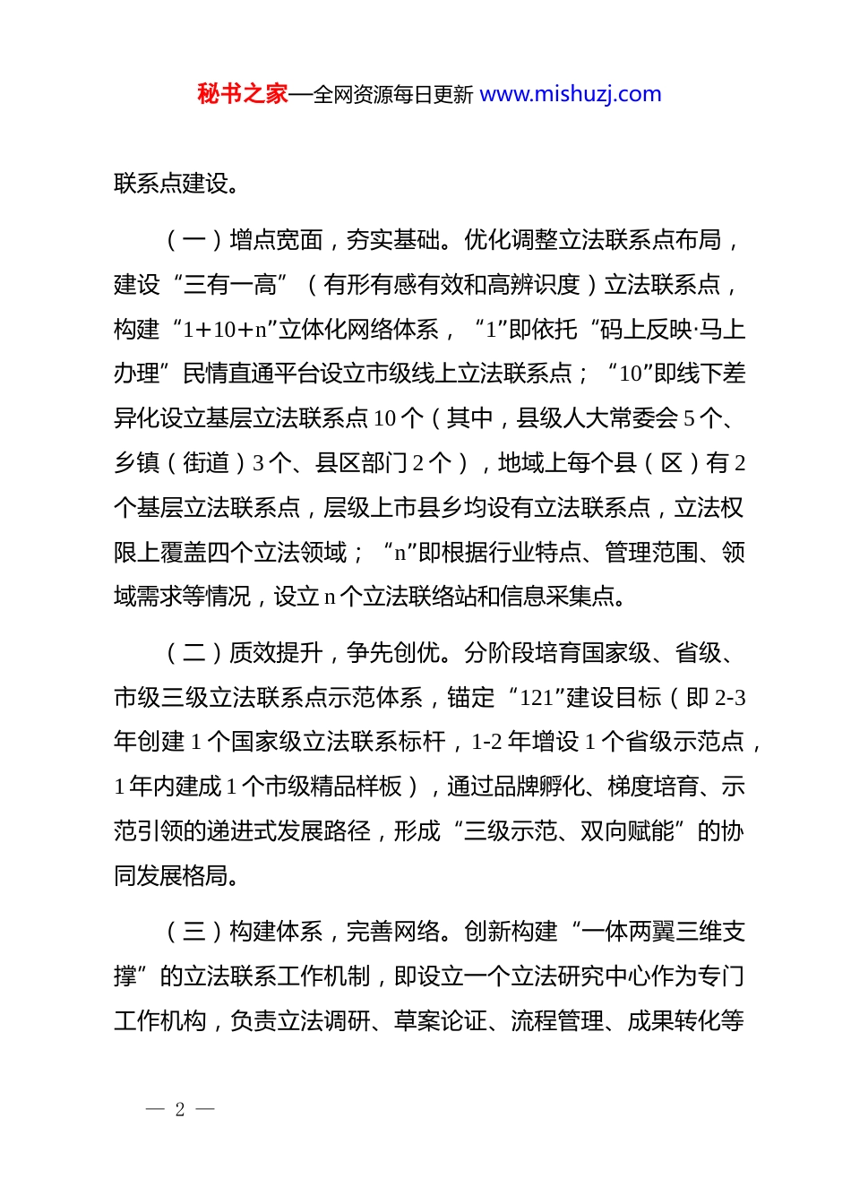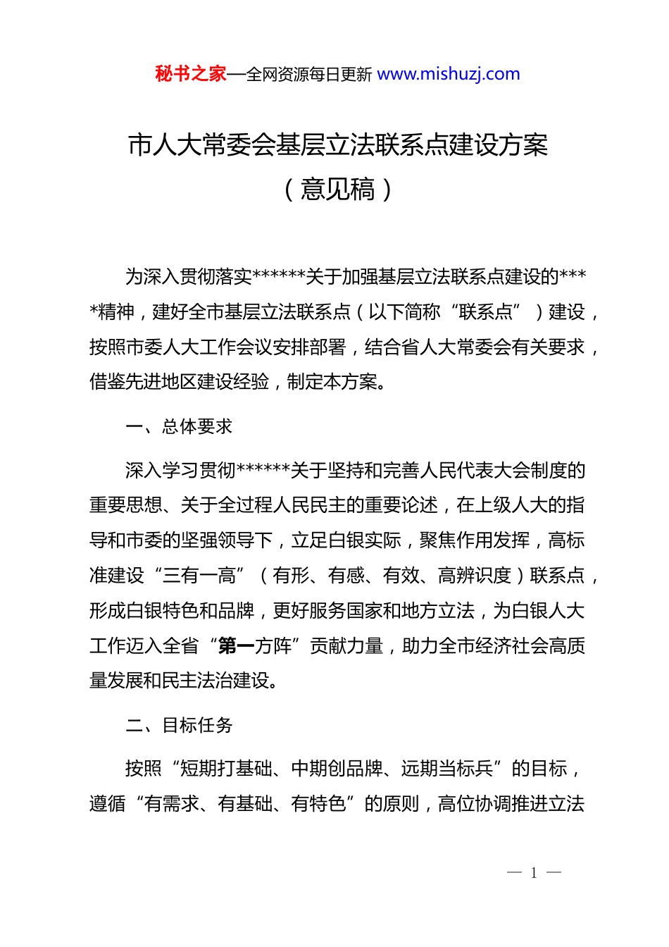 秘书之家—全网资源每日更新 www.mishuzj.com市人大常委会基层立法联系点建设方案(意见稿)为深入贯彻落实******关于加强基层立法联系点建设的****精神,建好全市基层立法联系点(以下简称“联系点”)建设,按照市委人大工作会议安排部署,结合省人大常委会有关要求,借鉴先进地区建设经验,制定本方案。一、总体要求深入学习贯彻******关于坚持和完善人民代表大会制度的重要思想、关于全过程人民民主的重要论述,在上级人大的指导和市委的坚强领导下,立足白银实际,聚焦作用发挥,高标准建设“三有一高”(有形、有感、有效、高辨识度)联系点,形成白银特色和品牌,更好服务国家和地方立法,为白银人大工作迈入全省“第一方阵”贡献力量,助力全市经济社会高质量发展和民主法治建设。二、目标任务按照“短期打基础、中期创品牌、远期当标兵”的目标,遵循“有需求、有基础、有特色”的原则,高位协调推进立法— 1 —秘书之家—全网资源每日更新 www.mishuzj.com联系点建设。(一)增点宽面,夯实基础。优化调整立法联系点布局,建设“三有一高”(有形有感有效和高辨识度)立法联系点,构建“1+10+n”立体化网络体系,“1”即依托“码上反映·马上办理”民情直通平台设立市级线上立法联系点;“10”即线下差异化设立基层立法联系点 10 个(其中,县级人大常委会 5 个、乡镇(街道)3 个、县区部门 2 个),地域上每个县(区)有 2个基层立法联系点,层级上市县乡均设有立法联系点,立法权限上覆盖四个立法领域;“n”即根据行业特点、管理范围、领域需求等情况,设立 n 个立法联络站和信息采集点。(二)质效提升,争先创优。分阶段培育国家级、省级、市级三级立法联系点示范体系,锚定“121”建设目标(即 2-3年创建 1 个国家级立法联系标杆,1-2 年增设 1 个省级示范点,1 年内建成 1 个市级精品样板),通过品牌孵化、梯度培育、示范引领的递进式发展路径,形成“三级示范、双向赋能”的协同发展格局。(三)构建体系,完善网络。创新构建“一体两翼三维支撑”的立法联系工作机制,即设立一个立法研究中心作为专门工作机构,负责立法调研、草案论证、流程管理、成果转化等— 2 —秘书之家—全网资源每日更新 www.mishuzj.com工作;构建基层服务两翼网络,横向依托代表之家、村社服务中心及律所设立立法信息联络站,纵向贯通全市综合网格体系设立立法信息采集点;建立三维协同支持体系,组建立法联系协作单位、专家顾问智库和普法宣讲团队等三个支持团队,构建专业化支持体系。通过专门机构统筹协调、基层网络深度触达、专业力量多维支撑,构建覆盖全面、运行高效、专业支撑的立法联系工作网络体系。(四)健全制度,规范运行。建立标准化制度体系,编制《立法联系工作网络建设指引》,配套出台立法征询规程、工作队伍管理办法等制度规范,形成“1+n”政策支撑体系。创新全周期管理流程,设计“任务领受、方案策划、宣传动员、多维征询、分析研判、专家论证、成果提报、效果跟踪、档案归集”九步闭环机制,实现全流程可视化管控,推动立法联系点规范运行。(五)聚焦主业,服务立法。配合协助上级人大开展相关立法调研和论证工作;跟踪了解有关法律法规实施情况,及时掌握法律法规在实施过程中出现的问题,收集对修改完善有关法律法规的建议;通过走访入户、召开座谈会征求群众对有关法律法规的意见建议。广泛收集社情民意,反映地方社会治理— 3 —秘书之家—全网资源每日更新 www.mishuzj.com经验以及基层立法需求。(六)拓展功能,形成特色。高质量完成立法意见征询工作的同时,结合白银实际,积极拓展联系点工作职能,在宪法法律宣传、法规实施评估、社会治理问题收集、典型案例事例报送和地方立法诉求反映等方面,积极主动作为,努力开拓进取,形成白银特色。三、工作措施(一)加强组织领导。成立常委会主要领导任组长、分管领导任副组长,法工委负责人、县区人大常委会主要领导,相关部门、乡镇街道主要负责人为成员的联系点建设领导小组,法工委统筹协调,各县区人大常委会、相关部门、乡镇街道具体负责联系点建设等事宜。(二)提供...