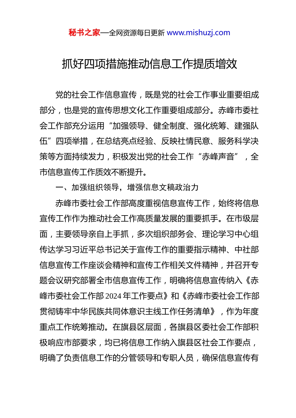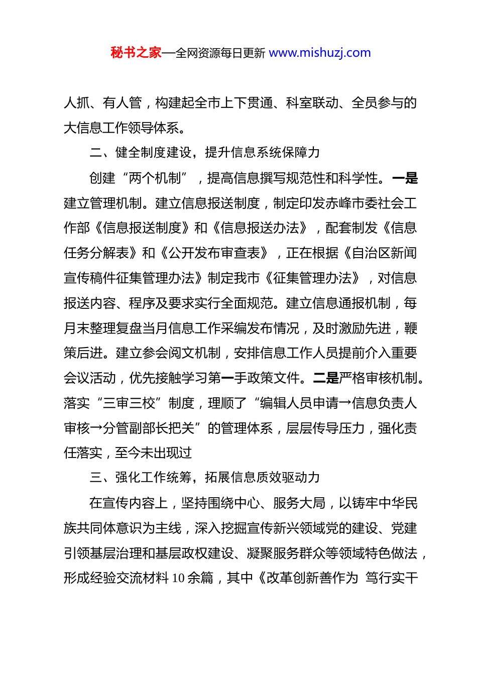 秘书之家—全网资源每日更新 www.mishuzj.com抓好四项措施推动信息工作提质增效党的社会工作信息宣传,既是党的社会工作事业重要组成部分,也是党的宣传思想文化工作重要组成部分。赤峰市委社会工作部充分运用“加强领导、健全制度、强化统筹、建强队伍”四项举措,在总结亮点经验、反映社情民意、服务科学决策等方面持续发力,积极发出党的社会工作“赤峰声音”,全市信息宣传工作质效不断提升。一、加强组织领导,增强信息文稿政治力赤峰市委社会工作部高度重视信息宣传工作,始终将信息宣传工作作为推动社会工作高质量发展的重要抓手。在市级层面,主要领导亲自上手抓,多次组织部务会、理论学习中心组传达学习习近平总书记关于宣传工作的重要指示精神、中社部信息宣传工作座谈会精神和宣传工作相关文件精神,并召开专题会议研究部署全市信息宣传工作,明确将信息宣传纳入《赤峰市委社会工作部 2024 年工作要点》和《赤峰市委社会工作部贯彻铸牢中华民族共同体意识主线工作任务清单》,作为年度重点工作统筹推动。在旗县区层面,各旗县区委社会工作部积极响应市部要求,均已将信息工作纳入旗县区社会工作要点,明确了负责信息工作的分管领导和专职人员,确保信息宣传有秘书之家—全网资源每日更新 www.mishuzj.com人抓、有人管,构建起全市上下贯通、科室联动、全员参与的大信息工作领导体系。二、健全制度建设,提升信息系统保障力创建“两个机制”,提高信息撰写规范性和科学性。一是建立管理机制。建立信息报送制度,制定印发赤峰市委社会工作部《信息报送制度》和《信息报送办法》,配套制发《信息任务分解表》和《公开发布审查表》,正在根据《自治区新闻宣传稿件征集管理办法》制定我市《征集管理办法》,对信息报送内容、程序及要求实行全面规范。建立信息通报机制,每月末整理复盘当月信息工作采编发布情况,及时激励先进,鞭策后进。建立参会阅文机制,安排信息工作人员提前介入重要会议活动,优先接触学习第一手政策文件。二是严格审核机制。落实“三审三校”制度,理顺了“编辑人员申请→信息负责人审核→分管副部长把关”的管理体系,层层传导压力,强化责任落实,至今未出现过三、强化工作统筹,拓展信息质效驱动力在宣传内容上,坚持围绕中心、服务大局,以铸牢中华民族共同体意识为主线,深入挖掘宣传新兴领域党的建设、党建引领基层治理和基层政权建设、凝聚服务群众等领域特色做法,形成经验交流材料 10 余篇,其中《改革创新善作为 笃行实干秘书之家—全网资源每日更新 www.mishuzj.com勇担当 在新征程上谱写赤峰社会工作新篇章》被《中国社区报》采用;《文明团结超市激发乡村治理新动能》、《“理”上“心”来汇聚力量创新驱动“声入人心”》、《“爱老助残”餐厅暖胃又暖心》、《“柚”见西城》等被《人民日报》采用。在宣传载体上,建立起以社会工作简报、“赤峰社会工作”微信公众号、各级各类主流媒体和 12 个旗县区微信公众号为主要途径的融合传播矩阵。将公众号作为对外宣传的重要媒介,开设政策法规、市级动态、典型交流、社工风采等 12 个品牌专栏,筹备开设《丛语众议》人民意见建议征集栏目,主动提供拓宽人民建议征集渠道,截止目前,共有粉丝 2875 人、浏览量 6 万余次;赤峰社会工作系统累计撰写发布信息 1362 篇,其中,报送发布信息 206 篇,旗县区级报送发布信息 1062 篇,社会媒体采发相关信息 89 篇,赤峰社会领域干部热议中央社会工作会议精神等 54 篇优质稿件被自治区党委社会工作部、赤峰市委、《中国社区报》《学习强国》《人民日报》《奔腾融媒》等采用,信息工作取得一定成效。四、建强宣传队伍,加强信息体系支撑力贯彻落实中社部信息宣传座谈会精神,持续壮大社会工作系统信息宣传力量。一是夯实宣传基础。横向联通部机关各科室、纵向贯通市县乡三级、社会面发动“两企三新”等组织群秘书之家—全网资源每日更新 www.mishuzj.com体,形成关系紧密、团结协作的多层次人才梯队。二是建立专班机制。聚焦重点工作,成立“积分制”、“志愿环保”和“社工风采”等写作专班进行调研、约稿与采编,提升信息...