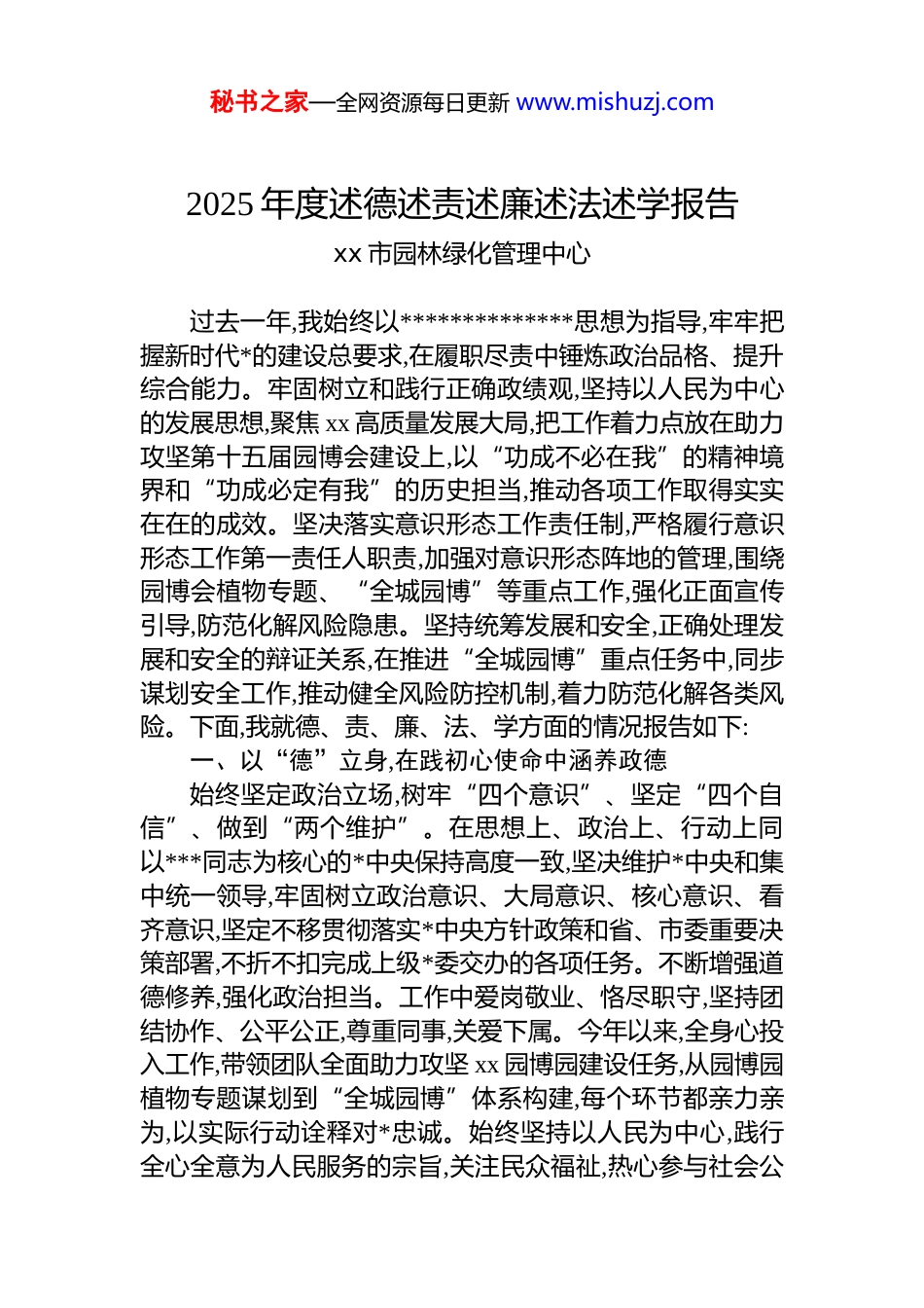 秘书之家—全网资源每日更新 www.mishuzj.com2025 年度述德述责述廉述法述学报告xx 市园林绿化管理中心过去一年,我始终以**************思想为指导,牢牢把握新时代*的建设总要求,在履职尽责中锤炼政治品格、提升综合能力。牢固树立和践行正确政绩观,坚持以人民为中心的发展思想,聚焦 xx 高质量发展大局,把工作着力点放在助力攻坚第十五届园博会建设上,以“功成不必在我”的精神境界和“功成必定有我”的历史担当,推动各项工作取得实实在在的成效。坚决落实意识形态工作责任制,严格履行意识形态工作第一责任人职责,加强对意识形态阵地的管理,围绕园博会植物专题、“全城园博”等重点工作,强化正面宣传引导,防范化解风险隐患。坚持统筹发展和安全,正确处理发展和安全的辩证关系,在推进“全城园博”重点任务中,同步谋划安全工作,推动健全风险防控机制,着力防范化解各类风险。下面,我就德、责、廉、法、学方面的情况报告如下:一、以“德”立身,在践初心使命中涵养政德始终坚定政治立场,树牢“四个意识”、坚定“四个自信”、做到“两个维护”。在思想上、政治上、行动上同以***同志为核心的*中央保持高度一致,坚决维护*中央和集中统一领导,牢固树立政治意识、大局意识、核心意识、看齐意识,坚定不移贯彻落实*中央方针政策和省、市委重要决策部署,不折不扣完成上级*委交办的各项任务。不断增强道德修养,强化政治担当。工作中爱岗敬业、恪尽职守,坚持团结协作、公平公正,尊重同事,关爱下属。今年以来,全身心投入工作,带领团队全面助力攻坚 xx 园博园建设任务,从园博园植物专题谋划到“全城园博”体系构建,每个环节都亲力亲为,以实际行动诠释对*忠诚。始终坚持以人民为中心,践行全心全意为人民服务的宗旨,关注民众福祉,热心参与社会公秘书之家—全网资源每日更新 www.mishuzj.com益活动。今年坚持组织慰问社区困难老*员,为他们送去生活物资与关怀,传递温暖与爱心。二、以“干”为要,在务实中交出实绩答卷坚持干在当头,以实干作答、用实绩交卷。根据市综合行政执法局*组分工,我负责推进“全城园博”和园博会植物专题指导工作,将园博会的宏伟蓝图细化为“施工图”、转化为“实景画”。一是做好园博园植物专题指导服务,牵头制定出台《苗木分类分级管理规定》《绿化工程技术指导守则》等技术标准,牵头组织园博园布展方案研讨,督促植物种植进度,开展植物花期调研,坚持定期现场踏勘园博园指导服务,及时发现并针对种植土质量、苗木质量、种植密度、藤蔓绞杀等问题提出优化建议。今年,组织开展现场技术指导 xx 余次、组织参与技术研讨会 xx 余次。二是牵头深化“全城园博”概念性规划方案,完成 xx 个分会场专项策划方案的省级评审,谋划开展“全城园博”启动仪式,开启全城园博预热活动,谋划推动主会场与分会场间展陈、活动、宣传及运营的联动机制。三是加强园博园古树保护,牵头推动成立专项领导小组,定期开展古树巡查。积极推进新植乔木“一树一码”数字化管理,督促完善系统信息录入,助力规范海量苗木的管理流程,今后游客通过手机扫码即可获取树木详细信息,也为游客提供了便捷的科普途径。四是积极推进园博园植物捐赠活动,组织编制园博园植物捐赠工作章程,搭建线上捐赠平台,设立慈善总会植物捐赠账户,协同市生态环境局申请落实 xxx 万元生态修复补偿金,牵头倡议开展“我为园博捐棵树”活动。五是牵头推进行业法治建设,组织编制出台《xx 市区城市绿地占补平衡指导意见》,组织征集完善《xx 市城市公园管理办法》和《xx 城市绿线管理办法》,组织参与编制 xx 省团体标准《“无废植物园”建设与管理指南》。六是牵头推进落实市级民生实事项目,完成新改建口袋公园 xx 个;完成改造提升城市公园 x 个、开放共享公园绿地 x 处等。牵头推动市政基础设施管养检查、xx 个街镇秘书之家—全网资源每日更新 www.mishuzj.com“六比竞赛”评价、瓯海大道绿化维养移交管理、城市公园(广场)安全生产管理等任务。七是加强行业技术指导服务,牵头组织 x 期“xx 园林大讲堂”,特邀全省专家为我市园林绿化技术骨干开展专题培训。组织参与国土空间规划评审项目方案审查等涉绿审查会议,严格把...