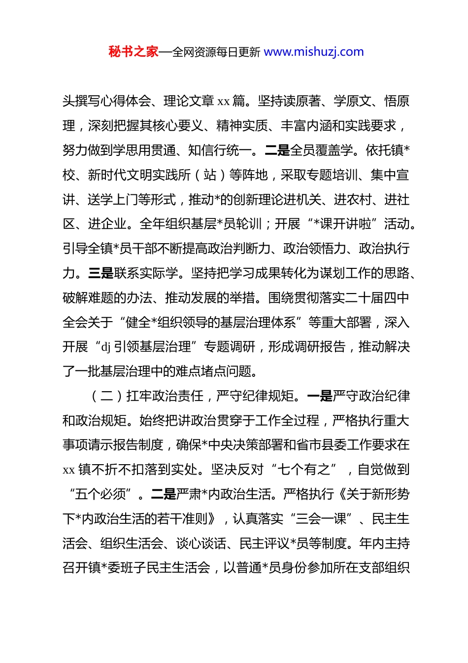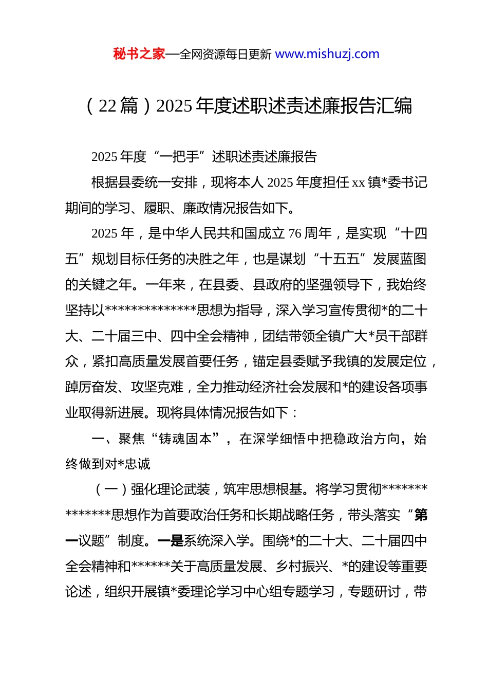 秘书之家—全网资源每日更新 www.mishuzj.com(22 篇)2025 年度述职述责述廉报告汇编2025 年度“一把手”述职述责述廉报告根据县委统一安排,现将本人 2025 年度担任 xx 镇*委书记期间的学习、履职、廉政情况报告如下。2025 年,是中华人民共和国成立 76 周年,是实现“十四五”规划目标任务的决胜之年,也是谋划“十五五”发展蓝图的关键之年。一年来,在县委、县政府的坚强领导下,我始终坚持以**************思想为指导,深入学习宣传贯彻*的二十大、二十届三中、四中全会精神,团结带领全镇广大*员干部群众,紧扣高质量发展首要任务,锚定县委赋予我镇的发展定位,踔厉奋发、攻坚克难,全力推动经济社会发展和*的建设各项事业取得新进展。现将具体情况报告如下:一、聚焦“铸魂固本”,在深学细悟中把稳政治方向,始终做到对*忠诚(一)强化理论武装,筑牢思想根基。将学习贯彻**************思想作为首要政治任务和长期战略任务,带头落实“第一议题”制度。一是系统深入学。围绕*的二十大、二十届四中全会精神和******关于高质量发展、乡村振兴、*的建设等重要论述,组织开展镇*委理论学习中心组专题学习,专题研讨,带秘书之家—全网资源每日更新 www.mishuzj.com头撰写心得体会、理论文章 xx 篇。坚持读原著、学原文、悟原理,深刻把握其核心要义、精神实质、丰富内涵和实践要求,努力做到学思用贯通、知信行统一。二是全员覆盖学。依托镇*校、新时代文明实践所(站)等阵地,采取专题培训、集中宣讲、送学上门等形式,推动*的创新理论进机关、进农村、进社区、进企业。全年组织基层*员轮训;开展“*课开讲啦”活动。引导全镇*员干部不断提高政治判断力、政治领悟力、政治执行力。三是联系实际学。坚持把学习成果转化为谋划工作的思路、破解难题的办法、推动发展的举措。围绕贯彻落实二十届四中全会关于“健全*组织领导的基层治理体系”等重大部署,深入开展“dj 引领基层治理”专题调研,形成调研报告,推动解决了一批基层治理中的难点堵点问题。(二)扛牢政治责任,严守纪律规矩。一是严守政治纪律和政治规矩。始终把讲政治贯穿于工作全过程,严格执行重大事项请示报告制度,确保*中央决策部署和省市县委工作要求在xx 镇不折不扣落到实处。坚决反对“七个有之”,自觉做到“五个必须”。二是严肃*内政治生活。严格执行《关于新形势下*内政治生活的若干准则》,认真落实“三会一课”、民主生活会、组织生活会、谈心谈话、民主评议*员等制度。年内主持召开镇*委班子民主生活会,以普通*员身份参加所在支部组织秘书之家—全网资源每日更新 www.mishuzj.com生活会,带头开展批评与自我批评,营造了健康纯洁的*内政治生态。三是抓牢意识形态工作。认真履行意识形态工作“第一责任人”职责,定期分析研判意识形态领域风险隐患,主持召开专题会议。加强宣传思想文化阵地建设和管理,密切关注网络舆情,妥善处置各类舆情 xx 起。大力弘扬社会主义核心价值观,开展各类群众性精神文明创建活动,牢牢掌握意识形态工作领导权主动权。(三)加强*的领导,凝聚发展合力。始终坚持和加强*的全面领导,充分发挥镇*委总揽全局、协调各方的领导核心作用。一是完善领导机制。修订完善《xx 镇*委议事规则》,规范“三重一大”事项决策程序,全年召开*委会 xx 次,研究决定重大事项 xx 项,确保科学决策、民主决策、依法决策。二是凝聚干事合力。严格执行民主集中制,注重听取班子成员、人大代表、政协委员和基层干部群众的意见建议。支持镇人大、政府依法依章程履行职能,密切同各民主*派、工商联和无*派人士的联系,工会、共青团、妇联等群团组织作用得到有效发挥,形成了同心同德、团结奋斗的良好局面。二、聚焦“主责主业”,在担当实干中推动高质量发展,竭力增进民生福祉(一)全力以赴抓经济、促发展,综合实力稳步提升。一秘书之家—全网资源每日更新 www.mishuzj.com是经济运行稳中有进。面对复杂严峻的宏观经济形势,加强经济运行调度分析,主要经济指标保持在合理区间。二是产业发展提质增效。坚决扛牢粮食安全政治责任,落实最严格的耕地保护制度。三...