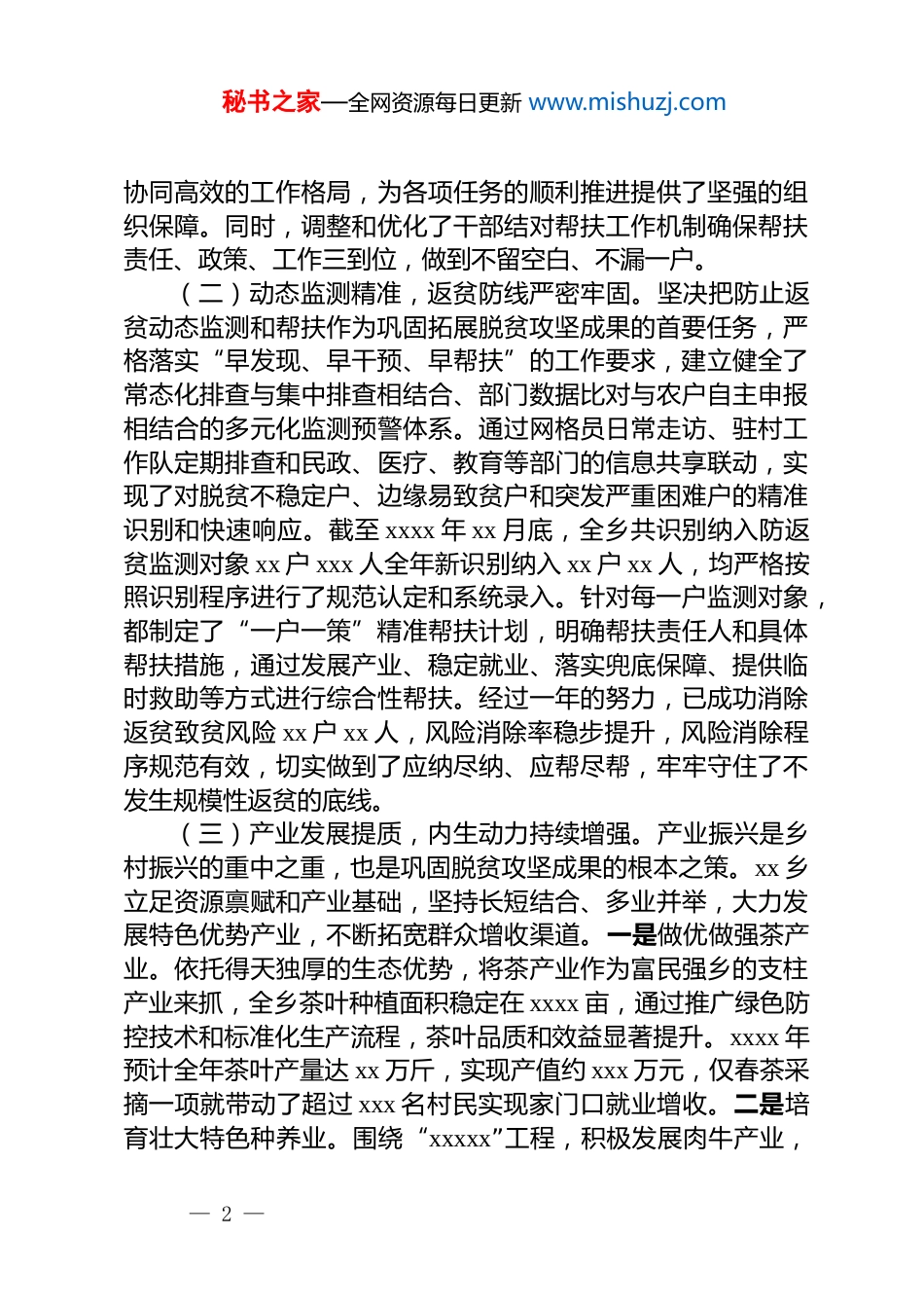 秘书之家—全网资源每日更新 www.mishuzj.com2025 年巩固拓展脱贫攻坚成果同乡村振兴有效衔接工作总结(镇乡)xxxx 年是“十四五”规划的收官之年,也是巩固拓展脱贫攻坚成果同乡村振兴有效衔接工作承上启下的关键一年。一年来,xx 乡*委、政府始终坚持以**************思想为指导,深入贯彻落实*的二十大和二十届历次全会精神,严格按照中央及省、市、县关于做好巩固拓展脱贫攻坚成果同乡村振兴有效衔接工作的决策部署,将此项工作作为首要政治任务和头号民生工程来抓,坚持目标不变、靶心不偏、力度不减,以高度的政治自觉和强烈的责任担当,推动各项政策举措落地见效,坚决守住了不发生规模性返贫的底线,为全乡高质量发展和乡村全面振兴奠定了坚实基础。现将全年工作总结如下。一、聚焦核心守牢底线,巩固拓展成果基础坚实xx 乡*委、政府深刻认识到巩固衔接工作的长期性、重要性和艰巨性,始终把责任扛在肩上、抓在手上,聚焦关键领域和薄弱环节,精准施策、持续发力,推动巩固拓展脱贫攻坚成果取得新成效,同乡村振兴的有效衔接迈出新步伐。(一)强化责任落实,组织领导坚强有力。始终坚持*对“三农”工作的全面领导,把巩固拓展脱贫攻坚成果摆在突出位置。乡*委、政府严格落实“四个不摘”要求,持续健全和完善“书记、乡长负总责,分管领导具体抓,包村领导抓落实,村‘两委’和驻村工作队一线推进”的责任体系。一年来,乡*委先后召开专题*委会、政府常务会、工作推进会等各类会议xx 余次,专题研究部署防返贫监测、产业发展、项目建设、资金管理等重点工作,及时解决工作中出现的难点堵点问题。通过层层传导压力、逐级压实责任,形成了上下贯通、齐抓共管、— 1 —秘书之家—全网资源每日更新 www.mishuzj.com协同高效的工作格局,为各项任务的顺利推进提供了坚强的组织保障。同时,调整和优化了干部结对帮扶工作机制确保帮扶责任、政策、工作三到位,做到不留空白、不漏一户。(二)动态监测精准,返贫防线严密牢固。坚决把防止返贫动态监测和帮扶作为巩固拓展脱贫攻坚成果的首要任务,严格落实“早发现、早干预、早帮扶”的工作要求,建立健全了常态化排查与集中排查相结合、部门数据比对与农户自主申报相结合的多元化监测预警体系。通过网格员日常走访、驻村工作队定期排查和民政、医疗、教育等部门的信息共享联动,实现了对脱贫不稳定户、边缘易致贫户和突发严重困难户的精准识别和快速响应。截至 xxxx 年 xx 月底,全乡共识别纳入防返贫监测对象 xx 户 xxx 人全年新识别纳入 xx 户 xx 人,均严格按照识别程序进行了规范认定和系统录入。针对每一户监测对象,都制定了“一户一策”精准帮扶计划,明确帮扶责任人和具体帮扶措施,通过发展产业、稳定就业、落实兜底保障、提供临时救助等方式进行综合性帮扶。经过一年的努力,已成功消除返贫致贫风险 xx 户 xx 人,风险消除率稳步提升,风险消除程序规范有效,切实做到了应纳尽纳、应帮尽帮,牢牢守住了不发生规模性返贫的底线。(三)产业发展提质,内生动力持续增强。产业振兴是乡村振兴的重中之重,也是巩固脱贫攻坚成果的根本之策。xx 乡立足资源禀赋和产业基础,坚持长短结合、多业并举,大力发展特色优势产业,不断拓宽群众增收渠道。一是做优做强茶产业。依托得天独厚的生态优势,将茶产业作为富民强乡的支柱产业来抓,全乡茶叶种植面积稳定在 xxxx 亩,通过推广绿色防控技术和标准化生产流程,茶叶品质和效益显著提升。xxxx 年预计全年茶叶产量达 xx 万斤,实现产值约 xxx 万元,仅春茶采摘一项就带动了超过 xxx 名村民实现家门口就业增收。二是培育壮大特色种养业。围绕“xxxxx”工程,积极发展肉牛产业,— 2 —秘书之家—全网资源每日更新 www.mishuzj.com通过鼓励合作社规模化经营和支持养殖大户、家庭散养等多种模式,带动群众稳定增收。同时,大力发展烤烟、油茶、中药材、蔬菜等特色种植业,其中烤烟产业带动就业 xxx 余人,争取并投入农业产业发展资金 xx 万元用于蔬菜种植和粉类加工厂建设推动了农业产业结构的优化升级。三是创新利益联结机制。全面推广“*...