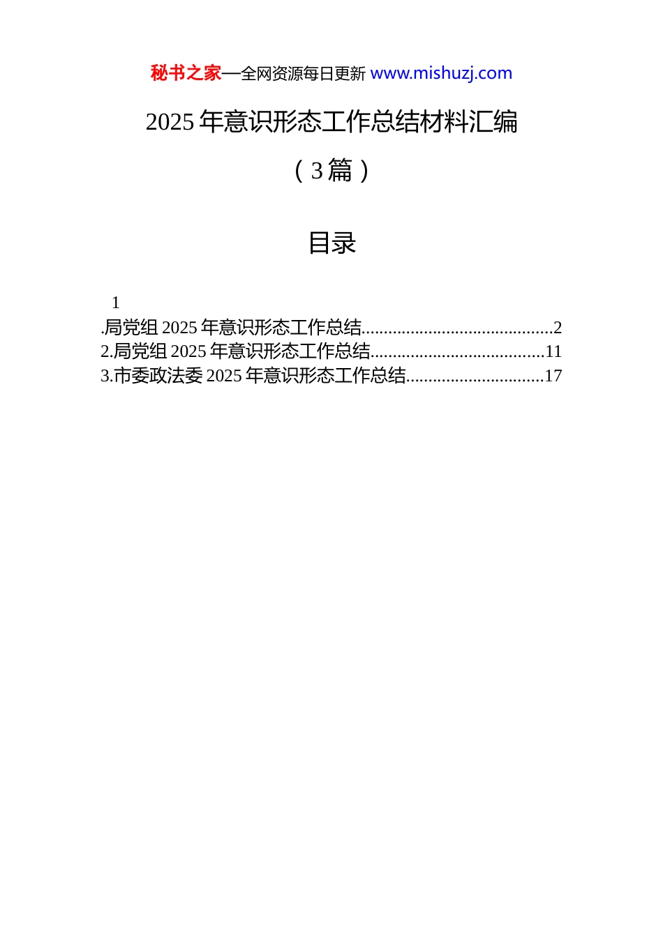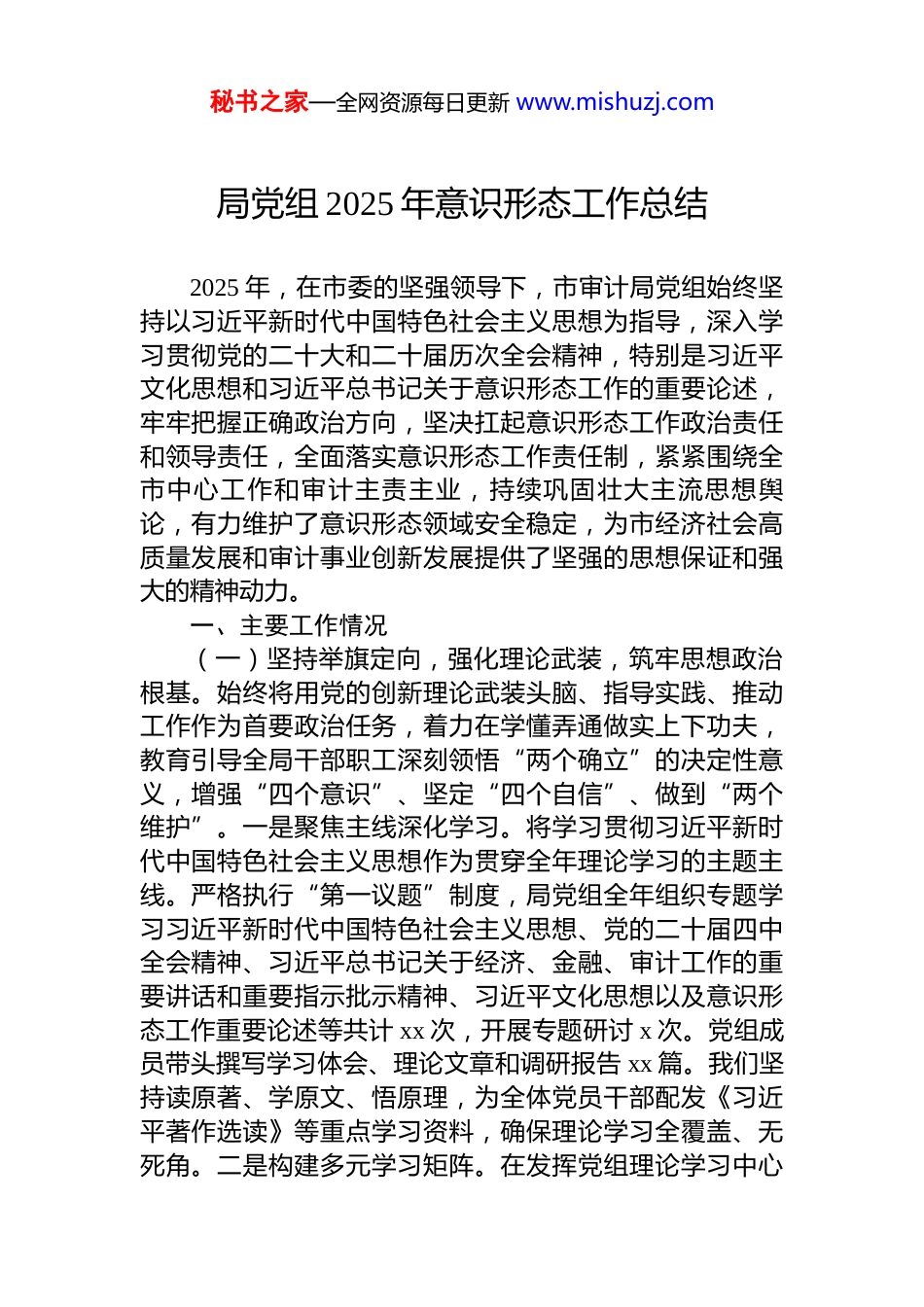 秘书之家—全网资源每日更新 www.mishuzj.com2025 年意识形态工作总结材料汇编(3 篇)目录1.局党组 2025 年意识形态工作总结...........................................22.局党组 2025 年意识形态工作总结.......................................113.市委政法委 2025 年意识形态工作总结...............................17秘书之家—全网资源每日更新 www.mishuzj.com局党组 2025 年意识形态工作总结2025 年,在市委的坚强领导下,市审计局党组始终坚持以习近平新时代中国特色社会主义思想为指导,深入学习贯彻党的二十大和二十届历次全会精神,特别是习近平文化思想和习近平总书记关于意识形态工作的重要论述,牢牢把握正确政治方向,坚决扛起意识形态工作政治责任和领导责任,全面落实意识形态工作责任制,紧紧围绕全市中心工作和审计主责主业,持续巩固壮大主流思想舆论,有力维护了意识形态领域安全稳定,为市经济社会高质量发展和审计事业创新发展提供了坚强的思想保证和强大的精神动力。一、主要工作情况(一)坚持举旗定向,强化理论武装,筑牢思想政治根基。始终将用党的创新理论武装头脑、指导实践、推动工作作为首要政治任务,着力在学懂弄通做实上下功夫,教育引导全局干部职工深刻领悟“两个确立”的决定性意义,增强“四个意识”、坚定“四个自信”、做到“两个维护”。一是聚焦主线深化学习。将学习贯彻习近平新时代中国特色社会主义思想作为贯穿全年理论学习的主题主线。严格执行“第一议题”制度,局党组全年组织专题学习习近平新时代中国特色社会主义思想、党的二十届四中全会精神、习近平总书记关于经济、金融、审计工作的重要讲话和重要指示批示精神、习近平文化思想以及意识形态工作重要论述等共计 xx 次,开展专题研讨 x 次。党组成员带头撰写学习体会、理论文章和调研报告 xx 篇。我们坚持读原著、学原文、悟原理,为全体党员干部配发《习近平著作选读》等重点学习资料,确保理论学习全覆盖、无死角。二是构建多元学习矩阵。在发挥党组理论学习中心秘书之家—全网资源每日更新 www.mishuzj.com组“领头雁”作用的同时,创新学习载体和形式。一是打造“审计大讲堂”,邀请市委党校专家、高校学者、上级审计机关领导围绕党的创新理论、宏观形势政策、意识形态动态等进行专题辅导 x 场。二是组建局内青年理论学习小组和“审计宣讲轻骑兵”,结合审计实践,深入审计一线、共建社区、被审计单位开展分众化、互动式理论宣讲和法规政策解读 xx 余场次。三是充分运用“学习强国”学习平台、审计署及省市干部教育网络学院等线上资源,组织线上知识竞赛、学习积分评比等活动 x 次,评选“学习标兵”xx 名,营造比学赶超的浓厚氛围。全年组织各类线上线下学习活动参与人次超 xxxx。三是推动学习成果转化。大力弘扬理论联系实际的学风,坚持把研究和解决审计工作中面临的重大问题作为理论学习的出发点和落脚点。围绕贯彻落实党的二十届四中全会关于健全党和国家监督体系的部署要求,组织开展“强化审计监督,服务治理现代化”专题调研和大讨论,形成高质量调研报告 x 篇,其中 x篇获市委市政府领导批示。将理论学习成果转化为完善审计制度机制、创新审计技术方法、提升审计监督效能的具体举措,推动党的创新理论在审计实践中落地生根、开花结果。(二)压紧压实责任,健全制度机制,构建齐抓共管格局。牢固树立“抓意识形态工作是本职、不抓是失职、抓不好是渎职”的理念,不断完善责任体系,推动意识形态工作责任制落地落实。一是强化组织领导。局党组切实履行主体责任,党组书记认真履行第一责任人职责,坚持(带头抓意识形态工作、带头管阵地把导向强队伍、带头批评错误观点和错误倾向),做到重要工作亲自部署、重要问题亲自过问、重大事件亲自处置。全年主持召开党组会议专题研究意识形态工作 x 次,分析研判意识形态领域风险 x 次。分管领导履行直接责任,班子其他成员履行“一岗双责”,抓好分管领域意识形态工作。修订完善《市审计秘书之家—全网资源每日更新 www.mishuzj.com局党组意识形态工作责任制实施细则》,制定...