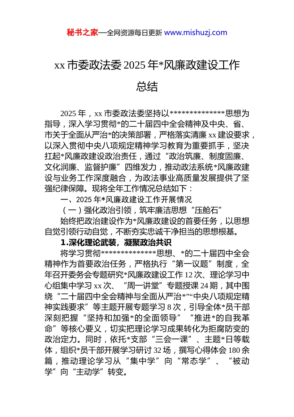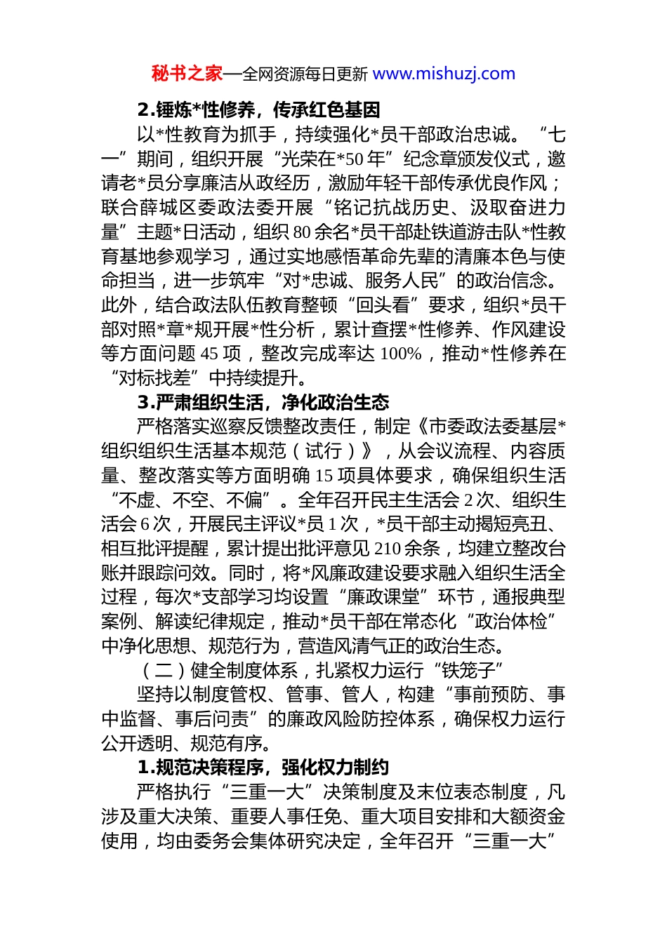 秘书之家—全网资源每日更新 www.mishuzj.comxx 市委政法委 2025 年*风廉政建设工作总结2025 年,xx 市委政法委坚持以**************思想为指导,深入学习贯彻*的二十届四中全会精神及中央、省、市关于全面从严治*的决策部署,严格落实清廉 xx 建设要求,以深入贯彻中央八项规定精神学习教育为重要抓手,坚决扛起*风廉政建设政治责任,通过“政治筑廉、制度固廉、文化润廉、监督护廉”四维发力,推动政法系统*风廉政建设与业务工作深度融合,为政法事业高质量发展提供了坚强纪律保障。现将全年工作情况总结如下:一、2025 年*风廉政建设工作开展情况(一)强化政治引领,筑牢廉洁思想“压舱石”始终把政治建设作为*风廉政建设的首要任务,以思想自觉引领行动自觉,不断夯实忠诚干净担当的思想根基。1.深化理论武装,凝聚政治共识将学习贯彻**************思想、*的二十届四中全会精神作为首要政治任务,严格执行“第一议题”制度,全年召开委务会专题研究*风廉政建设工作 12 次、理论学习中心组集中学习 xx 次、“周一讲堂”专题授课 24 期,其中围绕“二十届四中全会精神与全面从严治*”“中央八项规定精神实践要求”等主题开展专题学习 8 次,引导全体*员干部深刻把握“坚持和加强*的全面领导”“推进*的自我革命”等核心要义,切实把理论学习成果转化为拒腐防变的政治定力。同时,依托*支部“三会一课”、主题*日等载体,组织*员干部开展学习研讨 32 场,撰写心得体会 180 余篇,推动理论学习从“集中学”向“常态学”、“被动学”向“主动学”转变。秘书之家—全网资源每日更新 www.mishuzj.com2.锤炼*性修养,传承红色基因以*性教育为抓手,持续强化*员干部政治忠诚。“七一”期间,组织开展“光荣在*50 年”纪念章颁发仪式,邀请老*员分享廉洁从政经历,激励年轻干部传承优良作风;联合薛城区委政法委开展“铭记抗战历史、汲取奋进力量”主题*日活动,组织 80 余名*员干部赴铁道游击队*性教育基地参观学习,通过实地感悟革命先辈的清廉本色与使命担当,进一步筑牢“对*忠诚、服务人民”的政治信念。此外,结合政法队伍教育整顿“回头看”要求,组织*员干部对照*章*规开展*性分析,累计查摆*性修养、作风建设等方面问题 45 项,整改完成率达 100%,推动*性修养在“对标找差”中持续提升。3.严肃组织生活,净化政治生态严格落实巡察反馈整改责任,制定《市委政法委基层*组织组织生活基本规范(试行)》,从会议流程、内容质量、整改落实等方面明确 15 项具体要求,确保组织生活“不虚、不空、不偏”。全年召开民主生活会 2 次、组织生活会 6 次,开展民主评议*员 1 次,*员干部主动揭短亮丑、相互批评提醒,累计提出批评意见 210 余条,均建立整改台账并跟踪问效。同时,将*风廉政建设要求融入组织生活全过程,每次*支部学习均设置“廉政课堂”环节,通报典型案例、解读纪律规定,推动*员干部在常态化“政治体检”中净化思想、规范行为,营造风清气正的政治生态。(二)健全制度体系,扎紧权力运行“铁笼子”坚持以制度管权、管事、管人,构建“事前预防、事中监督、事后问责”的廉政风险防控体系,确保权力运行公开透明、规范有序。1.规范决策程序,强化权力制约严格执行“三重一大”决策制度及末位表态制度,凡涉及重大决策、重要人事任免、重大项目安排和大额资金使用,均由委务会集体研究决定,全年召开“三重一大”秘书之家—全网资源每日更新 www.mishuzj.com事项决策会议 18 次,邀请派驻纪检监察组全程列席指导,确保决策过程合法合规、公开透明。同时,建立“班子成员履行全面从严治*责任清单”,明确 12 项主体责任、8 项监督责任,委务会每季度听取班子成员责任落实情况汇报全年开展责任落实督查 4 次,发现并整改责任传导不到位问题 6 项,推动全面从严治*责任层层压实。2.落实廉政机制,防范风险隐患深入落实*风廉政建设“十个一”工作机制(即制定一份责任清单、开展一次廉政谈话、组织一次风险排查等)全年组织专题部署会议 4 次,精准运用监督执纪“第一种形态”,对苗头性、倾向性问题早提醒、早纠正,累...