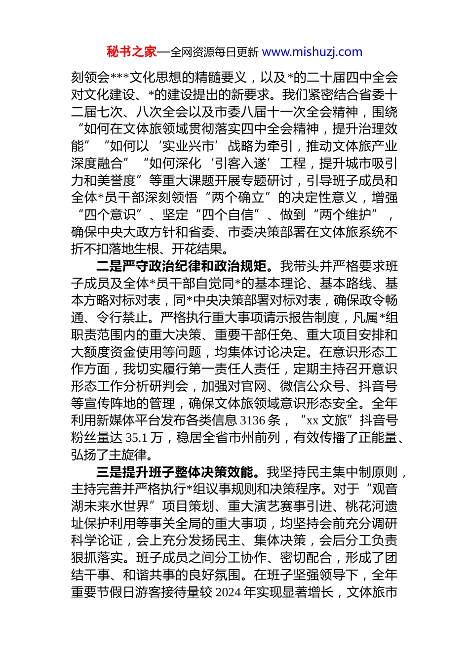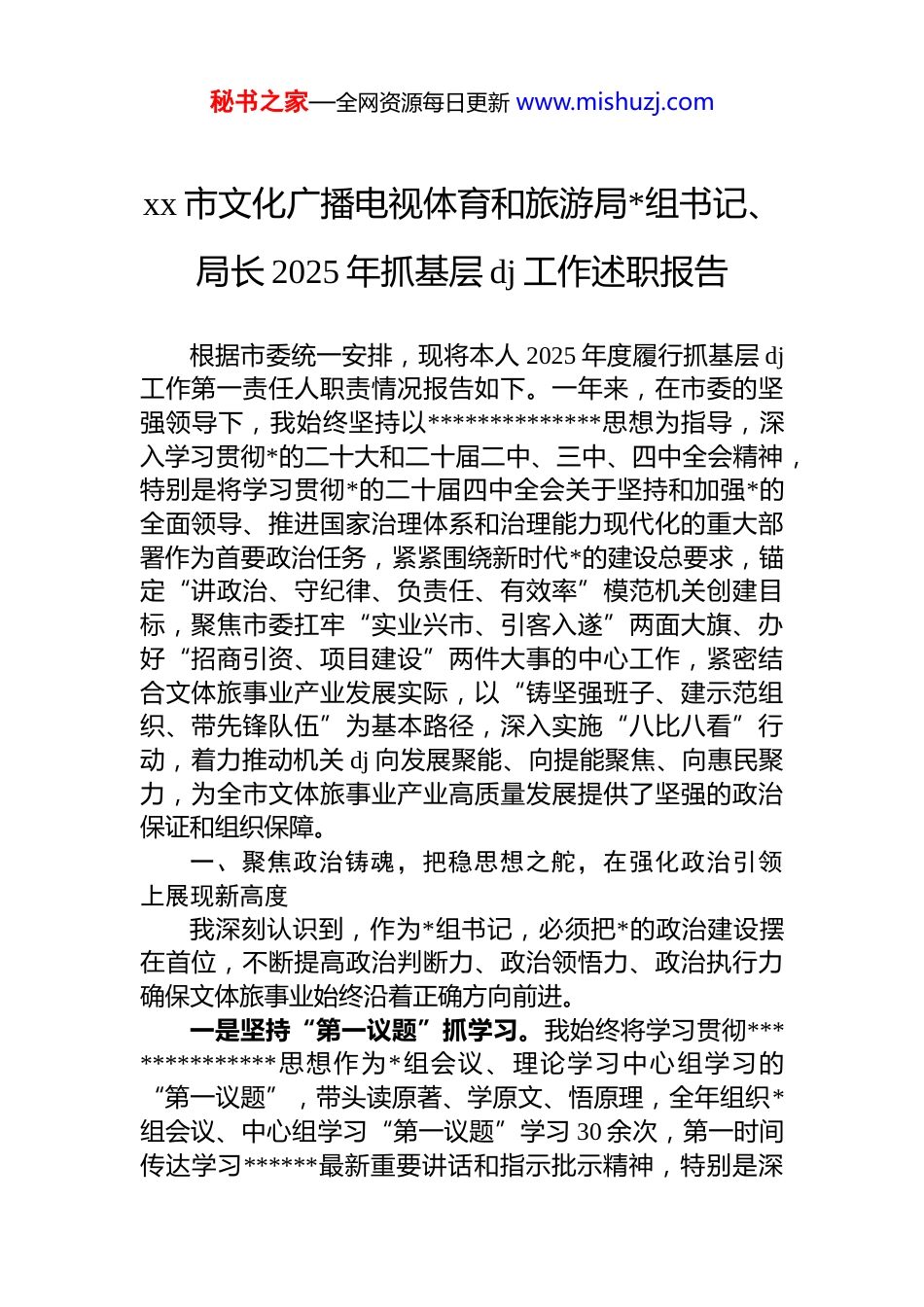 秘书之家—全网资源每日更新 www.mishuzj.comxx 市文化广播电视体育和旅游局*组书记、局长 2025 年抓基层 dj 工作述职报告根据市委统一安排,现将本人 2025 年度履行抓基层 dj工作第一责任人职责情况报告如下。一年来,在市委的坚强领导下,我始终坚持以**************思想为指导,深入学习贯彻*的二十大和二十届二中、三中、四中全会精神,特别是将学习贯彻*的二十届四中全会关于坚持和加强*的全面领导、推进国家治理体系和治理能力现代化的重大部署作为首要政治任务,紧紧围绕新时代*的建设总要求,锚定“讲政治、守纪律、负责任、有效率”模范机关创建目标,聚焦市委扛牢“实业兴市、引客入遂”两面大旗、办好“招商引资、项目建设”两件大事的中心工作,紧密结合文体旅事业产业发展实际,以“铸坚强班子、建示范组织、带先锋队伍”为基本路径,深入实施“八比八看”行动,着力推动机关 dj 向发展聚能、向提能聚焦、向惠民聚力,为全市文体旅事业产业高质量发展提供了坚强的政治保证和组织保障。一、聚焦政治铸魂,把稳思想之舵,在强化政治引领上展现新高度我深刻认识到,作为*组书记,必须把*的政治建设摆在首位,不断提高政治判断力、政治领悟力、政治执行力确保文体旅事业始终沿着正确方向前进。一是坚持“第一议题”抓学习。我始终将学习贯彻**************思想作为*组会议、理论学习中心组学习的“第一议题”,带头读原著、学原文、悟原理,全年组织*组会议、中心组学习“第一议题”学习 30 余次,第一时间传达学习******最新重要讲话和指示批示精神,特别是深秘书之家—全网资源每日更新 www.mishuzj.com刻领会***文化思想的精髓要义,以及*的二十届四中全会对文化建设、*的建设提出的新要求。我们紧密结合省委十二届七次、八次全会以及市委八届十一次全会精神,围绕“如何在文体旅领域贯彻落实四中全会精神,提升治理效能”“如何以‘实业兴市’战略为牵引,推动文体旅产业深度融合”“如何深化‘引客入遂’工程,提升城市吸引力和美誉度”等重大课题开展专题研讨,引导班子成员和全体*员干部深刻领悟“两个确立”的决定性意义,增强“四个意识”、坚定“四个自信”、做到“两个维护”,确保中央大政方针和省委、市委决策部署在文体旅系统不折不扣落地生根、开花结果。二是严守政治纪律和政治规矩。我带头并严格要求班子成员及全体*员干部自觉同*的基本理论、基本路线、基本方略对标对表,同*中央决策部署对标对表,确保政令畅通、令行禁止。严格执行重大事项请示报告制度,凡属*组职责范围内的重大决策、重要干部任免、重大项目安排和大额度资金使用等问题,均集体讨论决定。在意识形态工作方面,我切实履行第一责任人责任,定期主持召开意识形态工作分析研判会,加强对官网、微信公众号、抖音号等宣传阵地的管理,确保文体旅领域意识形态安全。全年利用新媒体平台发布各类信息 3136 条,“xx 文旅”抖音号粉丝量达 35.1 万,稳居全省市州前列,有效传播了正能量、弘扬了主旋律。三是提升班子整体决策效能。我坚持民主集中制原则,主持完善并严格执行*组议事规则和决策程序。对于“观音湖未来水世界”项目策划、重大演艺赛事引进、桃花河遗址保护利用等事关全局的重大事项,均坚持会前充分调研科学论证,会上充分发扬民主、集体决策,会后分工负责狠抓落实。班子成员之间分工协作、密切配合,形成了团结干事、和谐共事的良好氛围。在班子坚强领导下,全年重要节假日游客接待量较 2024 年实现显著增长,文体旅市秘书之家—全网资源每日更新 www.mishuzj.com场复苏势头强劲,班子的领导核心作用得到充分发挥。二、聚焦固本强基,筑牢战斗堡垒,在夯实组织基础上实现新突破我牢固树立大抓基层的鲜明导向,着力增强基层*组织的政治功能和组织功能,推动基层*组织全面进步、全面过硬。一是扎实推进*支部标准化规范化建设。我高度重视基层*支部建设,将其纳入*组重要议事日程,定期研究部署。以*支部“评星定级”为抓手,持续推进标准化规范化建设,同时加强对软弱涣散*组织的指导和整顿转化,确保一个支部就是一个堡垒。严格落实“三会一课”、组织生...