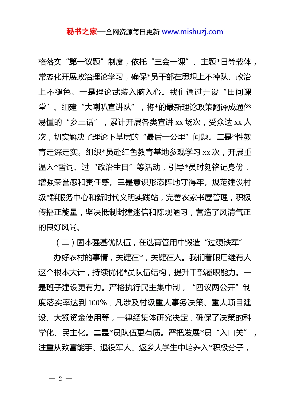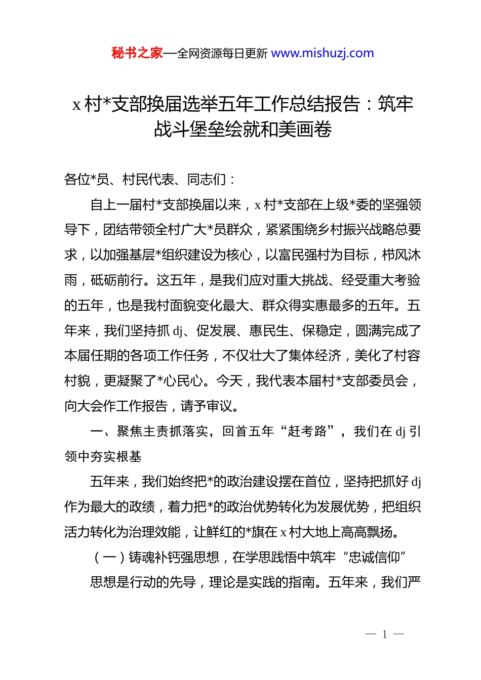 秘书之家—全网资源每日更新 www.mishuzj.comx 村*支部换届选举五年工作总结报告:筑牢战斗堡垒绘就和美画卷各位*员、村民代表、同志们:自上一届村*支部换届以来,x 村*支部在上级*委的坚强领导下,团结带领全村广大*员群众,紧紧围绕乡村振兴战略总要求,以加强基层*组织建设为核心,以富民强村为目标,栉风沐雨,砥砺前行。这五年,是我们应对重大挑战、经受重大考验的五年,也是我村面貌变化最大、群众得实惠最多的五年。五年来,我们坚持抓 dj、促发展、惠民生、保稳定,圆满完成了本届任期的各项工作任务,不仅壮大了集体经济,美化了村容村貌,更凝聚了*心民心。今天,我代表本届村*支部委员会,向大会作工作报告,请予审议。一、聚焦主责抓落实,回首五年“赶考路”,我们在 dj 引领中夯实根基五年来,我们始终把*的政治建设摆在首位,坚持把抓好 dj作为最大的政绩,着力把*的政治优势转化为发展优势,把组织活力转化为治理效能,让鲜红的*旗在 x 村大地上高高飘扬。(一)铸魂补钙强思想,在学思践悟中筑牢“忠诚信仰”思想是行动的先导,理论是实践的指南。五年来,我们严— 1 —秘书之家—全网资源每日更新 www.mishuzj.com格落实“第一议题”制度,依托“三会一课”、主题*日等载体,常态化开展政治理论学习,确保*员干部在思想上不掉队、政治上不褪色。一是理论武装入脑入心。我们通过开设“田间课堂”、组建“大喇叭宣讲队”,将*的最新理论政策翻译成通俗易懂的“乡土话”,累计开展各类宣讲 xx 场次,受众达 xx 人次,切实解决了理论下基层的“最后一公里”问题。二是*性教育走深走实。组织*员赴红色教育基地参观学习 xx 次,开展重温入*誓词、过“政治生日”等活动,引导*员时刻铭记身份,增强荣誉感和责任感。三是意识形态阵地守得牢。规范建设村级*群服务中心和新时代文明实践站,完善农家书屋管理,积极传播正能量,坚决抵制封建迷信和陈规陋习,营造了风清气正的良好风尚。(二)固本强基优队伍,在选育管用中锻造“过硬铁军”办好农村的事情,关键在*,关键在人。我们着眼后继有人这个根本大计,持续优化*员队伍结构,提升干部履职能力。一是班子建设更有力。严格执行民主集中制,“四议两公开”制度落实率达到 100%,凡涉及村级重大事务决策、重大项目建设、大额资金使用等,一律经集体研究决定,确保了决策的科学化、民主化。二是*员队伍更有质。严把发展*员“入口关”,注重从致富能手、退役军人、返乡大学生中培养入*积极分子,— 2 —秘书之家—全网资源每日更新 www.mishuzj.com五年来共发展新*员 xx 名,培养入*积极分子 xx 名,*员队伍平均年龄下降了 xx 岁,大专以上学历占比提高了 xx%,有效改善了*员队伍老龄化、结构单一的问题。三是先锋作用更凸显。设立*员责任区 xx 个、*员示范岗 xx 个,在防汛抗旱、环境整治等急难险重任务中,*员干部总是冲锋在前,用实际行动叫响了“我是*员我先上”的口号。(三)织网划格精治理,在服务群众中架起“连心桥梁”针对乡村治理难点痛点,我们创新治理模式,推动治理重心下移,实现了从“管理”向“服务”的转变。一是网格管理全覆盖。构建了“村*支部—网格*小组—*员中心户”的组织体系,将全村划分为 xx 个网格,配备 xx 名专兼职网格员,实现了“人在格中走,事在格中办”,累计化解邻里纠纷 xx 余起,做到小事不出村、大事不出镇。二是便民服务零距离。推行“一站式”服务和代办制度,针对行动不便的老年人和残疾人,提供上门办理社保认证、医保缴费等服务 xx 余次,真正把方便留给群众,把麻烦留给自己。三是村务监督无死角。充分发挥村务监督委员会作用,定期公开村级财务收支明细,设立“回音壁”,及时回应群众关切,让权力在阳光下运行,干群关系更加融洽和谐。二、攻坚克难促发展,干好五年“实在活”,我们在乡村— 3 —秘书之家—全网资源每日更新 www.mishuzj.com振兴中破题出彩五年来,我们始终把发展作为第一要务,立足本村资源禀赋,盘活沉睡资产,改善人居环境,培育文明乡风,努力让农业强起来、农村美起来、农民富起来。(一)产业赋能增...