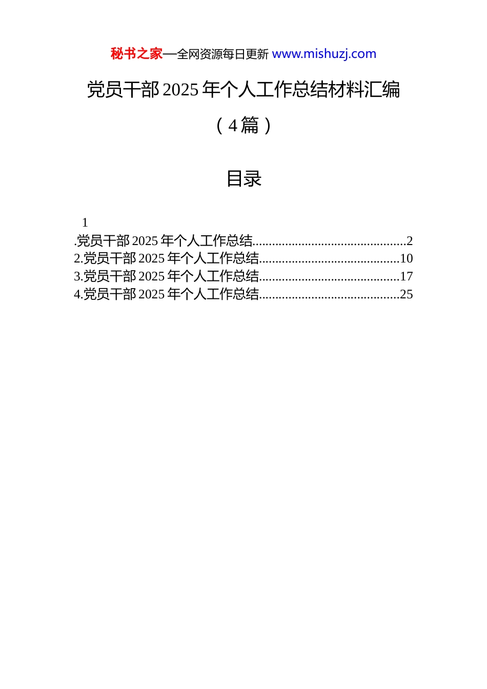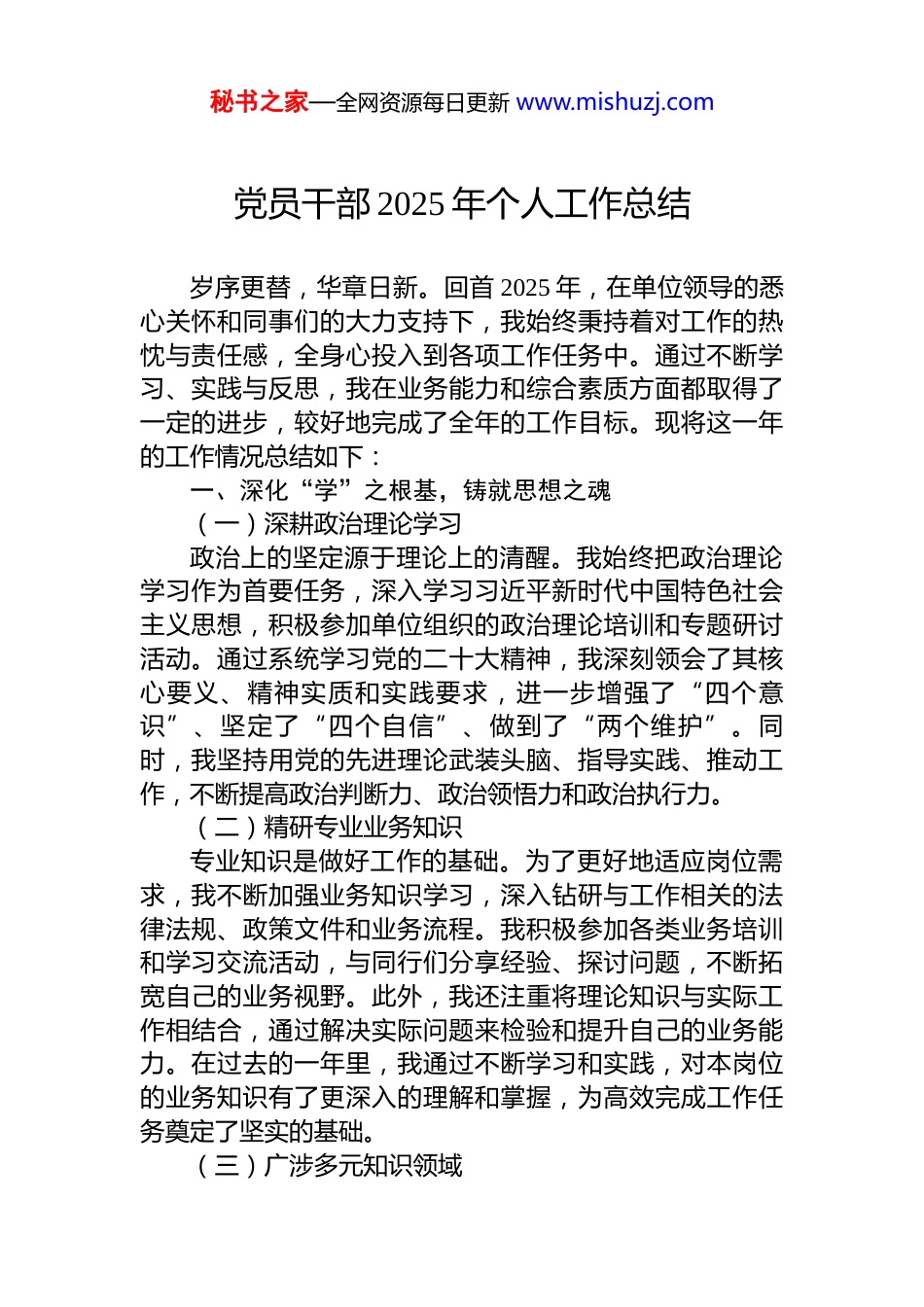 秘书之家—全网资源每日更新 www.mishuzj.com党员干部 2025 年个人工作总结材料汇编(4 篇)目录1.党员干部 2025 年个人工作总结...............................................22.党员干部 2025 年个人工作总结...........................................103.党员干部 2025 年个人工作总结...........................................174.党员干部 2025 年个人工作总结...........................................25秘书之家—全网资源每日更新 www.mishuzj.com党员干部 2025 年个人工作总结岁序更替,华章日新。回首 2025 年,在单位领导的悉心关怀和同事们的大力支持下,我始终秉持着对工作的热忱与责任感,全身心投入到各项工作任务中。通过不断学习、实践与反思,我在业务能力和综合素质方面都取得了一定的进步,较好地完成了全年的工作目标。现将这一年的工作情况总结如下:一、深化“学”之根基,铸就思想之魂(一)深耕政治理论学习政治上的坚定源于理论上的清醒。我始终把政治理论学习作为首要任务,深入学习习近平新时代中国特色社会主义思想,积极参加单位组织的政治理论培训和专题研讨活动。通过系统学习党的二十大精神,我深刻领会了其核心要义、精神实质和实践要求,进一步增强了“四个意识”、坚定了“四个自信”、做到了“两个维护”。同时,我坚持用党的先进理论武装头脑、指导实践、推动工作,不断提高政治判断力、政治领悟力和政治执行力。(二)精研专业业务知识专业知识是做好工作的基础。为了更好地适应岗位需求,我不断加强业务知识学习,深入钻研与工作相关的法律法规、政策文件和业务流程。我积极参加各类业务培训和学习交流活动,与同行们分享经验、探讨问题,不断拓宽自己的业务视野。此外,我还注重将理论知识与实际工作相结合,通过解决实际问题来检验和提升自己的业务能力。在过去的一年里,我通过不断学习和实践,对本岗位的业务知识有了更深入的理解和掌握,为高效完成工作任务奠定了坚实的基础。(三)广涉多元知识领域秘书之家—全网资源每日更新 www.mishuzj.com在当今知识爆炸的时代,只有不断学习新知识、新技能,才能跟上时代发展的步伐。我充分认识到这一点,积极拓宽学习领域,广泛涉猎经济、管理、文化等方面的知识。通过阅读相关书籍、文章和参加线上课程等方式,我不断丰富自己的知识储备,培养了自己的综合素养。这些多元知识的积累不仅有助于我更好地理解和把握工作中的各种问题,还为我提供了更多的创新思路和方法。二、提升“能”之素养,增强履职本领(一)锤炼沟通协调能力沟通协调是做好工作的重要保障。在工作中,我注重与同事、上级领导和服务对象进行有效的沟通和交流。我学会了倾听他人的意见和建议,尊重他人的观点和感受,以开放、包容的心态与他人合作。在与同事协作完成工作任务时,我能够及时沟通工作进展情况,协调解决工作中出现的问题,确保工作顺利进行。同时,我还积极与上级领导沟通汇报工作,及时了解工作要求和任务安排,为工作的开展提供了有力的指导。在与服务对象沟通时,我始终保持热情、耐心的态度,认真解答他们的疑问,积极为他们解决实际问题,赢得了服务对象的好评。(二)锻造文字写作能力文字写作是机关工作中不可或缺的一项技能。为了提高自己的文字写作水平,我注重日常积累,多读优秀的公文、新闻报道和文学作品,学习他人的写作技巧和表达方式。同时,我积极参加单位组织的公文写作培训和比赛活动,不断锻炼自己的写作能力。在实际工作中,我认真撰写各类公文、报告和信息,注重文字的准确性、规范性和逻辑性。通过不断努力,我的文字写作能力有了明显提高,能够高质量地完成各类文字材料的撰写任务。(三)培育应急处理能力在工作中,难免会遇到一些突发情况和紧急任务。为了提高自己应对突发事件的能力,我积极参加单位组织的秘书之家—全网资源每日更新 www.mishuzj.com应急培训和演练活动,学习应急处理的基本知识和技能。我了解了突发事件的特点和应对原则,掌握了应急处置的基本流程和方法。在实际工作中,当遇到突发情况时,我能够保持冷静,迅速分析问题,采...