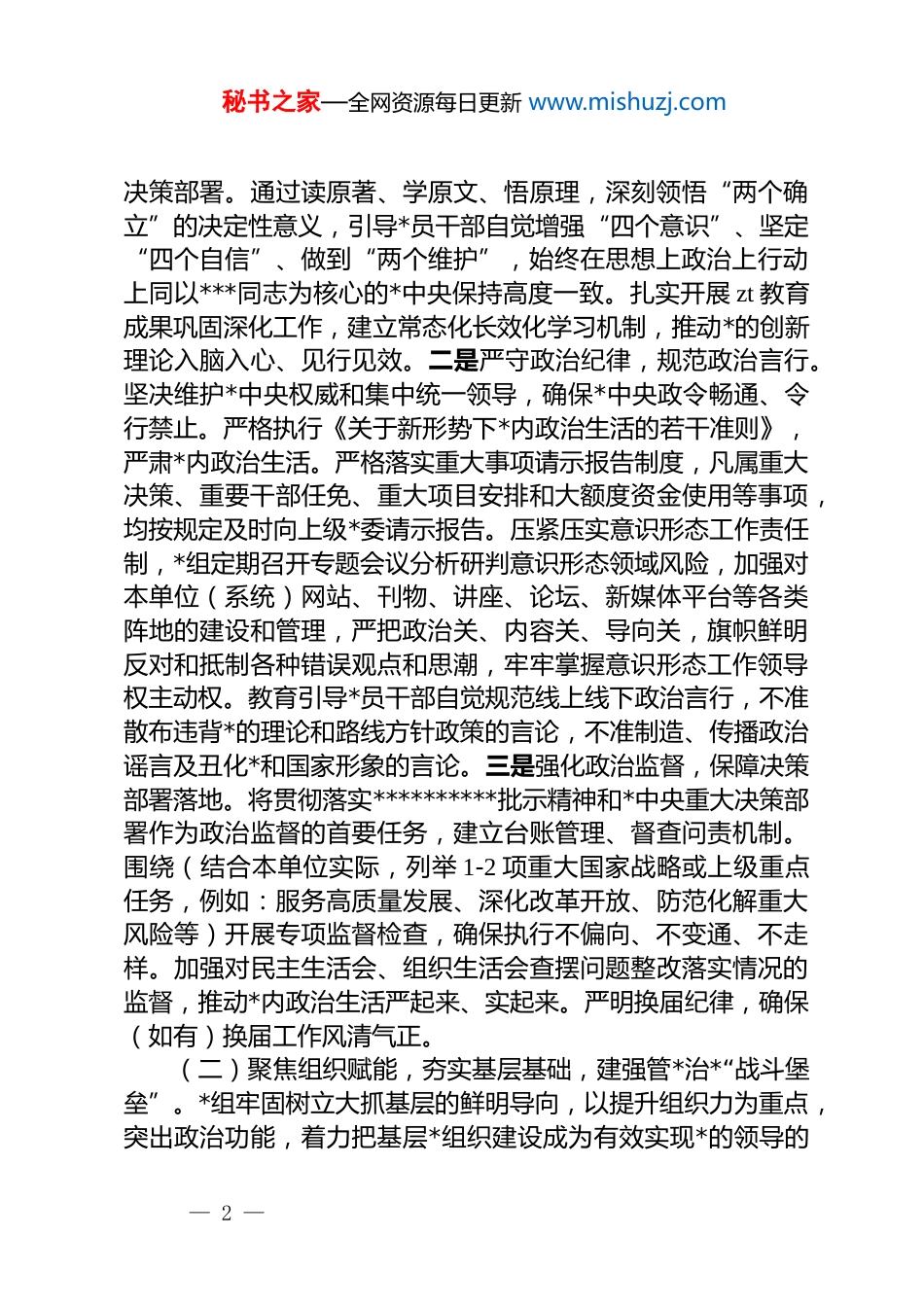 秘书之家—全网资源每日更新 www.mishuzj.com*组 2025 年全面从严治*工作总结暨 2026 年工作计划报告2025 年是中华人民共和国成立 76 周年,是实施“十四五”规划的攻坚之年,也是我单位(或系统)深化改革、加快发展的关键一年。一年来,在(上级*委名称)的坚强领导和有力指导下,我*组坚持以**************思想为指导,深入贯彻落实*的二十大及历次全会精神,全面落实*中央关于全面从严治*战略方针以及上级*委的系列决策部署,坚决扛起管*治*政治责任,将严的基调、严的措施、严的氛围长期坚持下去,推动全面从严治*向纵深发展、向基层延伸,为圆满完成年度各项任务目标、开创事业发展新局面提供了坚强有力的政治引领、思想保证和组织支撑。现将全年全面从严治*工作情况总结及 2026 年工作计划报告如下:一、2025 年度全面从严治*工作总结(一)聚焦“两个维护”,铸牢政治忠诚,把稳管*治*“方向盘”。*组深刻认识到,全面从严治*首先要从政治上看、从政治上抓。我们始终将*的政治建设摆在首位,教育引导全体*员干部不断提高政治判断力、政治领悟力、政治执行力,确保事业发展始终沿着正确政治方向前进。一是强化理论武装,夯实思想根基。坚持将学习贯彻**************思想作为首要政治任务和长期战略任务,构建并完善以*组理论学习中心组学习为龙头,以“三会一课”、主题*日、专题培训、在线学习等为支撑的多层次、立体化学习体系。全年组织召开*组理论学习中心组学习会 xx 次,其中专题研讨 xx 次,深入学习*的创新理论,特别是关于*的建设、全面从严治*、本领域本行业的重要论述和指示批示精神,及时跟进学习*中央最新重要会议精神和重大— 1 —秘书之家—全网资源每日更新 www.mishuzj.com决策部署。通过读原著、学原文、悟原理,深刻领悟“两个确立”的决定性意义,引导*员干部自觉增强“四个意识”、坚定“四个自信”、做到“两个维护”,始终在思想上政治上行动上同以***同志为核心的*中央保持高度一致。扎实开展 zt 教育成果巩固深化工作,建立常态化长效化学习机制,推动*的创新理论入脑入心、见行见效。二是严守政治纪律,规范政治言行。坚决维护*中央权威和集中统一领导,确保*中央政令畅通、令行禁止。严格执行《关于新形势下*内政治生活的若干准则》,严肃*内政治生活。严格落实重大事项请示报告制度,凡属重大决策、重要干部任免、重大项目安排和大额度资金使用等事项,均按规定及时向上级*委请示报告。压紧压实意识形态工作责任制,*组定期召开专题会议分析研判意识形态领域风险,加强对本单位(系统)网站、刊物、讲座、论坛、新媒体平台等各类阵地的建设和管理,严把政治关、内容关、导向关,旗帜鲜明反对和抵制各种错误观点和思潮,牢牢掌握意识形态工作领导权主动权。教育引导*员干部自觉规范线上线下政治言行,不准散布违背*的理论和路线方针政策的言论,不准制造、传播政治谣言及丑化*和国家形象的言论。三是强化政治监督,保障决策部署落地。将贯彻落实**********批示精神和*中央重大决策部署作为政治监督的首要任务,建立台账管理、督查问责机制。围绕(结合本单位实际,列举 1-2 项重大国家战略或上级重点任务,例如:服务高质量发展、深化改革开放、防范化解重大风险等)开展专项监督检查,确保执行不偏向、不变通、不走样。加强对民主生活会、组织生活会查摆问题整改落实情况的监督,推动*内政治生活严起来、实起来。严明换届纪律,确保(如有)换届工作风清气正。(二)聚焦组织赋能,夯实基层基础,建强管*治*“战斗堡垒”。*组牢固树立大抓基层的鲜明导向,以提升组织力为重点,突出政治功能,着力把基层*组织建设成为有效实现*的领导的— 2 —秘书之家—全网资源每日更新 www.mishuzj.com坚强战斗堡垒。一是健全组织体系,提升覆盖质量。优化基层*组织设置,确保*的组织和工作全覆盖、无盲区。结合机构改革、业务调整等情况,及时新建、调整、撤销*支部,选优配强*支部书记。深化*支部标准化规范化建设,对照相关标准要求,开展达标创优活动,推动后进支部整顿提升,中间支部晋位升级,先进支部示范引领。全年完成 x...