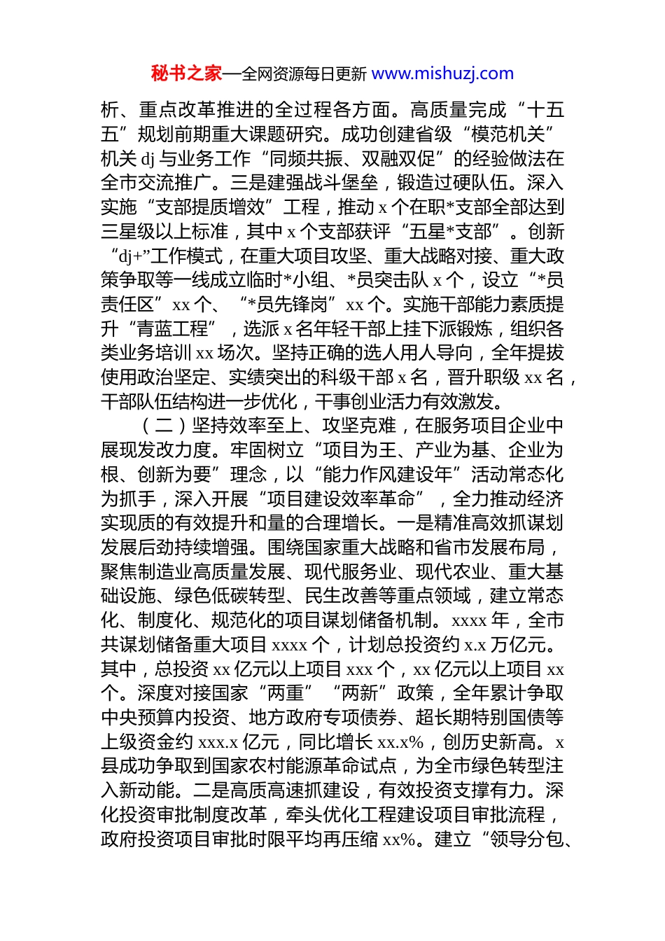 秘书之家—全网资源每日更新 www.mishuzj.com*组书记 2025 年述职述廉述工作总结xxxx 年,在市委、市政府的坚强领导下,我坚持以**************思想为指导,深入学习贯彻*的二十届四中全会精神及******视察我省重要讲话****,全面落实省委、市委各项决策部署,紧紧围绕高质量发展首要任务,认真履行*组书记抓 dj、*风廉政建设和推动发展改革工作的第一责任人职责,团结带领全委干部职工,锚定“两个确保”,深入实施“十大战略”,为勇做新时代高质量发展开路先锋贡献了发改力量。一、xxxx 年主要工作情况(一)坚持政治引领、固本强基,在服务中心大局中彰显发改高度。始终把对*忠诚作为首要政治原则,教育引导全委*员干部不断提高政治判断力、政治领悟力、政治执行力,确保发展改革工作始终沿着正确方向前进。一是强化理论武装,把稳思想之舵。严格落实“第一议题”制度将学习贯彻**************思想,特别是***经济思想和******重要讲话指示批示精神,作为*组会、中心组学习、支部学习的核心内容。全年组织*组理论学习中心组学习 xx 次,专题研讨 x 次。创新学习形式,举办“发改学堂”xx 期、“青年理论学习沙龙”x 期,开展“循迹溯源、感恩奋进”现场教学 x 次,引导*员干部深刻领悟“两个确立”的决定性意义,增强“四个意识”、坚定“四个自信”、做到“两个维护”,自觉在思想上政治上行动上同*中央保持高度一致。二是加强*的领导,筑牢政治根基。充分发挥*组把方向、管大局、保落实的领导作用,修订完善《*组工作规则》《“三重一大”决策制度实施细则》,全年召开*组会议 xx 次,研究重大事项 xxx 项。坚持将*的领导贯穿于发展规划编制、重大政策制定、投资计划安排、经济形势分秘书之家—全网资源每日更新 www.mishuzj.com析、重点改革推进的全过程各方面。高质量完成“十五五”规划前期重大课题研究。成功创建省级“模范机关”机关 dj 与业务工作“同频共振、双融双促”的经验做法在全市交流推广。三是建强战斗堡垒,锻造过硬队伍。深入实施“支部提质增效”工程,推动 x 个在职*支部全部达到三星级以上标准,其中 x 个支部获评“五星*支部”。创新“dj+”工作模式,在重大项目攻坚、重大战略对接、重大政策争取等一线成立临时*小组、*员突击队 x 个,设立“*员责任区”xx 个、“*员先锋岗”xx 个。实施干部能力素质提升“青蓝工程”,选派 x 名年轻干部上挂下派锻炼,组织各类业务培训 xx 场次。坚持正确的选人用人导向,全年提拔使用政治坚定、实绩突出的科级干部 x 名,晋升职级 xx 名,干部队伍结构进一步优化,干事创业活力有效激发。(二)坚持效率至上、攻坚克难,在服务项目企业中展现发改力度。牢固树立“项目为王、产业为基、企业为根、创新为要”理念,以“能力作风建设年”活动常态化为抓手,深入开展“项目建设效率革命”,全力推动经济实现质的有效提升和量的合理增长。一是精准高效抓谋划发展后劲持续增强。围绕国家重大战略和省市发展布局,聚焦制造业高质量发展、现代服务业、现代农业、重大基础设施、绿色低碳转型、民生改善等重点领域,建立常态化、制度化、规范化的项目谋划储备机制。xxxx 年,全市共谋划储备重大项目 xxxx 个,计划总投资约 x.x 万亿元。其中,总投资 xx 亿元以上项目 xxx 个,xx 亿元以上项目 xx个。深度对接国家“两重”“两新”政策,全年累计争取中央预算内投资、地方政府专项债券、超长期特别国债等上级资金约 xxx.x 亿元,同比增长 xx.x%,创历史新高。x县成功争取到国家农村能源革命试点,为全市绿色转型注入新动能。二是高质高速抓建设,有效投资支撑有力。深化投资审批制度改革,牵头优化工程建设项目审批流程,政府投资项目审批时限平均再压缩 xx%。建立“领导分包、秘书之家—全网资源每日更新 www.mishuzj.com专班推进、清单管理、挂图作战、督导考核”的项目推进机制,对全市 xxx 个省、市重点项目实行台账式、精准化管理。xxxx 年 x-xx 月,全市固定资产投资同比增长 x.x%,高于全省平均增速 x.x 个百分点。前 xx 个月,省重点项目投资完成率达...