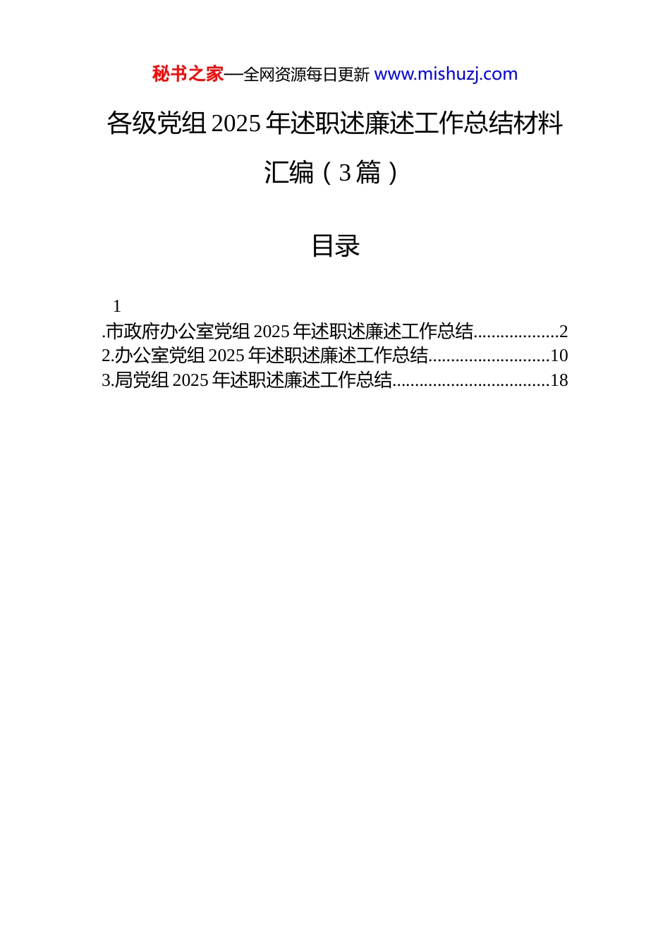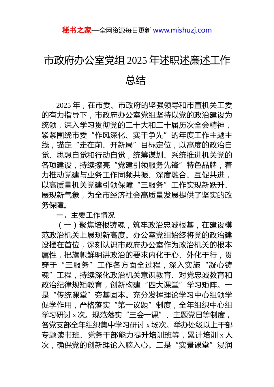 秘书之家—全网资源每日更新 www.mishuzj.com各级党组 2025 年述职述廉述工作总结材料汇编(3 篇)目录1.市政府办公室党组 2025 年述职述廉述工作总结...................22.办公室党组 2025 年述职述廉述工作总结...........................103.局党组 2025 年述职述廉述工作总结...................................18秘书之家—全网资源每日更新 www.mishuzj.com市政府办公室党组 2025 年述职述廉述工作总结 2025 年,在市委、市政府的坚强领导和市直机关工委的有力指导下,市政府办公室党组坚持以党的政治建设为统领,深入学习贯彻党的二十大和二十届历次全会精神,紧紧围绕市委“作风深化、实干争先”的年度工作主题主线,锚定“走在前、开新局”目标定位,以高度的政治自觉、思想自觉和行动自觉,统筹谋划、系统推进机关党的各项建设,持续擦亮“党建引领服务先锋”特色品牌,着力推动党建与业务工作同频共振、深度融合、互促共进,以高质量机关党建引领保障“三服务”工作实现新跃升、展现新气象,为全市经济社会高质量发展提供了坚实的政务保障。一、主要工作情况(一)聚焦培根铸魂,筑牢政治忠诚根基,在建设模范政治机关上展现新高度。办公室党组始终将党的政治建设摆在首位,深刻认识市政府办公室作为政治机关的根本属性,把旗帜鲜明讲政治的要求内化于心、外化于行,贯穿于“三服务”工作各方面全过程,深入实施“凝心铸魂”工程,持续深化政治机关意识教育、对党忠诚教育和政治纪律规矩教育,创新构建“四大课堂”学习矩阵。一是“传统课堂”夯基固本。充分发挥理论学习中心组领学促学作用,严格落实“第一议题”制度,全年组织中心组学习研讨 x 次。规范落实“三会一课”、主题党日等制度,各党支部全年组织集中学习研讨 x 场次。举办处级以上干部专题读书班、党务干部能力提升培训班等,累计培训 x 人次,确保党的创新理论入脑入心。二是“实景课堂”浸润秘书之家—全网资源每日更新 www.mishuzj.com升华。充分挖掘利用本地及周边红色教育资源,组织党员干部赴 x 革命纪念馆、x 党性教育基地等开展沉浸式现场教学 x 次,通过重温入党誓词、聆听革命故事、感悟初心使命,引导党员干部在历史场景中汲取精神滋养,增强政治认同和情感认同。三是“青年课堂”激发活力。精心打造“‘政’能量·青春铸魂”青年理论学习品牌。组建青年理论学习小组,围绕重要会议精神、政策法规、业务技能等主题,全年开展“xx”“xx”“xx”等特色活动 x 次,鼓励青年干部上讲台、谈体会、促交流,有效激发青年群体的学习热情和内生动力。四是“微型课堂”见缝插针。利用工作间隙、午休等碎片化时间,依托“学习强国”平台、机关党建微信群等载体,推送“每日一学”“每周一测”等微内容,组织“xx”“xx”x 余场次,实现理论学习常态化、便捷化、全覆盖。(二)聚焦强基固本,锻造坚强战斗堡垒,在提升组织功能上实现新突破。办公室党组牢固树立大抓基层的鲜明导向,着力增强机关党组织的政治功能和组织功能,推动各党支部全面进步、全面过硬。一是规范组织生活,提升支部活力。严格落实《中国共产党支部工作条例(试行)》,不断提升党支部标准化规范化建设水平。各党支部严格执行“三会一课”、组织生活会、民主评议党员、谈心谈话等制度,全年高质量开展主题党日活动 x 次。其中,以“重温入党誓词”、“过政治生日”、“学习身边榜样”等为主题的党日活动 x 次,有效增强了组织生活的庄重感、仪式感和吸引力,强化了党员的身份意识和归属感。二是强化典型引路,激发先锋动能。深入开展评先树优工作,充分发挥先进典型的示范引领作用。在重要岗位设立“党员先锋岗”x 个,亮身份、践承诺、作表率。年内,我办党员干部先后有 x 人荣获“全省‘百名优秀选调生’”、x 人获评“全省政务信息工作表现突出个人”、x人获“市落实‘三提三敢’、聚力攻坚突破先进个人”、x秘书之家—全网资源每日更新 www.mishuzj.com人获评“市直机关‘四好’党员”等荣誉称号,营造了崇尚先进、学习先进、争当先进的浓厚氛围。三是深化党群共建,凝聚奋进合力。聚...