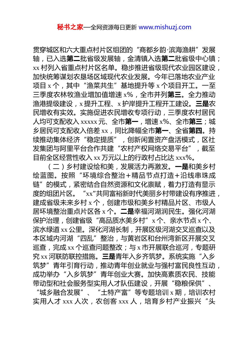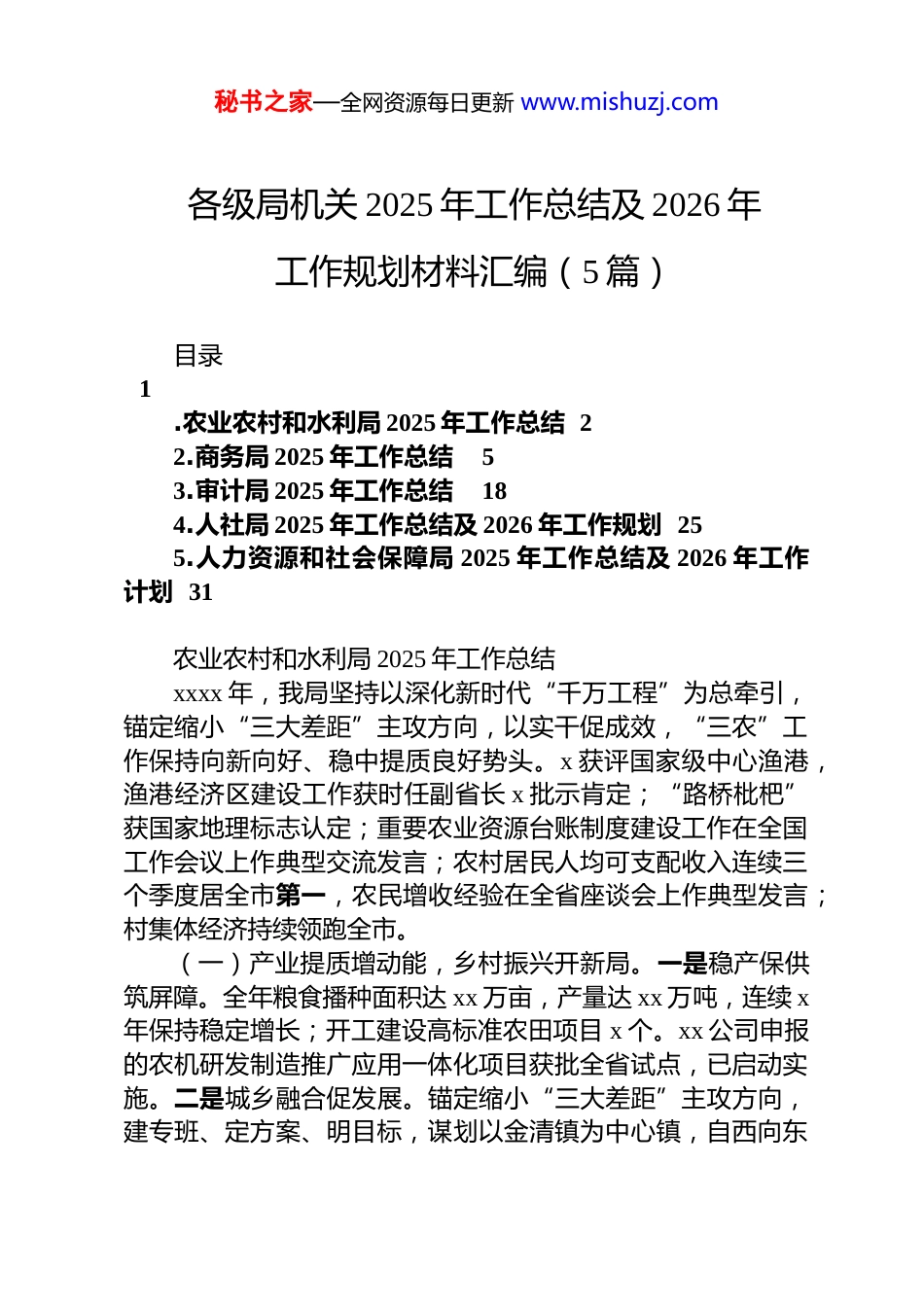 秘书之家—全网资源每日更新 www.mishuzj.com各级局机关 2025 年工作总结及 2026 年工作规划材料汇编(5 篇)目录1.农业农村和水利局 2025 年工作总结 22.商务局 2025 年工作总结53.审计局 2025 年工作总结184.人社局 2025 年工作总结及 2026 年工作规划 255.人力资源和社会保障局 2025 年工作总结及 2026 年工作计划 31农业农村和水利局 2025 年工作总结xxxx 年,我局坚持以深化新时代“千万工程”为总牵引,锚定缩小“三大差距”主攻方向,以实干促成效,“三农”工作保持向新向好、稳中提质良好势头。x 获评国家级中心渔港,渔港经济区建设工作获时任副省长 x 批示肯定;“路桥枇杷”获国家地理标志认定;重要农业资源台账制度建设工作在全国工作会议上作典型交流发言;农村居民人均可支配收入连续三个季度居全市第一,农民增收经验在全省座谈会上作典型发言;村集体经济持续领跑全市。(一)产业提质增动能,乡村振兴开新局。一是稳产保供筑屏障。全年粮食播种面积达 xx 万亩,产量达 xx 万吨,连续 x年保持稳定增长;开工建设高标准农田项目 x 个。xx 公司申报的农机研发制造推广应用一体化项目获批全省试点,已启动实施。二是城乡融合促发展。锚定缩小“三大差距”主攻方向,建专班、定方案、明目标,谋划以金清镇为中心镇,自西向东秘书之家—全网资源每日更新 www.mishuzj.com贯穿城区和六大重点村片区组团的“商都乡韵·滨海渔耕”发展轴,已入选第二批省级发展轴,金清镇入选第二批省级中心镇;xx 村列入省重点村片区名单。稳步推进省级现代农业园区建设,加快统筹谋划农垦场区域现代农业发展。今年已落地农业产业项目 x 个,其中“渔菜共生”基地提升等 x 个项目开工。一至三季度农林牧渔业增加值增速 x%,全市并列第三。全力推动渔港提级建设,x 提升工程、x 护岸提升工程开工建设。三是农民增收有实效。实施促进农民增收专项行动,三季度农村居民人均可支配收入 xxxxx 元、全市第一,增速 x%、全市第三;城乡居民可支配收入倍差 xx,同比降幅全市第一、全省第四。持续推动集体经济“稳定提质”,创新闲置资产盘活模式,区社发集团与阿里平台合作共建“农村产权网络交易平台”,截至目前全区经营性收入 xx 万元以上的行政村占比达 xxx%。(二)乡村建设绘和美,发展活力再激发。一是和美乡村绘蓝图。按照“环境综合整治+精品节点打造+沿线串珠成链”的模式,紧密结合自然资源和文化禀赋,着力打造有显示度的组团片区。“xx”共同富裕新时代美丽乡村带建设有序推进,建成省级未来乡村 x 个,创建市级和美乡村精品片区、市级人居环境整治重点片区各 x 个。二是幸福河湖润民生。强化河湖保护治理,创建省级“高品质水美乡村”x 个、亲水节点 x 个、滨水绿道 xx 公里。深化河湖长制,开展区级河湖交叉巡查以及本区域内河湖“四乱”整治,与黄岩区和台州湾新区开展交叉巡查,完成 xx 个巡查问题整改;与 x 市开展联合巡河,专题研究 xx 河联防联控措施。三是青年入乡齐筑梦。系统实施“入乡筑梦”青年引育行动,推动青年创业就业与强村富民良性互动,成功举办“入乡筑梦”青年创业大赛。加快高素质农民、技能带动型和社会服务型实用人才队伍建设,开展“稳粮保供”、“城乡融合发展”、“土特产富”等专题培训 x 期,培训农村实用人才 xxx 人次,农创客 xxx 人,培育乡村产业振兴“头秘书之家—全网资源每日更新 www.mishuzj.com雁”xx 人。(三)安全法治守底线,政绩导向惠民生。一是法治建设强根基。助力“大综合一体化”改革,掌上执法系统开通率xxx%,实现农业、水利领域“双随机、一公开”监管全覆盖。依法有效化解社会矛盾纠纷,办结“基层一件事”xxx 件。积极开展“世界水日”“中国水周”“宪法活动月”等普法宣传,进一步营造学法用法氛围。二是民生实事暖民心。坚持为民导向,高质量办理 x 项省级、x 项市级民生实事,用心用情用力解决群众“急难愁盼”问题。建成青年入乡实践站点 xx 个,吸纳青年入站实习 xx 人、就业 xx 人;完成幸福河湖农村水系整治xx 公里;改造...