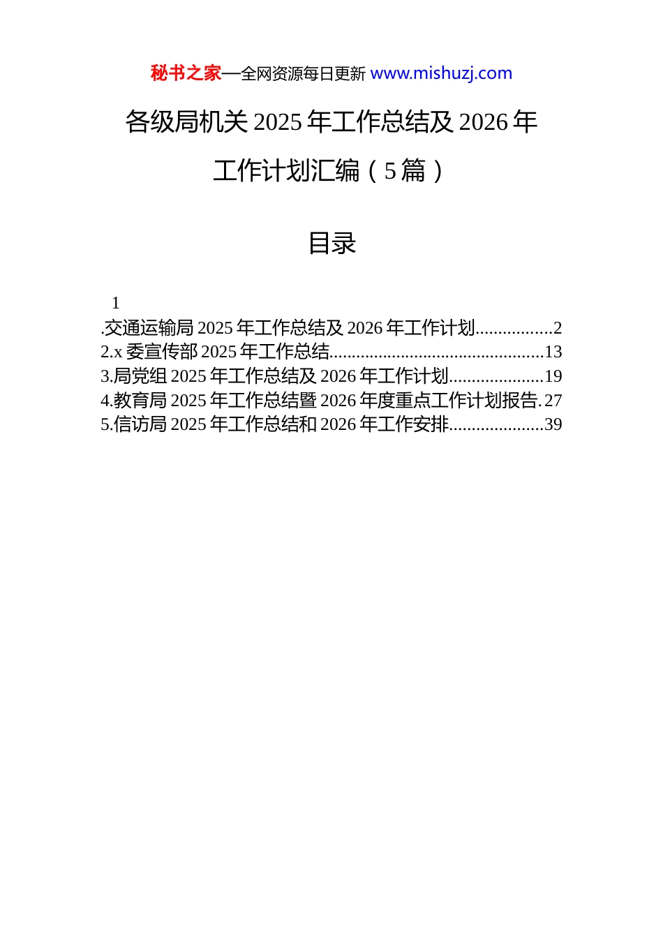 秘书之家—全网资源每日更新 www.mishuzj.com各级局机关 2025 年工作总结及 2026 年工作计划汇编(5 篇)目录1.交通运输局 2025 年工作总结及 2026 年工作计划.................22.x 委宣传部 2025 年工作总结................................................133.局党组 2025 年工作总结及 2026 年工作计划.....................194.教育局 2025 年工作总结暨 2026 年度重点工作计划报告.275.信访局 2025 年工作总结和 2026 年工作安排.....................39秘书之家—全网资源每日更新 www.mishuzj.com交通运输局 2025 年工作总结及 2026 年工作计划根据市委、市政府和上级交通运输部门的统一部署,xxxx 年,x 市交通运输局坚持以习近平新时代中国特色社会主义思想为指导,深入学习贯彻习近平总书记关于交通强国的重要论述,全面落实党的二十大和二十届三中、四中全会精神,紧紧围绕“抓项目、促投资、保安全、优服务、强治理”的工作主线,真抓实干,攻坚克难,各项工作取得阶段性成效。现将 2025 年工作总结及 2026 年工作计划报告如下:一、工作开展情况xxxx 年,全局上下紧扣高质量发展主题,统筹发展和安全,全力以赴抓项目、强监管、优服务、保畅通,交通运输经济运行总体平稳,为服务全市经济社会高质量发展提供了坚实的交通运输保障。(一)筑牢安全底线,监管效能实现新提升。一是安全生产形势持续稳定。坚持“人民至上、生命至上”理念,深刻汲取近期国内重大安全事故教训,成立由局领导班子带头的 x 个包联检查组,在春运、“五一”、汛期等重点时段,深入开展安全生产集中排查整治行动。行动聚焦道路运输、城市客运、水路运输、港口营运、公路水运工程建设等重点领域,累计出动检查组 x 个,走访检查各类企业 x 家,发现并整改问题隐患 x 项。创新推行“企业自查-县级排查-市级抽查”三级联动工作机制,制定《交通运输行业重大事故隐患判定标准“一行业一清单”》,实现重大事故隐患挂牌督办、闭环管理。xxxx 年,全市交通运输领域安全生产事故起数、死亡人数同比分别下降 x%和 x秘书之家—全网资源每日更新 www.mishuzj.com%,未发生重大及以上安全生产责任事故。二是监管执法能力明显增强。深入开展驾培市场专项整治,创新采用“互检互学”交叉执法模式,组织 x、余江等地执法力量开展联合检查。累计检查驾培机构 x 家,排查共性问题 x 处,全部限期整改到位。针对“两客一危”等重点领域,构建“日监测、月通报”常态化监管机制,每日抓取车辆超速、疲劳驾驶等违规数据,实时督办属地监管部门落实监管责任。开展治理车辆超限超载专项行动,推行治超非现场执法,查处超限超载车辆 x 辆次,高速公路平均超限率控制在x%以下。创新电焊机“加芯赋码”智慧监管,为 x 家汽修企业设备安装智能芯片,动态锁定无证上岗、“带病”运行等行为。三是应急处置能力稳步提升。完善“四个体系”建设,优化应急预案体系,加强应急演练和物资储备。开展防汛备灾工作,储备砂石料 x 立方、编织袋 x 只、应急机械 x 台,完成疏通边沟 x 公里、清淤桥涵 x 处。针对极端天气增多情况,提前部署高灾害风险路段监测预警,实现汛期前高风险路段监测预警全覆盖。严格执行 xx 小时值班和领导带班制度,重要时段、重大活动期间运输服务保障有力有效。推动交通运输领域安全生产治本攻坚三年行动走深走实,行业本质安全水平得到提升。(二)扩大有效投资,项目建设取得新进展。一是交通投资保持高位运行。积极扩大交通运输有效投资,xxxx年完成交通固定资产投资 x 亿元,同比增长 x%,投资规模持续维持高位。其中,公路建设完成投资 x 亿元,水运工程完成投资 x 亿元,场站建设完成投资 x 亿元。坚持“项目为王”理念,建立“十四五”后期和“十五五”早期项目储备库,目前已谋划总投资约 x 亿元的“十五五”交通发展规划项目 x 个,形成全方位、多层次、立体化的项目建设格局。成立项目前期工作专班,加强用地、用林、环评等要素保障,做深做实项目前期工作。二是重大项目实现突破。加快推进交通重大...