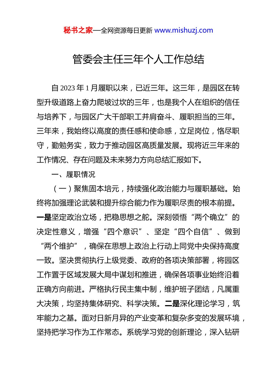 秘书之家—全网资源每日更新 www.mishuzj.com管委会主任三年个人工作总结 自 2023 年 1 月履职以来,已近三年。这三年,是园区在转型升级道路上奋力爬坡过坎的三年,也是我个人在组织的信任与培养下,与园区广大干部职工并肩奋斗、履职担当的三年。三年来,我始终以高度的责任感和使命感,立足岗位,恪尽职守,勤勉务实,致力于推动园区高质量发展。现将近三年来的工作情况、存在问题及未来努力方向总结汇报如下。一、履职情况(一)聚焦固本培元,持续强化政治能力与履职基础。始终将加强理论武装和提升综合能力作为履职尽责的根本前提。一是坚定政治立场,把稳思想之舵。深刻领悟“两个确立”的决定性意义,增强“四个意识”、坚定“四个自信”、做到“两个维护”,确保在思想上政治上行动上同党中央保持高度一致。坚决贯彻执行上级党委、政府的各项决策部署,将园区工作置于区域发展大局中谋划和推进,确保各项事业始终沿着正确方向前进。严格执行民主集中制,维护班子团结,凡属重大决策,均坚持集体研究、科学决策。二是深化理论学习,筑牢能力之基。面对日新月异的产业变革和复杂多变的发展环境,坚持把学习作为工作常态。系统学习党的创新理论,深入钻研秘书之家—全网资源每日更新 www.mishuzj.com经济管理、产业发展、科技创新、法律法规等专业知识,三年来研读相关政策文件和专业书籍百余册。坚持理论联系实际,深入基层一线开展调研超过 60 次,形成专题调研报告 15 篇,其中关于优化园区产业生态的建议报告得到上级领导批示肯定。三是发挥表率作用,汇聚奋进之力。在工作中,以身作则,要求别人做到的自己首先做到。在急难险重任务面前,敢于担当、靠前指挥;在作风建设上,大力弘扬求真务实精神,坚决反对形式主义、官僚主义;在廉洁自律上,带头严格遵守各项纪律规定,管好家人和身边工作人员,自觉维护清正廉洁的干部形象。(二)聚焦主责主业,全力推动园区发展提质增效。紧紧围绕园区发展核心任务,以“时时放心不下”的责任感,全力以赴抓好各项重点工作落实。一是着力攻坚克难,服务发展大局。始终将招商引资和项目建设作为园区发展的生命线。面对近三年宏观经济下行压力和日趋激烈的区域竞争,牵头成立招商引资工作专班,带队赴长三角、珠三角等重点区域开展精准招商 80 余次。三年来,园区累计引进亿元以上重点产业项目 85个协议总投资额超 1800 亿元。全区固定资产投资总额实现逆势增长,从 2023 年的 592.87 亿元增长至 2025 年预计的 750 亿元以上。特别是在推进某新能源龙头企业百亿级项目落地过程中,秘书之家—全网资源每日更新 www.mishuzj.com针对土地指标紧张、配套设施滞后等瓶颈,连续数月驻点协调,成功争取到省级用地指标支持,并推动完成了配套道路和管网等基础设施建设,确保了项目按期开工。二是着力创新驱动,激发内生动力。深刻认识到改革创新是园区发展的根本动力。在分管领域内,积极推动管理体制机制创新。牵头组织开展了园区管理体制改革的调研论证,积极探索并稳步推进“管委会+公司”的市场化运营模式旨在理顺政企关系,剥离管委会的社会管理和开发建设等具体事务,使其更加聚焦于经济调节、市场监管、公共服务等核心职能提升园区专业化运营和资本运作能力。同时,积极运用大数据、物联网等新技术赋能园区管理,推动建设智慧园区管理平台,提升了项目管理、安全生产监测和企业服务的智能化水平。三是着力固本强基,夯实发展基础。高度重视打基础、利长远的工作。狠抓干部队伍专业能力建设,组织开展“园区发展能力提升计划”,通过业务轮训、案例研讨等方式,着力提升团队在产业研究、项目谈判、企业服务等方面的实战能力。强化制度建设和执行力,牵头修订和完善了财务管理、资产管理、工程建设管理等内部制度 20 余项,加强了对重大项目招投标、资金使用等关键环节的风险管控,确保园区各项工作在法治化、规范化的轨道上运行。(三)聚焦服务为本,不断提升治理能力与优化营商环境秘书之家—全网资源每日更新 www.mishuzj.com始终坚持以企业和群众为中心,将优化服务、提升治理效能作为工作的出发点和...
