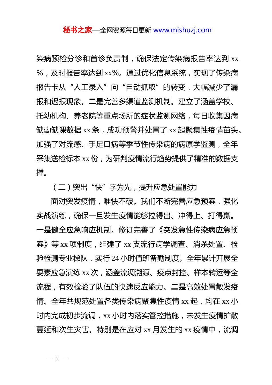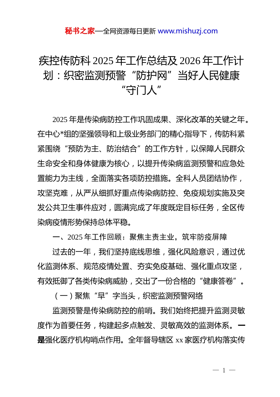 秘书之家—全网资源每日更新 www.mishuzj.com疾控传防科 2025 年工作总结及 2026 年工作计划:织密监测预警“防护网”当好人民健康“守门人”2025 年是传染病防控工作巩固成果、深化改革的关键之年。在中心*组的坚强领导和上级业务部门的精心指导下,传防科紧紧围绕“预防为主、防治结合”的工作方针,以保障人民群众生命安全和身体健康为核心,以提升传染病监测预警和应急处置能力为主线,全面落实各项防控措施。全科人员团结协作,攻坚克难,从严从细抓好重点传染病防控、免疫规划实施及突发公共卫生事件应对,圆满完成了年度既定目标任务,全区传染病疫情形势保持总体平稳。一、2025 年工作回顾:聚焦主责主业,筑牢防疫屏障过去的一年,我们坚持底线思维,强化风险意识,通过优化监测体系、规范疫情处置、夯实免疫基础、强化重点攻坚,有效抵御了各类传染病威胁,交出了一份合格的“健康答卷”。(一)聚焦“早”字当头,织密监测预警网络监测预警是传染病防控的前哨。我们始终把提升监测灵敏度作为首要任务,构建起多点触发、灵敏高效的监测体系。一是强化医疗机构哨点作用。全年督导辖区 xx 家医疗机构落实传— 1 —秘书之家—全网资源每日更新 www.mishuzj.com染病预检分诊和首诊负责制,确保法定传染病报告率达到 xx%,及时报告率达到 xx%。通过优化信息系统,实现了传染病报告卡从“人工录入”向“自动抓取”的转变,大幅减少了漏报和迟报现象。二是完善多渠道监测机制。建立了涵盖学校、托幼机构、养老院等重点场所的症状监测网络,每日收集因病缺勤缺课数据 xx 条,成功预警并处置了 xx 起聚集性疫情苗头。加强了对流感、手足口病等季节性传染病的病原学监测,全年采集送检标本 xx 份,为研判疫情流行趋势提供了精准的数据支撑。(二)突出“快”字为先,提升应急处置能力面对突发疫情,唯快不破。我们不断完善应急预案,强化实战演练,确保一旦发生疫情能够拉得出、冲得上、打得赢。一是健全应急响应机制。修订完善了《突发急性传染病应急预案》等 xx 项制度,组建了 xx 支流行病学调查、消杀处置、检验检测专业梯队,实行 24 小时值班备勤制度。全年累计开展全要素应急演练 xx 次,涵盖流调溯源、疫点封控、样本转运等全流程,有效检验了队伍的快速反应能力。二是高效处置散发疫情。全年共规范处置各类传染病聚集性疫情 xx 起,均在 xx 小时内完成初步流调,xx 小时内落实管控措施,未发生疫情扩散蔓延和次生灾害。特别是在应对 xx 月发生的 xx 疫情中,流调— 2 —秘书之家—全网资源每日更新 www.mishuzj.com队员彻夜奋战,迅速查清传播链条,切断了传播途径,最大限度降低了社会影响。(三)立足“实”字托底,构筑免疫屏障高地预防接种是控制传染病最经济、最有效的手段。我们坚持规范化管理与人性化服务并重,持续提升预防接种服务质量和覆盖率。一是稳步推进常规免疫。扎实开展国家免疫规划疫苗接种工作,适龄儿童各类疫苗接种率均保持在 xx%以上,全程接种率达到 xx%。针对流动儿童等重点人群,开展了“查漏补种”专项行动,补种疫苗 xx 剂次,消除了免疫空白。二是推进接种门诊数字化升级。全区 xx 家预防接种门诊全部完成了数字化建设,实现了取号、登记、接种、留观的全流程信息化管理,做到了“苗、人、码”三相符。加强疫苗冷链管理,由专人负责每日温控监测,确保疫苗储存运输安全有效。全年未发生一起因疫苗质量或接种操作引起的严重不良反应事件。(四)坚持“严”字把关,强化重点传染病防控针对结核病、艾滋病等重大传染病,我们坚持分类施策,综合防治,有效遏制了发病率上升势头。一是深化结核病综合防治。推广“三位一体”结核病防治模式,加强患者发现和规范管理。全年登记管理活动性肺结核患者 xx 例,患者规范管理率达 xx%,成功治疗率达 xx%。深入学校、企业开展结核病筛— 3 —秘书之家—全网资源每日更新 www.mishuzj.com查,新生入学结核病筛查率达到 100%。二是加强重点媒介传染病防控。针对布病、出血热等自然疫源性疾病,开展了持续性的宿主密度监测和外环境消杀。在布病高发期...