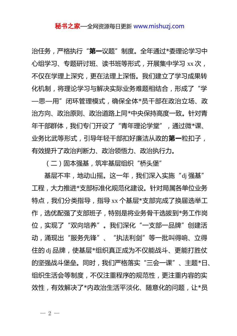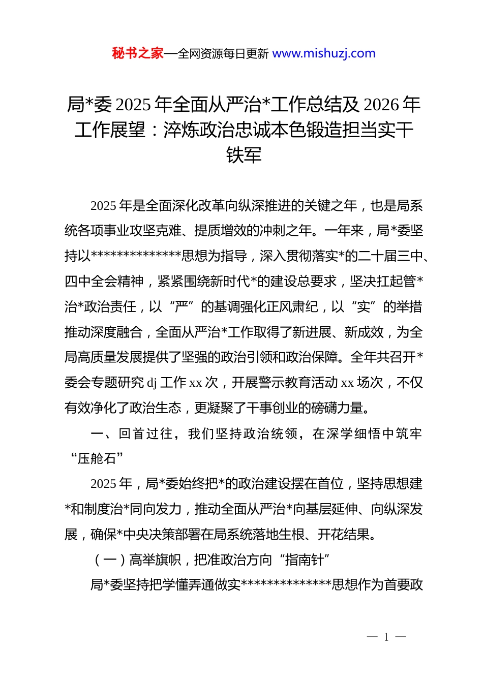 秘书之家—全网资源每日更新 www.mishuzj.com局*委 2025 年全面从严治*工作总结及 2026 年工作展望:淬炼政治忠诚本色锻造担当实干铁军2025 年是全面深化改革向纵深推进的关键之年,也是局系统各项事业攻坚克难、提质增效的冲刺之年。一年来,局*委坚持以**************思想为指导,深入贯彻落实*的二十届三中、四中全会精神,紧紧围绕新时代*的建设总要求,坚决扛起管*治*政治责任,以“严”的基调强化正风肃纪,以“实”的举措推动深度融合,全面从严治*工作取得了新进展、新成效,为全局高质量发展提供了坚强的政治引领和政治保障。全年共召开*委会专题研究 dj 工作 xx 次,开展警示教育活动 xx 场次,不仅有效净化了政治生态,更凝聚了干事创业的磅礴力量。一、回首过往,我们坚持政治统领,在深学细悟中筑牢“压舱石”2025 年,局*委始终把*的政治建设摆在首位,坚持思想建*和制度治*同向发力,推动全面从严治*向基层延伸、向纵深发展,确保*中央决策部署在局系统落地生根、开花结果。(一)高举旗帜,把准政治方向“指南针”局*委坚持把学懂弄通做实**************思想作为首要政— 1 —秘书之家—全网资源每日更新 www.mishuzj.com治任务,严格执行“第一议题”制度。全年通过*委理论学习中心组学习、专题研讨班、读书班等形式,开展集中学习 xx 次,不仅在学理上深究,更在法理上深悟。我们建立了学习成果转化机制,将理论学习与解决实际业务难题相结合,形成了“学—思—用”闭环管理模式,确保全体*员干部在政治立场、政治方向、政治原则、政治道路上同*中央保持高度一致。针对青年干部群体,我们专门开设了“青年理论学堂”,通过微*课、业务比武等形式,引导年轻干部扣好廉洁从政的第一粒扣子,有效提升了政治判断力、政治领悟力、政治执行力。(二)固本强基,筑牢基层组织“桥头堡”基层不牢,地动山摇。这一年,我们深入实施“dj 强基”工程,大力推进*支部标准化规范化建设。针对局属各单位业务特点,我们分类指导,指导 xx 个基层*支部完成了换届选举工作,选优配强了支部班子,特别是将业务骨干选拔到*务工作岗位,实现了“双向培养”。我们深化“一支部一品牌”创建活动,涌现出“服务先锋”、“执法利剑”等一批叫得响、立得住的 dj 品牌,使基层*组织真正成为不仅能战斗、更能打胜仗的坚强战斗堡垒。同时,我们严格落实“三会一课”、主题*日、组织生活会等制度,不仅注重程序的规范性,更注重内容的实效性,有效解决了*内政治生活平淡化、随意化的问题,让*员— 2 —秘书之家—全网资源每日更新 www.mishuzj.com教育管理更加有力度、有温度。(三)正风肃纪,不仅作风建设“紧箍咒”作风建设永远在路上。局*委锲而不舍落实中央八项规定及其实施细则精神,紧盯“四风”问题新表现新动向,特别是形式主义、官僚主义问题,开展了专项整治行动。我们建立了“作风观察员”制度,从服务对象、基层群众中聘请监督员 xx名,不仅听“听得见”的意见,更听“听不到”的心声,全年发现并整改作风问题 xx 个。在节假日等关键节点,我们坚持“早提醒、早检查、早通报”,通过发送廉政短信、开展突击检查等方式,持续释放越往后执纪越严的强烈信号。针对群众反映强烈的办事难、办事慢等问题,我们开展了“局长走流程”活动,倒逼流程优化,窗口服务满意度提升至 xx%,不仅提升了行政效能,更树立了为民务实的良好形象。(四)履职尽责,耕好管*治*“责任田”牵住责任制这个“牛鼻子”,是管*治*的关键。局*委制定印发了《2025 年全面从严治*主体责任清单》,细化了*委主体责任、书记第一责任人责任、班子成员“一岗双责”的具体内容,形成了横向到边、纵向到底的责任体系。我们建立了季度听取汇报、半年检查考核、年终述职评议的常态化督导机制,对落实责任不力的 xx 名干部进行了约谈提醒,不仅传导了压力,— 3 —秘书之家—全网资源每日更新 www.mishuzj.com更压实了责任。同时,我们积极支持纪检监察机构履行监督责任,深化运用监督执纪“四种形态”,特别是第一种形态,让“红红脸、出出汗”成为常态,全年共开展谈心谈话 xx ...
