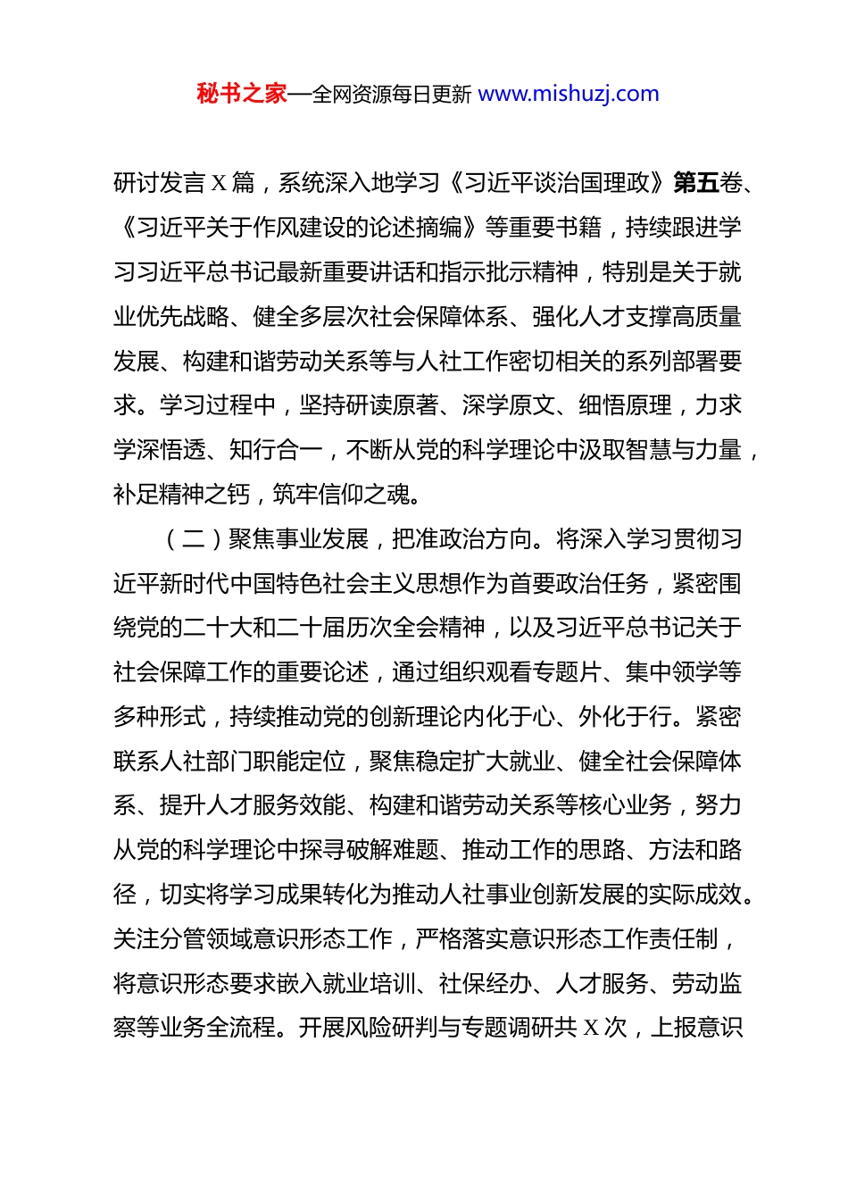 秘书之家—全网资源每日更新 www.mishuzj.com某区人社局局长 2025 年述德述职述廉总结 2025 年是“十四五”规划的收官之年,也是人社工作凝心聚力、团结奋进的一年。在区委、区政府和局党组的坚强领导下,我始终坚持以人民为中心的发展思想,紧紧围绕服务经济社会高质量发展大局,通过促进高质量充分就业、健全社会保障体系、加强人才队伍建设、构建和谐劳动关系等方面加压奋进,较好地完成了年度各项目标任务。现将本人一年来的履职情况报告如下:一、坚持凝心铸魂,淬炼绝对忠诚的政治品格我始终坚持把理论学习作为加强思想政治建设的重要抓手坚持用党的创新理论武装头脑、指导实践、推动工作,把牢正确政治方向。注重理论学习与实践贯通、知与行统一,将学习成果与人社工作实际紧密结合,找准工作切入点和着力点,把理论学习成效转化为破解难题、推动发展的具体举措。(一)带头严抓实管,筑牢信仰之基。认真履行“第一责任人”职责,审定学习计划、确定学习专题、主持集中研讨并带头领学讲学。年初制定详尽的年度学习计划,明确学习重点、时间安排与责任分工,严格落实学习交流机制,倒逼中心组成员主动深学。累计组织党组理论中心组学习共 X 次,撰写交流秘书之家—全网资源每日更新 www.mishuzj.com研讨发言 X 篇,系统深入地学习《习近平谈治国理政》第五卷、《习近平关于作风建设的论述摘编》等重要书籍,持续跟进学习习近平总书记最新重要讲话和指示批示精神,特别是关于就业优先战略、健全多层次社会保障体系、强化人才支撑高质量发展、构建和谐劳动关系等与人社工作密切相关的系列部署要求。学习过程中,坚持研读原著、深学原文、细悟原理,力求学深悟透、知行合一,不断从党的科学理论中汲取智慧与力量,补足精神之钙,筑牢信仰之魂。(二)聚焦事业发展,把准政治方向。将深入学习贯彻习近平新时代中国特色社会主义思想作为首要政治任务,紧密围绕党的二十大和二十届历次全会精神,以及习近平总书记关于社会保障工作的重要论述,通过组织观看专题片、集中领学等多种形式,持续推动党的创新理论内化于心、外化于行。紧密联系人社部门职能定位,聚焦稳定扩大就业、健全社会保障体系、提升人才服务效能、构建和谐劳动关系等核心业务,努力从党的科学理论中探寻破解难题、推动工作的思路、方法和路径,切实将学习成果转化为推动人社事业创新发展的实际成效。关注分管领域意识形态工作,严格落实意识形态工作责任制,将意识形态要求嵌入就业培训、社保经办、人才服务、劳动监察等业务全流程。开展风险研判与专题调研共 X 次,上报意识秘书之家—全网资源每日更新 www.mishuzj.com形态领域风险研判报告 X 份,提出针对性防控建议 X 条。特别是针对网络舆情和意识形态领域的风险挑战,坚持做到守土有责、守土尽责,主动发声亮剑,自觉维护党的形象和威信,以实际行动诠释对党绝对忠诚,确保各项工作始终沿着正确的政治方向前进。(三)践行知行合一,提升学习实效。坚持弘扬理论联系实际的马克思主义学风,将学习成果转化为谋划工作的智慧、解决问题的良策和推动发展的动力。聚焦党的创新理论最新成果、宏观政策走向、人社领域改革重点等确定研讨主题,组织领导班子成员结合分管工作谈认识、找差距、提对策。组织召开中心组学习会议 X 次,中心组成员交流研讨 X 次 X 人次,有效促进了理论学习与工作思考的深度融合。深入服务窗口、乡镇村社、相关企业等一线开展实地调研 X 次,围绕乡村振兴就业帮扶、社保历史遗留问题解决、农民工工资追讨等群众关切的热点难点问题,在现场察实情、找症结、谋实策,实现“在实践中学习、在学习中解题”的双向互动,不断提升运用理论指导实践、推动工作的能力。二、坚持笃行实干,展现奋发有为的担当精神始终树立和践行正确政绩观,以高质量发展统揽全局,充分发挥人社工作在改善民生、服务发展、促进和谐中的重要作秘书之家—全网资源每日更新 www.mishuzj.com用,全面推进人社事业发展,为促进全区经济社会健康发展、维护改革发展稳定大局作出了积极贡献。(一)促进高质量充分就业。坚持把稳就业放在首要位置...