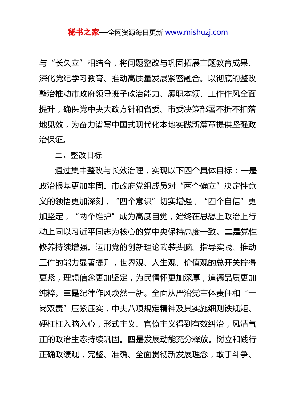 秘书之家—全网资源每日更新 www.mishuzj.com2025 年度市政府党组民主生活会查摆问题整改方案 为深入学习贯彻习近平新时代中国特色社会主义思想,全面贯彻落实党的二十大及历次全会精神,扎实做好 2025 年度民主生活会“后半篇文章”,针对会前征求意见、谈心谈话及会上查摆剖析、相互批评指出的突出问题,特制定本整改方案。市政府党组将以此次民主生活会为契机,以刀刃向内的勇气和自我革命的精神,从严从实抓好问题整改,将整改成效转化为坚定拥护“两个确立”、坚决做到“两个维护”的政治自觉,转化为推动全市经济社会高质量发展的强大动力,为实现“十五五”良好开局奠定坚实基础。一、指导思想坚持以习近平新时代中国特色社会主义思想为指导,全面贯彻党的二十大和二十届二中、三中、四中全会精神,深入落实习近平总书记关于党的建设的重要思想、关于党的自我革命的重要战略思想以及对本地区工作的重要指示批示精神。牢牢把握“学思想、强党性、重实践、建新功”的总要求,聚焦市政府党组在政治忠诚、党性修养、敬畏意识、担当作为、管党治党责任以及作风建设方面存在的突出问题。坚持“当下改”秘书之家—全网资源每日更新 www.mishuzj.com与“长久立”相结合,将问题整改与巩固拓展主题教育成果、深化党纪学习教育、推动高质量发展紧密融合。以彻底的整改整治推动市政府领导班子政治能力、履职本领、工作作风全面提升,确保党中央大政方针和省委、市委决策部署不折不扣落地见效,为奋力谱写中国式现代化本地实践新篇章提供坚强政治保证。二、整改目标通过集中整改与长效治理,实现以下四个具体目标:一是政治根基更加牢固。市政府党组成员对“两个确立”决定性意义的领悟更加深刻,“四个意识”切实增强,“四个自信”更加坚定,“两个维护”成为高度自觉,始终在思想上政治上行动上同以习近平同志为核心的党中央保持高度一致。二是党性修养持续增强。运用党的创新理论武装头脑、指导实践、推动工作的能力显著提升,世界观、人生观、价值观的总开关拧得更紧,理想信念更加坚定,为民情怀更加深厚,道德品质更加纯粹。三是纪律作风焕然一新。全面从严治党主体责任和“一岗双责”压紧压实,中央八项规定精神及其实施细则铁规矩、硬杠杠入脑入心,形式主义、官僚主义得到有效纠治,风清气正的政治生态持续巩固。四是发展动能充分释放。树立和践行正确政绩观,完整、准确、全面贯彻新发展理念,敢于斗争、秘书之家—全网资源每日更新 www.mishuzj.com善于斗争,在破解发展难题、防范化解风险、增进民生福祉上展现新担当新作为,奋力完成全年经济社会发展目标任务。三、整改措施(一)聚焦“带头强化政治忠诚,提高政治能力”方面存在问题的整改措施针对在政治判断力、政治领悟力、政治执行力上存在的温差、落差、偏差问题,重点实施三项提升行动。1.实施理论武装铸魂行动,筑牢“两个维护”政治根基。严格执行“第一议题”制度,将学习贯彻习近平总书记最新重要讲话和重要指示批示精神作为市政府党组会议、常务会议的“必修课”。每季度至少组织开展 1 次市政府党组理论学习中心组专题学习研讨,班子成员带头撰写学习体会和调研报告,每年不少于 2 篇,深刻把握习近平新时代中国特色社会主义思想的世界观、方法论和贯穿其中的立场观点方法。建立健全理论学习成果转化评估机制,年底前对习近平总书记关于本地区、本领域工作的重要论述落实情况进行“回头看”,确保学习不浮于表面、贯彻不流于形式,切实把学习成效转化为谋划发展的具体思路、促进发展的政策举措、领导发展的实际能力。2.实施政治能力淬炼行动,锻造过硬政治本领。市政府党组每半年召开 1 次政治建设专题分析会,对照党中央决策部署秘书之家—全网资源每日更新 www.mishuzj.com和省委、市委工作要求,深入查摆在把握政治方向、保持政治定力、防范政治风险上的不足。围绕经济社会发展重大战略、深化改革开放关键课题、防范化解重大风险紧迫任务,班子成员每年牵头开展 1-2 项战略性、对策性调研,着力提升从政治高度观察、分析和处理经济问题、社会问题、民生问题的能力。在落实国家重大区域发展...