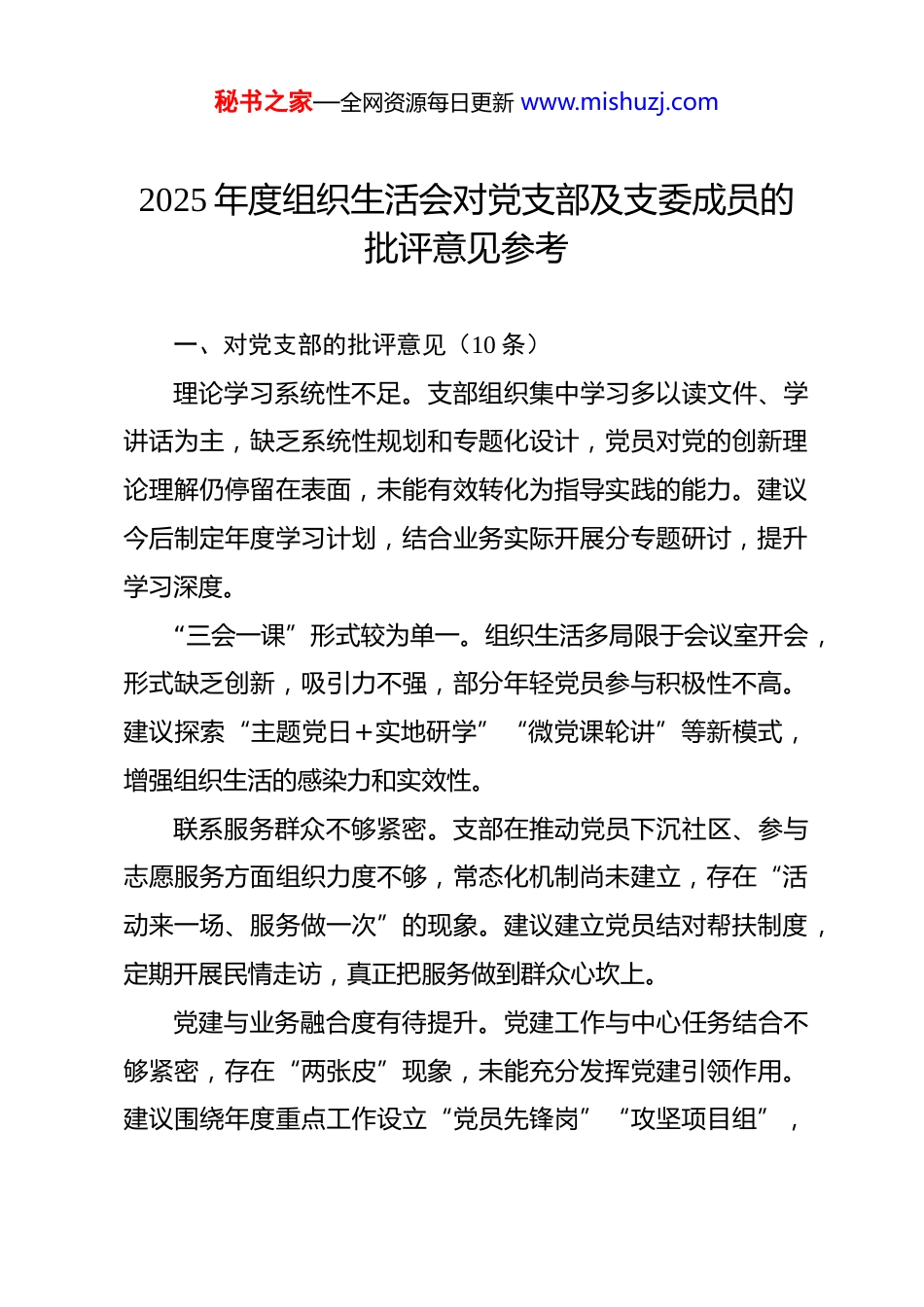秘书之家—全网资源每日更新 www.mishuzj.com2025 年度组织生活会对党支部及支委成员的批评意见参考 一、对党支部的批评意见(10 条)理论学习系统性不足。支部组织集中学习多以读文件、学讲话为主,缺乏系统性规划和专题化设计,党员对党的创新理论理解仍停留在表面,未能有效转化为指导实践的能力。建议今后制定年度学习计划,结合业务实际开展分专题研讨,提升学习深度。“三会一课”形式较为单一。组织生活多局限于会议室开会,形式缺乏创新,吸引力不强,部分年轻党员参与积极性不高。建议探索“主题党日+实地研学”“微党课轮讲”等新模式,增强组织生活的感染力和实效性。联系服务群众不够紧密。支部在推动党员下沉社区、参与志愿服务方面组织力度不够,常态化机制尚未建立,存在“活动来一场、服务做一次”的现象。建议建立党员结对帮扶制度,定期开展民情走访,真正把服务做到群众心坎上。党建与业务融合度有待提升。党建工作与中心任务结合不够紧密,存在“两张皮”现象,未能充分发挥党建引领作用。建议围绕年度重点工作设立“党员先锋岗”“攻坚项目组”,秘书之家—全网资源每日更新 www.mishuzj.com推动党建工作融入业务全过程。党员教育管理精细化不足。对党员的思想动态掌握不全面谈心谈话多流于形式,未能及时发现苗头性、倾向性问题。建议落实常态化谈心谈话机制,党支部书记每年与每位党员至少深入交流一次,做到心中有数、防患未然。发展党员工作前瞻性不强。对入党积极分子的培养考察周期较长,后备力量储备不足,个别业务骨干长期未被纳入培养视野。建议加强青年职工思想政治引导,主动发现和吸纳优秀人才,优化党员队伍结构。党内政治生活严肃性需强化。组织生活会上批评和自我批评氛围不够浓厚,存在“好人主义”倾向,相互批评多以建议代替问题,辣味不足。建议会前充分沟通、会上直面问题,真正达到红脸出汗、排毒治病的效果。典型示范引领作用发挥不够。对先进党员事迹挖掘宣传不深,榜样带动效应不明显,未能形成比学赶超的良好氛围。建议设立“身边榜样”专栏,定期推送优秀党员事迹,营造崇尚先进、争当先进的浓厚氛围。意识形态工作责任制落实不到位。对网络舆情风险预判能力不足,对党员干部社交媒体言行缺乏有效引导和监督。建议加强意识形态专题教育,明确纪律要求,筑牢思想防线。秘书之家—全网资源每日更新 www.mishuzj.com整改落实闭环管理机制不健全。上年度查摆问题的整改措施台账不清,部分问题整改停留在纸面,缺乏跟踪问效。建议建立问题整改销号制度,明确责任人和时限,确保件件有回音、事事有着落。二、对党支部书记的批评意见(6 条)统筹谋划能力有待加强。在推进支部全面建设中,有时重眼前轻长远,工作安排缺乏整体布局,导致部分任务推进仓促、效果打折扣。建议进一步提升战略思维,提前谋划全年党建工作重点,做到有计划、有步骤、有落实。抓班子带队伍力度不足。对支委成员分工后跟进指导不够个别委员职责履行不到位时未能及时提醒纠正,班子合力尚未完全释放。建议定期召开支委会分析工作进展,强化责任传导,提升班子整体战斗力。调查研究不够深入。下基层调研多为听汇报、看材料,真正蹲点解剖麻雀少,对一线实情掌握不透,影响决策科学性。建议增加蹲点调研频次,带着问题下去,摸清情况上来,提高决策针对性。压力传导存在“温差”。对上级部署的任务能第一时间传达,但在督促落地见效上持续用力不够,存在“上热中温下冷”现象。建议健全工作督导机制,通过定期检查、通报进度秘书之家—全网资源每日更新 www.mishuzj.com等方式压实责任链条。批评提醒不够直接。面对党员存在的小毛病、小问题,有时碍于情面不愿当面指出,存在“护短”心理,不利于同志成长。建议发扬斗争精神,本着对同志负责的态度,及时咬耳扯袖、提醒纠正。个人表率作用还需提升。在政治理论学习上虽能带头参加但深钻细研不够,学习成果转化为工作思路不多,在学用结合上示范引领作用不突出。建议带头撰写学习心得、讲专题党课,带动全体党员真学真懂真信真用。三、对组织委员的批评意见(5 条)党员发展程序把关不严。在入党积极分子推...