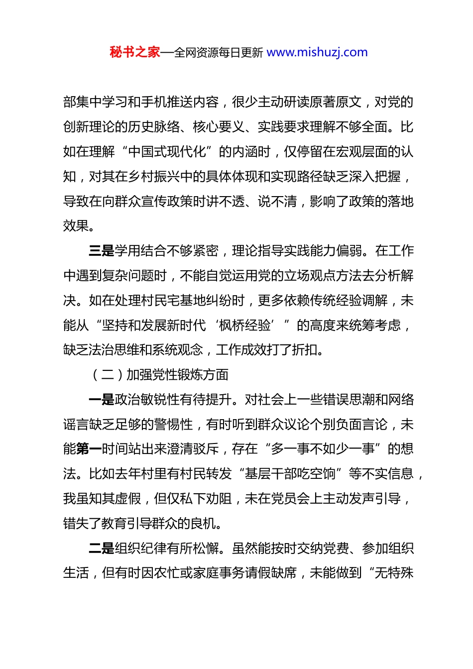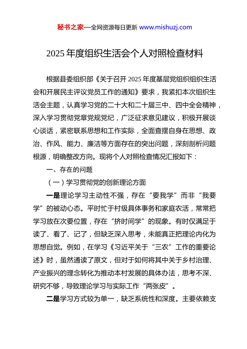 秘书之家—全网资源每日更新 www.mishuzj.com2025 年度组织生活会个人对照检查材料 根据县委组织部《关于召开 2025 年度基层党组织组织生活会和开展民主评议党员工作的通知》要求,我紧扣本次组织生活会主题,认真学习党的二十大和二十届三中、四中全会精神,深入学习贯彻党章党规党纪,广泛征求意见建议,积极开展谈心谈话,紧密联系思想和工作实际,全面查摆自身在思想、政治、作风、能力、廉洁等方面存在的突出问题,深刻剖析问题根源,明确整改方向。现将个人对照检查情况汇报如下:一、存在的问题(一)学习贯彻党的创新理论方面一是理论学习主动性不强,存在“要我学”而非“我要学”的被动心态。平时忙于村级具体事务和家庭农活,常常把学习放在次要位置,存在“挤时间学”的现象。有时仅满足于读了、看了、记了,但缺乏深入思考,未能真正把理论内化为思想自觉。例如,在学习《习近平关于“三农”工作的重要论述》时,虽然通读了原文,但对于如何将其中关于乡村治理、产业振兴的理念转化为推动本村发展的具体办法,思考不深、研究不够,导致理论学习与实际工作“两张皮”。二是学习方式较为单一,缺乏系统性和深度。主要依赖支秘书之家—全网资源每日更新 www.mishuzj.com部集中学习和手机推送内容,很少主动研读原著原文,对党的创新理论的历史脉络、核心要义、实践要求理解不够全面。比如在理解“中国式现代化”的内涵时,仅停留在宏观层面的认知,对其在乡村振兴中的具体体现和实现路径缺乏深入把握,导致在向群众宣传政策时讲不透、说不清,影响了政策的落地效果。三是学用结合不够紧密,理论指导实践能力偏弱。在工作中遇到复杂问题时,不能自觉运用党的立场观点方法去分析解决。如在处理村民宅基地纠纷时,更多依赖传统经验调解,未能从“坚持和发展新时代‘枫桥经验’”的高度来统筹考虑,缺乏法治思维和系统观念,工作成效打了折扣。(二)加强党性锻炼方面一是政治敏锐性有待提升。对社会上一些错误思潮和网络谣言缺乏足够的警惕性,有时听到群众议论个别负面言论,未能第一时间站出来澄清驳斥,存在“多一事不如少一事”的想法。比如去年村里有村民转发“基层干部吃空饷”等不实信息,我虽知其虚假,但仅私下劝阻,未在党员会上主动发声引导,错失了教育引导群众的良机。二是组织纪律有所松懈。虽然能按时交纳党费、参加组织生活,但有时因农忙或家庭事务请假缺席,未能做到“无特殊秘书之家—全网资源每日更新 www.mishuzj.com情况绝不缺席”。在参加组织生活时,发言积极性不高,多以听为主,很少主动交流心得体会,存在“走过场”倾向。在开展批评与自我批评时,自我批评避重就轻,对他人的批评也多以“建议”代“批评”,辣味不足,未能真正达到“红脸出汗”的效果。三是宗旨意识有所淡化。随着年龄增长和长期在农村生活,我产生了“守成”心态,干事创业的热情有所减退。面对村级发展中的一些难题,如集体经济发展缓慢、基础设施老化等问题,有时感到无力改变,存在“等靠要”思想,缺乏攻坚克难的斗志和担当精神。(三)联系服务群众方面一是深入群众不够经常。虽然定期参与村“两委”组织的走访活动,但大多是完成任务式走访,与群众面对面交流时间短、话题浅,未能真正沉下去了解群众的急难愁盼。例如在走访脱贫监测户时,多以询问收入、查看资料为主,对其心理状态、子女教育、就医用药等深层次需求关注不多,帮扶措施针对性不强。二是回应诉求不够及时。对群众通过微信群、电话等方式反映的问题,有时因个人事务繁忙未能第一时间回复,存在拖延现象。如今年初有村民反映村道路灯损坏影响夜间出行,我秘书之家—全网资源每日更新 www.mishuzj.com知晓后未及时向村干部反馈,直到该路段发生一起轻微交通事故后才引起重视,暴露出服务群众的主动性不足。三是政策宣传不到位。在传达惠农政策、医保缴费、养老保险等信息时,习惯于“发个通知”“贴个公告”,缺乏耐心细致地讲解。特别是对老年人群体,未采取通俗易懂的方式进行解读,导致部分群众对政策理解有偏差,影响了政策享受的公平性和满意度。(四)发挥先锋模范作用方面一是在村级事务中参...