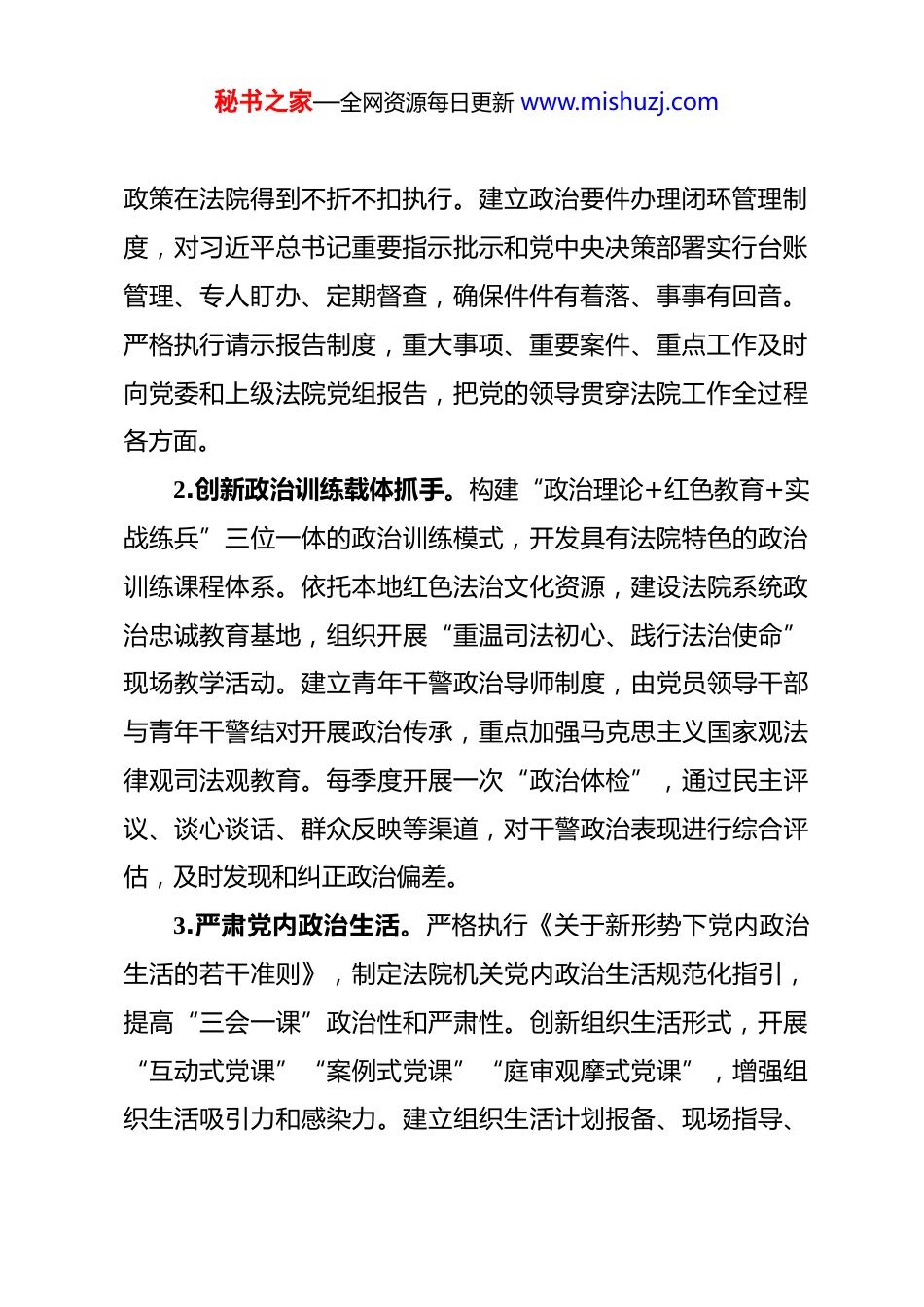 秘书之家—全网资源每日更新 www.mishuzj.com2026 年法院机关党建工作要点 2026 年市中级人民法院机关党建工作的指导思想是:坚持以习近平新时代中国特色社会主义思想为指导,全面贯彻党的二十大和二十届四中全会精神,深入落实习近平总书记关于政法工作的重要论述和系列指示批示精神,紧紧围绕新时代党的建设总要求,以党的政治建设为统领,以提升组织力为重点,以推动党建与审判执行工作深度融合为主线,持续深化全面从严治党,巩固拓展主题教育成果,着力构建高质量党建工作体系,为法院履行宪法法律赋予的职责提供坚强政治保证,为推进中国式现代化地方法治实践贡献司法力量。必须坚定不移捍卫“两个确立”,做到“两个维护”,确保法院工作始终沿着正确政治方向前进,以高质量党建引领高质量司法,以优异司法业绩迎接党的二十大届五中全会胜利召开。一、强化政治统领,筑牢忠诚根基1.坚定不移把准政治方向。全市法院要始终坚持把党的政治建设摆在首位,深刻领悟“两个确立”的决定性意义,增强“四个意识”、坚定“四个自信”、做到“两个维护”。严格贯彻落实《中国共产党政法工作条例》,健全完善法院党组在执法办案中发挥政治核心作用的制度机制,确保党的路线方针秘书之家—全网资源每日更新 www.mishuzj.com政策在法院得到不折不扣执行。建立政治要件办理闭环管理制度,对习近平总书记重要指示批示和党中央决策部署实行台账管理、专人盯办、定期督查,确保件件有着落、事事有回音。严格执行请示报告制度,重大事项、重要案件、重点工作及时向党委和上级法院党组报告,把党的领导贯穿法院工作全过程各方面。2.创新政治训练载体抓手。构建“政治理论+红色教育+实战练兵”三位一体的政治训练模式,开发具有法院特色的政治训练课程体系。依托本地红色法治文化资源,建设法院系统政治忠诚教育基地,组织开展“重温司法初心、践行法治使命”现场教学活动。建立青年干警政治导师制度,由党员领导干部与青年干警结对开展政治传承,重点加强马克思主义国家观法律观司法观教育。每季度开展一次“政治体检”,通过民主评议、谈心谈话、群众反映等渠道,对干警政治表现进行综合评估,及时发现和纠正政治偏差。3.严肃党内政治生活。严格执行《关于新形势下党内政治生活的若干准则》,制定法院机关党内政治生活规范化指引,提高“三会一课”政治性和严肃性。创新组织生活形式,开展“互动式党课”“案例式党课”“庭审观摩式党课”,增强组织生活吸引力和感染力。建立组织生活计划报备、现场指导、秘书之家—全网资源每日更新 www.mishuzj.com效果评估机制,院领导每年至少参加并指导 2 个以上党支部的组织生活会。推行“政治生日”纪念活动,通过重温入党誓词、赠送“政治生日”礼物、发表“政治生日”感言等形式,强化党员身份认同和政治归属感。4.健全政治督察机制。制定法院机关政治督察工作办法,明确督察内容、程序和结果运用,重点督察贯彻落实习近平总书记重要指示批示精神和党中央决策部署情况。建立干警政治素质档案,将政治表现作为干部选拔任用、职级晋升、评先评优的首要标准。每半年开展一次政治风险排查,重点关注重大敏感案件审理、意识形态阵地管理、干警网络言行等方面的风险点,制定防控预案。落实意识形态工作责任制,加强对司法领域错误思潮的辨析和引导,坚决抵制西方“宪政”“三权分立”等错误观点影响。二、深化理论武装,凝聚思想共识5.构建分层分类学习体系。坚持把学懂弄通做实习近平新时代中国特色社会主义思想作为首要政治任务,完善党组理论学习中心组引领学、支部集中学、青年理论学习小组交流学、党员个人自主学的“四学”机制。制定 2026 年度理论学习计划,明确学习重点和考核要求,重点学习《习近平法治思想学习纲要》、习近平总书记关于政法工作重要论述摘编等原著原文。秘书之家—全网资源每日更新 www.mishuzj.com建立“第一议题”学习督查通报制度,确保习近平总书记最新重要讲话和指示批示精神在 24 小时内传达学习、72 小时内研究落实举措。开展“习语润心”系列学习活动,通过开设专题专栏、编写通俗读物、制作微视频等形式...