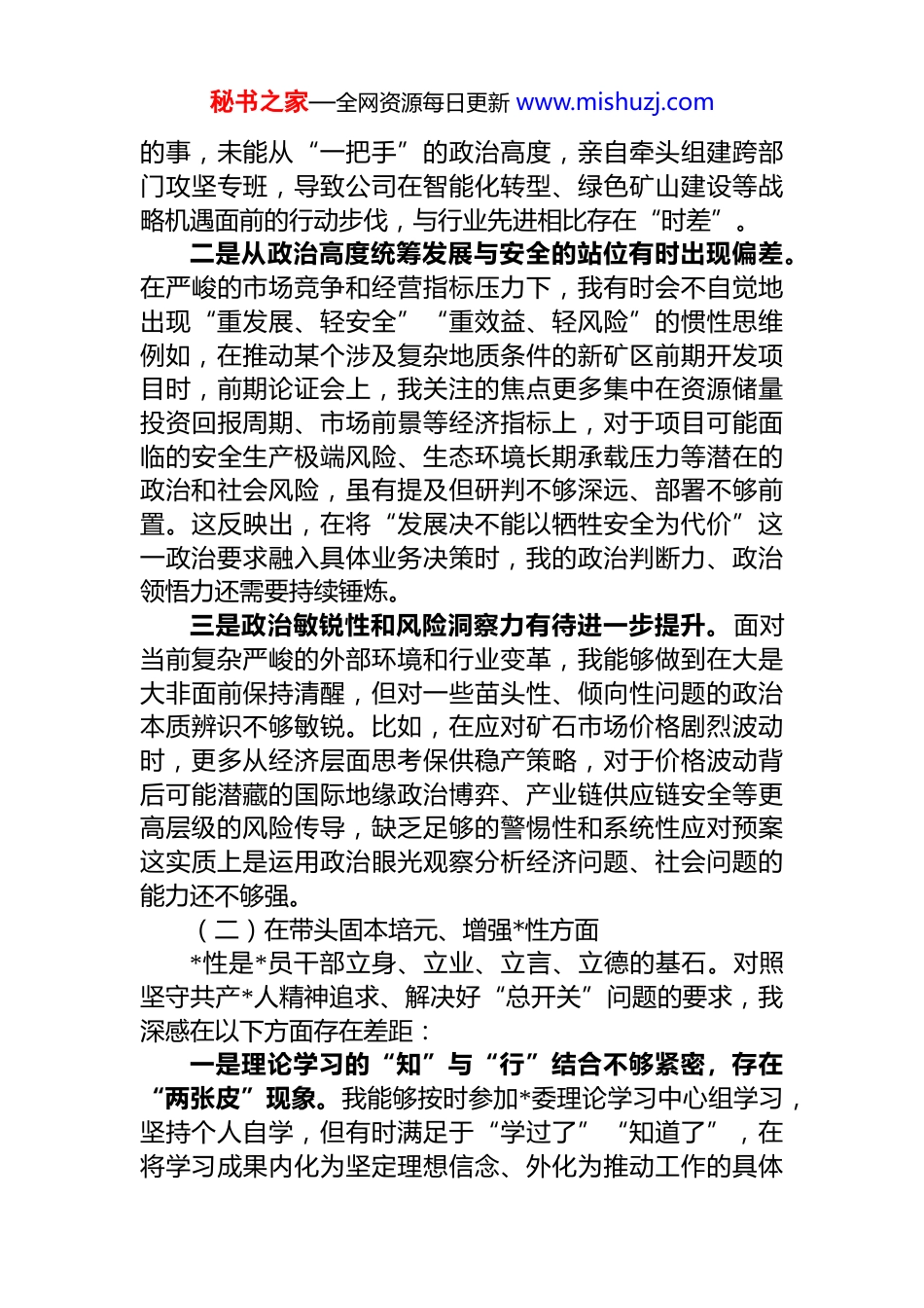 秘书之家—全网资源每日更新 www.mishuzj.comxx 铁矿公司*委书记 2025 年度民主生活会对照检查材料根据上级*委关于召开 2025 年度民主生活会的统一部署和要求,我紧扣会议主题,在深入学习领会**************思想、*的二十届四中全会精神以及******关于加强*的建设、推进自我革命、深化作风建设等一系列重要论述和指示批示精神的基础上,严格按照中共中央政治局民主生活会强调的“五个带头”重点要求,坚持把自己摆进去、把职责摆进去、把工作摆进去,通过群众提、自己找、上级点、互相帮等方式,广泛征求意见,深入谈心谈话,全面查摆自身存在的问题,深刻剖析思想根源,并明确了今后的努力方向和整改措施。现将个人对照检查情况报告如下。一、对照检查发现的主要问题(一)在带头强化政治忠诚、提高政治能力方面深刻领悟“两个确立”的决定性意义,坚决做到“两个维护”,是根本的政治纪律和政治规矩。对照反思,我主要存在以下不足:一是理论武装向实践转化的穿透力、创新性有待加强。虽然能够坚持学习*的创新理论,但在“知其然更知其所以然”上还不够透彻,运用其立场观点方法分析解决企业发展中结构性、深层次矛盾的能力尚有差距。例如,在贯彻落实*的二十届四中全会关于“加快高水平科技自立自强,引领发展新质生产力”等重大战略部署时,我虽然第一时间组织传达学习,但在结合公司实际,系统谋划如何将传统采矿选矿产业与现代信息技术、绿色低碳技术深度融合打造具有矿业特色的新质生产力方面,思路还不够开阔,举措还不够具体。有时仍习惯性将技术创新视为技术部门秘书之家—全网资源每日更新 www.mishuzj.com的事,未能从“一把手”的政治高度,亲自牵头组建跨部门攻坚专班,导致公司在智能化转型、绿色矿山建设等战略机遇面前的行动步伐,与行业先进相比存在“时差”。二是从政治高度统筹发展与安全的站位有时出现偏差。在严峻的市场竞争和经营指标压力下,我有时会不自觉地出现“重发展、轻安全”“重效益、轻风险”的惯性思维例如,在推动某个涉及复杂地质条件的新矿区前期开发项目时,前期论证会上,我关注的焦点更多集中在资源储量投资回报周期、市场前景等经济指标上,对于项目可能面临的安全生产极端风险、生态环境长期承载压力等潜在的政治和社会风险,虽有提及但研判不够深远、部署不够前置。这反映出,在将“发展决不能以牺牲安全为代价”这一政治要求融入具体业务决策时,我的政治判断力、政治领悟力还需要持续锤炼。三是政治敏锐性和风险洞察力有待进一步提升。面对当前复杂严峻的外部环境和行业变革,我能够做到在大是大非面前保持清醒,但对一些苗头性、倾向性问题的政治本质辨识不够敏锐。比如,在应对矿石市场价格剧烈波动时,更多从经济层面思考保供稳产策略,对于价格波动背后可能潜藏的国际地缘政治博弈、产业链供应链安全等更高层级的风险传导,缺乏足够的警惕性和系统性应对预案这实质上是运用政治眼光观察分析经济问题、社会问题的能力还不够强。(二)在带头固本培元、增强*性方面*性是*员干部立身、立业、立言、立德的基石。对照坚守共产*人精神追求、解决好“总开关”问题的要求,我深感在以下方面存在差距:一是理论学习的“知”与“行”结合不够紧密,存在“两张皮”现象。我能够按时参加*委理论学习中心组学习,坚持个人自学,但有时满足于“学过了”“知道了”,在将学习成果内化为坚定理想信念、外化为推动工作的具体秘书之家—全网资源每日更新 www.mishuzj.com行动上,转化效率不高。例如,在深入学习***生态文明思想后,我理解了“绿水青山就是金山银山”的核心要义,但在主持评审某尾矿库生态修复治理方案时,思维定式仍然倾向于优先比较不同方案的投资成本和工程周期,对于如何将生态价值、社会效益更富创造性地融入方案设计,实现“既要金山银山,又要绿水青山”的更高标准,主动引导和提升设计团队理念的力度不足。这表明,理论学习还未完全做到融会贯通、指导实践。二是*性锤炼的自觉性和“自我革命”精神有所松懈。随着职务提升和工作繁忙,有时不自觉地放松了对主观世界的持续改造,艰苦奋斗、攻坚克难的锐气有所消磨。...