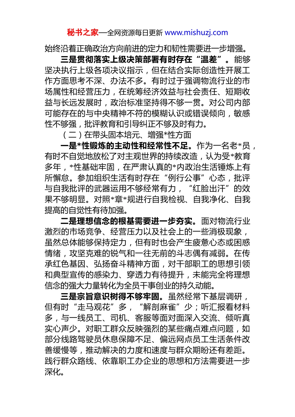 秘书之家—全网资源每日更新 www.mishuzj.comxx 物流公司*委书记 2025 年度民主生活会对照检查材料根据上级*组织关于开好 2025 年度民主生活会的统一部署和要求,本人紧密结合思想、学习和工作实际,在深入学习*的创新理论、广泛征求意见建议、扎实开展谈心谈话的基础上,聚焦会议主题,对照*章*规 dj,对照初心使命,对照职工群众期待,对照先进典型和身边榜样,重点围绕六个方面深入查摆自身存在的突出问题,深刻剖析问题根源,明确了今后的努力方向和改进措施。现将对照检查情况报告如下:一、存在的突出问题(一)在带头强化政治忠诚、提高政治能力方面一是理论武装的深度和转化度仍有欠缺。虽然能够坚持参加中心组学习、完成规定篇目阅读,但在系统把握、融会贯通*的创新理论,特别是关于高质量发展、现代流通体系建设、供应链安全等重要论述上还不够深入。有时满足于“学过了”“知道了”,将理论学习成果转化为推动公司战略转型、破解发展难题的具体思路和有效举措的能力有待加强,运用政治眼光观察和分析物流行业发展趋势应对风险挑战的预见性和主动性不足。二是政治判断力、领悟力、执行力有待持续提升。在深刻领会*中央决策部署的政治意图、战略考量与实践要求方面,有时存在结合公司实际不够紧密的情况。例如,在落实国家“双碳”目标、推动绿色物流发展方面,虽然制定了相关规划,但在具体项目落地、技术路径选择上步伐不够快、创新举措不够多。对一些复杂敏感问题,从政治高度进行研判和处置的能力仍需锤炼,确保公司改革发展秘书之家—全网资源每日更新 www.mishuzj.com始终沿着正确政治方向前进的定力和韧性需要进一步增强。三是贯彻落实上级决策部署有时存在“温差”。能够坚决执行上级各项决议指示,但在结合实际创造性开展工作方面思考不深、办法不多。有时过于强调物流行业的市场属性和经营压力,在统筹经济效益与社会责任、短期收益与长远发展时,政治标准坚持得不够一贯。对公司内部可能存在的与中央精神不符的模糊认识或错误倾向,敏感性不够强,批评教育和引导纠正不够及时有力。(二)在带头固本培元、增强*性方面一是*性锻炼的主动性和经常性不足。作为一名老*员,有时不自觉地放松了对主观世界的持续改造,认为受*教育多年,*性基础牢固,在严肃认真的*内政治生活锤炼上有所懈怠。参加组织生活有时存在“例行公事”心态,批评与自我批评的武器运用不够经常有力,“红脸出汗”的效果不够明显。对照*章*规进行自我检视、自我净化、自我提高的自觉性有待加强。二是理想信念的根基需要进一步夯实。面对物流行业激烈的市场竞争、经营压力以及社会上的一些消极现象,虽然总体能够保持定力,但有时也会产生疲惫心态或困惑情绪,攻坚克难的锐气和一往无前的斗志偶有减弱。在传承红色基因、弘扬奋斗精神方面,对干部职工的思想引领和典型宣传的感染力、穿透力有待提升,未能完全将理想信念的强大力量转化为全员干事创业的持久动能。三是宗旨意识树得不够牢固。虽然经常下基层调研,但有时“走马观花”多,“解剖麻雀”少;听汇报看材料多,与一线员工、司机、客服等面对面深入交流、倾听真实心声少。对职工群众反映强烈的某些痛点难点问题,如部分线路驾驶员休息保障不足、偏远网点员工生活条件改善缓慢等,推动解决的力度和速度与群众期盼还有差距。践行群众路线、依靠职工办企业的思想和方法需要进一步深化。秘书之家—全网资源每日更新 www.mishuzj.com(三)在带头敬畏人民、敬畏组织、敬畏法纪方面一是对“敬畏人民”的理解和实践需深化。深知企业发展源于人民、服务于人民,但在具体工作中,有时更关注客户满意度、市场占有率等显性指标,对如何更好地满足人民群众日益增长的高品质物流服务需求,如何在应急保供、乡村振兴等重大民生任务中更好履行国企社会责任思考谋划的系统性、前瞻性不足。尊重职工主体地位、保障职工合法权益的机制和渠道有待进一步畅通和落实。二是对“敬畏组织”的自觉性有待加强。能够自觉服从组织决定、执行组织纪律,但在向组织请示报告工作的规范性、及时性上还有提升空间。有时认为公司经营事务繁重,对一些需要报告的...