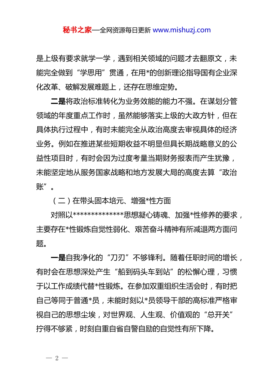 秘书之家—全网资源每日更新 www.mishuzj.comx 发展集团副总经理 2025 年度民主生活会个人发言提纲:聚焦作风建设强根基,凝心聚力攻坚促发展按照集团*委关于开好 2025 年度民主生活会的统一部署,本人紧扣会议主题,深入学习贯彻**************思想,全面贯彻落实*的二十届四中全会精神。会前,我通过集体研讨与个人自学相结合的方式,重温了中央八项规定精神,广泛征求了分管部门和基层单位的意见,深入开展谈心谈话。在此基础上,我严格对照“五个方面”要求,结合分管的投资经营、项目建设及安全生产工作实际,深刻查摆自身存在的问题,剖析深层次原因,明确整改方向。现将个人对照检查情况汇报如下:一、存在的主要问题(一)在带头强化政治忠诚、提高政治能力方面对照深刻领悟“两个确立”、做到“两个维护”及贯彻*中央决策部署的要求,主要存在政治理论学习“实用主义”倾向明显、政治判断力与执行力融合度不够两方面问题。一是理论武装存在“急拿现用”现象。日常工作中,往往将精力更多集中在集团业务指标考核、投融资洽谈等具体事务上,对**************思想的学习缺乏系统性和连贯性。往往— 1 —秘书之家—全网资源每日更新 www.mishuzj.com是上级有要求就学一学,遇到相关领域的问题才去翻原文,未能完全做到“学思用”贯通,在用*的创新理论指导国有企业深化改革、破解发展难题上,还存在思维定势。二是将政治标准转化为业务效能的能力不强。在谋划分管领域的年度重点工作时,虽然能够落实上级的大政方针,但在具体执行过程中,有时未能完全从政治高度去审视具体的经济业务。例如在推进某些短期收益不明显但具长期战略意义的公益性项目时,有时会因为过度考量当期财务报表而产生犹豫,未能坚定地从服务国家战略和地方发展大局的高度去算“政治账”。(二)在带头固本培元、增强*性方面对照以**************思想凝心铸魂、加强*性修养的要求,主要存在*性锻炼自觉性弱化、艰苦奋斗精神有所减退两方面问题。一是自我净化的“刀刃”不够锋利。随着任职时间的增长,有时会在思想深处产生“船到码头车到站”的松懈心理,习惯于以工作成绩代替*性锻炼。在参加双重组织生活会时,有时把自己等同于普通*员,未能时刻以*员领导干部的高标准严格审视自己的思想尘埃,对世界观、人生观、价值观的“总开关”拧得不够紧,时刻自重自省自警自励的自觉性有所下降。— 2 —秘书之家—全网资源每日更新 www.mishuzj.com二是艰苦奋斗的本色擦得不亮。在商务接待和公务活动中,虽然严格遵守规定,但在内心深处对勤俭节约的认识有时流于形式。例如在办公耗材使用、差旅安排等细节上,有时觉得作为集团领导不必过于“抠搜”,未能像抓利润一样抓节约。面对急难险重的任务,有时缺乏年轻时那种“不论条件、只讲奉献”的冲劲,吃苦耐劳的精神成色稍显不足。(三)在带头敬畏人民、敬畏组织、敬畏法纪方面对照走好新时代*的群众路线、执行民主集中制及廉洁自律的要求,主要存在深入基层调研“浮光掠影”、贯彻民主集中制“参与度”不均衡两方面问题。一是践行“四下基层”不够深入扎实。在分管的项目建设领域,虽然经常去施工现场,但往往是“坐着车子转、隔着玻璃看”,听项目经理汇报多,与一线班组长、农民工面对面交流少。对基层职工在薪酬待遇、职业发展等方面的急难愁盼问题,了解得还不够透彻,解决得还不够及时,密切联系群众的“最后一公里”还没完全打通。二是执行民主集中制存在“避重就轻”倾向。在参与*委会、董事会决策时,对自己分管领域的事项关注多、发表意见多,对其他班子成员分管的领域,有时为了保持一团和气,往往是“随大流”、表态少,缺乏深入的建设性意见。在分管部门内— 3 —秘书之家—全网资源每日更新 www.mishuzj.com部召开会议时,有时为了提高效率,听取下属意见不够充分,存在以行政命令代替民主讨论的现象。(四)在带头干事创业、担当作为方面对照完整准确全面贯彻新发展理念、在“十四五”收官及“十五五”开局中担当作为的要求,主要存在改革攻坚的“闯劲”不足、防范化解风险的“预见性”不强两方面问题。一是应对复杂环境的进取意识...