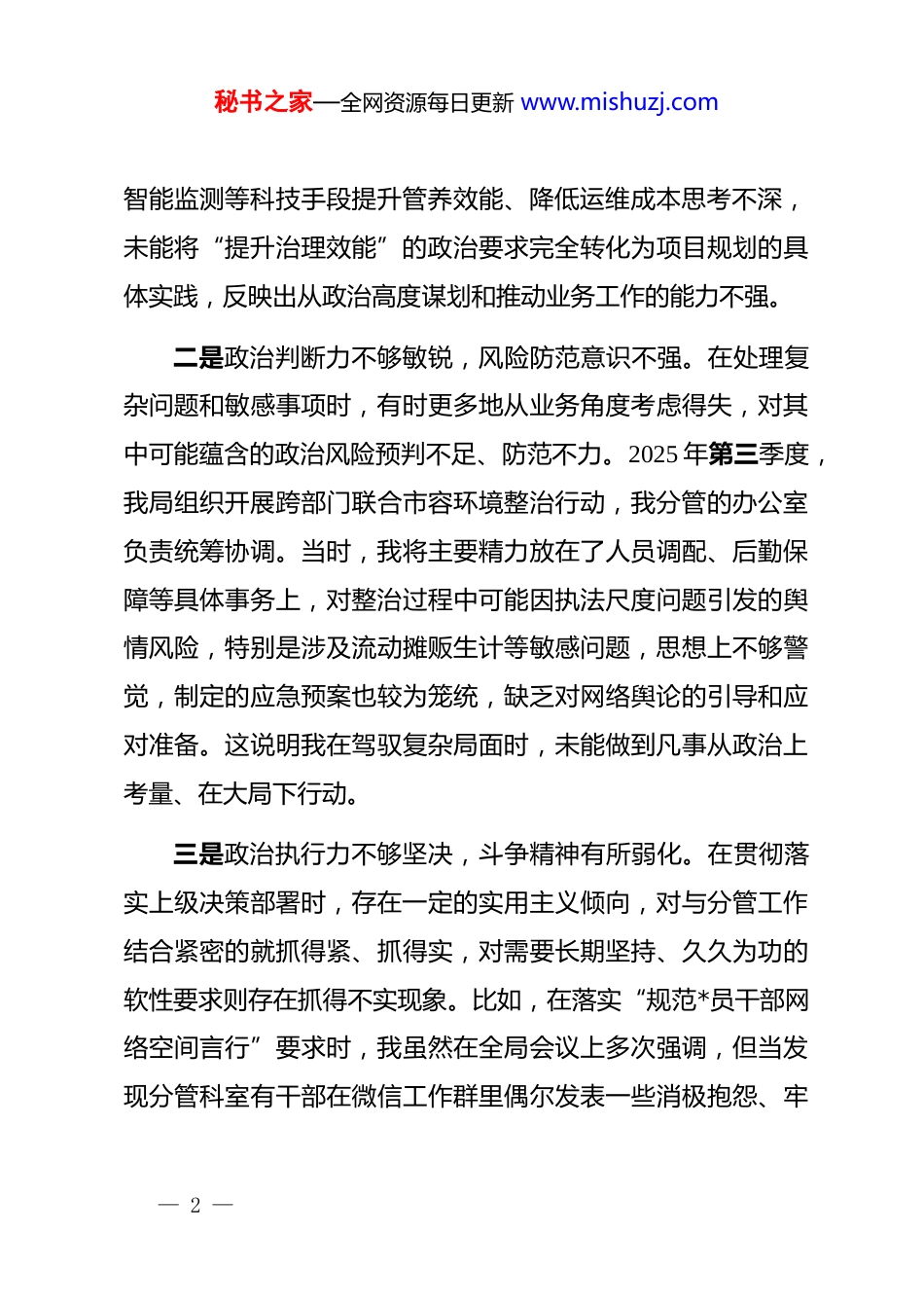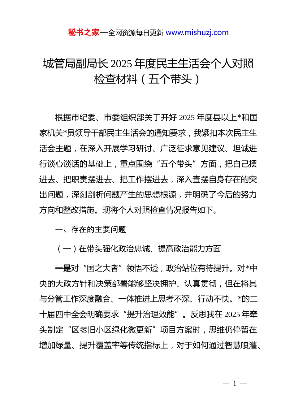 秘书之家—全网资源每日更新 www.mishuzj.com城管局副局长 2025 年度民主生活会个人对照检查材料(五个带头)根据市纪委、市委组织部关于开好 2025 年度县以上*和国家机关*员领导干部民主生活会的通知要求,我紧扣本次民主生活会主题,在深入开展学习研讨、广泛征求意见建议、坦诚进行谈心谈话的基础上,重点围绕“五个带头”方面,把自己摆进去、把职责摆进去、把工作摆进去,深入查摆自身存在的突出问题,深刻剖析问题产生的思想根源,并明确了今后的努力方向和整改措施。现将个人对照检查情况报告如下。一、存在的主要问题(一)在带头强化政治忠诚、提高政治能力方面一是对“国之大者”领悟不透,政治站位有待提升。对*中央的大政方针和决策部署能够坚决拥护、认真贯彻,但在将其与分管工作深度融合、一体推进上思考不深、行动不快。*的二十届四中全会明确要求“提升治理效能”。反思我在 2025 年牵头制定“区老旧小区绿化微更新”项目方案时,思维仍停留在增加绿量、提升覆盖率等传统指标上,对于如何通过智慧喷灌、— 1 —秘书之家—全网资源每日更新 www.mishuzj.com智能监测等科技手段提升管养效能、降低运维成本思考不深,未能将“提升治理效能”的政治要求完全转化为项目规划的具体实践,反映出从政治高度谋划和推动业务工作的能力不强。二是政治判断力不够敏锐,风险防范意识不强。在处理复杂问题和敏感事项时,有时更多地从业务角度考虑得失,对其中可能蕴含的政治风险预判不足、防范不力。2025 年第三季度,我局组织开展跨部门联合市容环境整治行动,我分管的办公室负责统筹协调。当时,我将主要精力放在了人员调配、后勤保障等具体事务上,对整治过程中可能因执法尺度问题引发的舆情风险,特别是涉及流动摊贩生计等敏感问题,思想上不够警觉,制定的应急预案也较为笼统,缺乏对网络舆论的引导和应对准备。这说明我在驾驭复杂局面时,未能做到凡事从政治上考量、在大局下行动。三是政治执行力不够坚决,斗争精神有所弱化。在贯彻落实上级决策部署时,存在一定的实用主义倾向,对与分管工作结合紧密的就抓得紧、抓得实,对需要长期坚持、久久为功的软性要求则存在抓得不实现象。比如,在落实“规范*员干部网络空间言行”要求时,我虽然在全局会议上多次强调,但当发现分管科室有干部在微信工作群里偶尔发表一些消极抱怨、牢— 2 —秘书之家—全网资源每日更新 www.mishuzj.com骚怪话时,考虑到不影响工作大局,多以提醒为主,未能进行严肃的批评教育,没有旗帜鲜明地进行斗争,反映出在从严管理上失之于宽、失之于软,斗争的坚决性不彻底。(二)在带头固本培元、增强*性方面一是理论武装“内化”不足,学用结合不紧密。虽然能够按要求完成对**************思想、*的二十届三中、四中全会精神以及中央八项规定精神的学习,但存在“为学习而学习”的现象,把理论学习当成“软任务”,在深钻细研、内化于心、外化于行上做得不好。2025 年,在办公室内部推动公文处理流程优化时,我虽然也强调要贯彻落实中央为基层减负的精神,但提出的措施多是“压缩层级”“限时办结”等常规手段,对于引入数字化办公系统,从根本上再造流程、提升效率这一革命性举措,因担心改变现有习惯、投入较大而犹豫不决,说明理论学习没有真正成为改造主观世界和指导实践的强大思想武器。二是*性锤炼“淬火”不够,精神追求有偏差。在*性修养上对自己的要求有所放松,艰苦奋斗、自我革命的精神有所减退。在工作中,潜意识里还是希望多出成绩、出亮点,对于“显绩”和“潜绩”的关系处理得不好。2025 年,分管的城区— 3 —秘书之家—全网资源每日更新 www.mishuzj.com绿化工作新建、改建了 12 个“口袋公园”,新增绿地面积 3.5万平方米,这项数据在年终总结中十分亮眼。但我对这些公园建成后的长期管护、实际使用效益等“潜绩”关注不够,导致后续检查发现其中 3 个公园因选址不当、配套设施维护不及时等问题,人气不高,没有完全发挥应有的社会效益。这反映出我的政绩观存在偏差,*性锤炼的成色不足。三是纪律规矩“戒尺”不严,自我约束有松懈。能够严守*的政治纪律和...