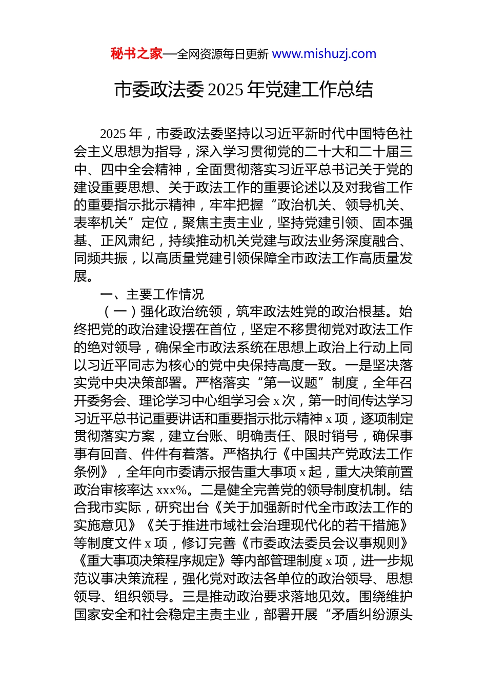 秘书之家—全网资源每日更新 www.mishuzj.com党支部 2025 年党建工作总结和 2026 年工作打算汇编(5 篇)目录1.市委政法委 2025 年党建工作总结...........................................22.党支部 2025 年党建工作总结和 2026 年工作打算(社区).....................................................................................................83.党支部 2025 年党建工作总结...............................................144.局机关党支部 2025 年党建工作总结和 2026 年工作打算.21秘书之家—全网资源每日更新 www.mishuzj.com市委政法委 2025 年党建工作总结2025 年,市委政法委坚持以习近平新时代中国特色社会主义思想为指导,深入学习贯彻党的二十大和二十届三中、四中全会精神,全面贯彻落实习近平总书记关于党的建设重要思想、关于政法工作的重要论述以及对我省工作的重要指示批示精神,牢牢把握“政治机关、领导机关、表率机关”定位,聚焦主责主业,坚持党建引领、固本强基、正风肃纪,持续推动机关党建与政法业务深度融合、同频共振,以高质量党建引领保障全市政法工作高质量发展。一、主要工作情况(一)强化政治统领,筑牢政法姓党的政治根基。始终把党的政治建设摆在首位,坚定不移贯彻党对政法工作的绝对领导,确保全市政法系统在思想上政治上行动上同以习近平同志为核心的党中央保持高度一致。一是坚决落实党中央决策部署。严格落实“第一议题”制度,全年召开委务会、理论学习中心组学习会 x 次,第一时间传达学习习近平总书记重要讲话和重要指示批示精神 x 项,逐项制定贯彻落实方案,建立台账、明确责任、限时销号,确保事事有回音、件件有着落。严格执行《中国共产党政法工作条例》,全年向市委请示报告重大事项 x 起,重大决策前置政治审核率达 xxx%。二是健全完善党的领导制度机制。结合我市实际,研究出台《关于加强新时代全市政法工作的实施意见》《关于推进市域社会治理现代化的若干措施》等制度文件 x 项,修订完善《市委政法委员会议事规则》《重大事项决策程序规定》等内部管理制度 x 项,进一步规范议事决策流程,强化党对政法各单位的政治领导、思想领导、组织领导。三是推动政治要求落地见效。围绕维护国家安全和社会稳定主责主业,部署开展“矛盾纠纷源头秘书之家—全网资源每日更新 www.mishuzj.com化解攻坚年”行动,在全市 x 个县(区)综治中心推行“一站式”解纷服务模式,实现群众诉求“最多跑一地”。组织“平安护航·百日攻坚”专项行动,排查化解重点风险隐患 x 类 x 项,有力维护社会大局持续稳定。2025 年全市公众安全感达 xx.x%,同比提升 x.x 个百分点。(二)深化理论武装,坚持不懈用党的创新理论凝心铸魂。坚持把学习贯彻习近平新时代中国特色社会主义思想作为首要政治任务,着力在学懂弄通做实上下功夫,切实增强党员干部的政治认同、思想认同、理论认同、情感认同。一是发挥“关键少数”示范带动作用。完善委领导班子理论学习中心组学习制度,全年开展集中学习 x 次,专题研讨 x 次,重点围绕习近平法治思想、总体国家安全观、新质生产力与政法现代化等主题进行深度研学。班子成员带头讲党课 x 场,撰写调研报告 x 篇,推动学习成果转化为工作思路和政策举措。二是实现政治轮训全覆盖。联合市委组织部、市委党校举办全市政法领导干部学习贯彻党的二十届四中全会精神专题研讨班 x 期,培训县处级干部 x 人次;分层分类开展基层政法干警政治轮训 x 轮,覆盖公安、检察、法院、司法行政等系统一线人员 x 万余人次。首次实现全市政法队伍政治轮训全周期、全链条、全岗位覆盖。三是构建“四学联动”长效机制。扎实推进“以学铸魂、以学增智、以学正风、以学促干”机制建设,编制印发《政法系统应知应会理论知识手册》《党规党纪学习读本》等资料 x 册;建立干部基本素质测试制度,组织开展闭卷考试 x 次,合格率达 xx.x%。围绕“基层治理中的法治短板”“涉法涉诉信访源头治理”等课题开展“关键小事”调研攻关,x 项成果获省级表彰。(三)夯实...
