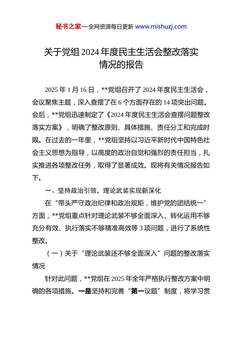 秘书之家—全网资源每日更新 www.mishuzj.com关于党组 2024 年度民主生活会整改落实情况的报告 2025 年 1 月 16 日,**党组召开了 2024 年度民主生活会,会议聚焦主题,深入查摆了在 6 个方面存在的 14 项突出问题。会后,**党组迅速制定了《2024 年度民主生活会查摆问题整改落实方案》,明确了整改原则、具体措施、责任分工和完成时限。在过去的一年里,**党组坚持以习近平新时代中国特色社会主义思想为指导,以高度的政治自觉和强烈的责任担当,扎实推进各项整改任务,取得了显著成效。现将有关情况报告如下。一、坚持政治引领,理论武装实现新深化在“带头严守政治纪律和政治规矩,维护党的团结统一”方面,**党组重点针对理论武装不够全面深入、转化运用不够充分有效、执行落实不够精准高效等 3 项问题,进行了系统性整改。(一)关于“理论武装还不够全面深入”问题的整改落实情况针对此问题,**党组在 2025 年全年严格执行整改方案中明确的各项措施。一是坚持和完善“第一议题”制度,将学习贯秘书之家—全网资源每日更新 www.mishuzj.com彻习近平总书记最新重要讲话和指示批示精神作为**党组会议、常务会议的首要议题,确保党的创新理论第一时间传达、第一时间学习。二是健全理论学习长效机制,制定了 2025 年度党组理论学习中心组学习计划,全年组织集中学习研讨 12 次,党组成员带头撰写学习体会和调研报告,发挥了“关键少数”的示范引领作用。三是注重学思践悟,将理论学习与解决思想困惑、提升精神状态相结合,党组成员自觉对照检查,牢固树立了正确的权力观、政绩观、事业观,政治判断力、政治领悟力、政治执行力得到显著增强。(二)关于“转化运用还不够充分有效”问题的整改落实情况为解决学用脱节问题,**党组大力弘扬理论联系实际的学风。一是坚持“干什么学什么”,班子成员时常对照习近平总书记视察甘肃重要讲话重要指示精神,将分管领域的工作摆进去,深入研究政策要求,理清发展思路,有效提升了运用“七种思维能力”解决复杂问题的本领。二是优化了**常务会议等重要会议的研究决策方式,将学习领会中央和省、市委精神作为研究具体工作的前置环节,确保各项决策部署与上级精神精准对表。三是通过一系列实践,党组成员成功将学习成果转化为推动**高质量发展的具体行动,特别是在“2+4”现代化产业秘书之家—全网资源每日更新 www.mishuzj.com体系构建、新质生产力培育等关键工作中,体现了理论指导实践的强大力量。(三)关于“执行落实还不够精准高效”问题的整改落实情况针对执行力方面存在的问题,**党组在 2025 年采取了强有力措施。一是紧盯国家政策导向,围绕“十五五”规划编制,超前谋划了一批符合**实际的重大项目,并积极向上汇报对接,成功将多个项目纳入国家和省级规划盘子,为**长远发展积蓄了动能。二是全面深化改革,严格按照《**市贯彻落实〈关于进一步全面深化改革、推进中国式现代化的决定〉的任务分解方案》要求,清单化推动各项改革举措落地。特别是在支持**集团股改上市、深化零基预算管理改革、高质量完成国企改革深化提升行动等方面取得了标志性成果。三是积极融入区域发展大局,全面落实省委打造“七地一屏一通道”的部署,加强与河西走廊其他市州的交流合作,在构建一体化发展机制上迈出了坚实步伐。二、强化党性修养,纪律作风建设取得新成效在“带头增强党性、严守纪律、砥砺作风”方面,**党组着力解决了党纪学习教育常态化长效化不足和党风廉政建设长管长严不够的问题。秘书之家—全网资源每日更新 www.mishuzj.com(一)关于“党纪学习教育还没有做到常态长效”问题的整改落实情况**党组深刻认识到纪律建设的长期性、复杂性,将党纪学习教育融入日常、抓在经常。2025 年,通过党组会议、中心组学习、“三会一课”等多种形式,反复学习《中国共产党纪律处分条例》等党纪党规。同时,建立了常态化警示教育机制,定期通报违纪违法典型案例,组织政府系统党员干部观看警示教育片、参观清廉教育基地,用身边事教育身边人,引导广大干部职工知敬畏、存戒惧、守底线,使铁的纪律真正转化为党员干部的日...