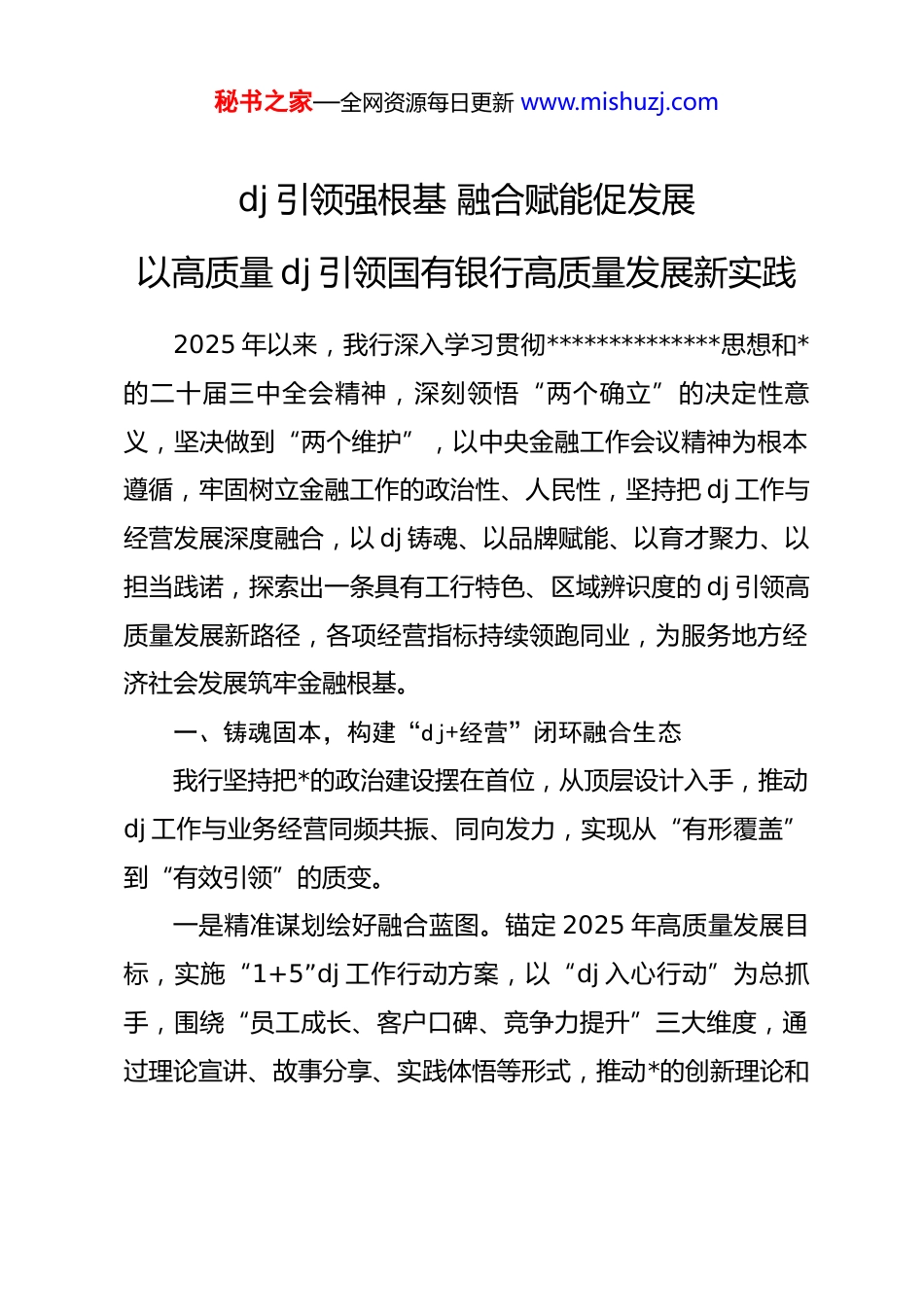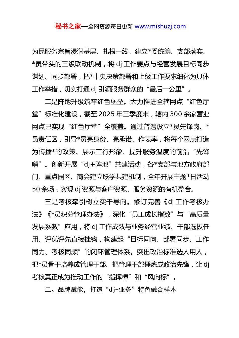 秘书之家—全网资源每日更新 www.mishuzj.comdj 引领强根基 融合赋能促发展以高质量 dj 引领国有银行高质量发展新实践2025 年以来,我行深入学习贯彻**************思想和*的二十届三中全会精神,深刻领悟“两个确立”的决定性意义,坚决做到“两个维护”,以中央金融工作会议精神为根本遵循,牢固树立金融工作的政治性、人民性,坚持把 dj 工作与经营发展深度融合,以 dj 铸魂、以品牌赋能、以育才聚力、以担当践诺,探索出一条具有工行特色、区域辨识度的 dj 引领高质量发展新路径,各项经营指标持续领跑同业,为服务地方经济社会发展筑牢金融根基。一、铸魂固本,构建“dj+经营”闭环融合生态我行坚持把*的政治建设摆在首位,从顶层设计入手,推动dj 工作与业务经营同频共振、同向发力,实现从“有形覆盖”到“有效引领”的质变。一是精准谋划绘好融合蓝图。锚定 2025 年高质量发展目标,实施“1+5”dj 工作行动方案,以“dj 入心行动”为总抓手,围绕“员工成长、客户口碑、竞争力提升”三大维度,通过理论宣讲、故事分享、实践体悟等形式,推动*的创新理论和秘书之家—全网资源每日更新 www.mishuzj.com为民服务宗旨浸润基层、扎根一线。建立*委统筹、支部落实、*员带头的三级联动机制,将 dj 工作要点与经营发展目标同步谋划、同步部署,把*中央决策部署和上级工作要求细化为具体工作举措,切实打通 dj 引领服务群众的“最后一公里”。二是阵地升级筑牢红色堡垒。大力推进全辖网点“红色厅堂”标准化建设,截至 2025 年三季度末,辖内 300 余家营业网点已实现“红色厅堂”全覆盖。通过普遍设立*员先锋岗、*员责任区,引导*员亮身份、亮承诺、作表率,将每个网点打造为传播*的政策、展示工行形象、提升服务温度的前沿“先锋哨”。创新开展“dj+阵地”共建活动,各*支部与地方政府部门、重点园区、商会建立联学共建机制,全年开展主题*日活动50 余场,实现 dj 资源与客户资源、服务资源的有机整合。三是考核牵引树立实干导向。修订完善《dj 工作考核办法》《*员积分管理办法》,深化“员工成长指数”与“高质量发展系数”应用,将 dj 工作成效与业务经营业绩、干部选拔任用、评优评先直接挂钩,构建起“目标同向、部署同步、工作同力、考核同频”的闭环管理体系。突出政治标准选人用人,把*员骨干培养成管理干部、把管理干部锤炼成政治先锋,让 dj考核真正成为推动工作的“指挥棒”和“风向标”。二、品牌赋能,打造“dj+业务”特色融合样本秘书之家—全网资源每日更新 www.mishuzj.com立足区域发展战略定位,倾力打造“工诚北疆”dj 品牌体系,以品牌化思维推动 dj 与重点业务深度融合,在服务国家战略中彰显国有大行担当。一是“dj+普惠金融”润泽民生。创新“dj+普惠金融”服务模式,组建 76 支工银“乌兰牧骑”*员金融服务小分队,深入开展“九进”服务和“四送”工作,足迹遍布城乡牧区,累计服务群众超 4.7 万次。针对小微企业、新型农业经营主体融资痛点,依托“e 抵快贷”“种植 e 贷”等数字化产品,构建“线上+线下”双线服务体系,客户从申请到放款平均时效压缩至 2.3 小时。截至 2025 年三季度末,普惠贷款余额达 420亿元,其中普惠型涉农贷款增速达 16.45%,高于全行涉农贷款增速 4.4 个百分点,相关实践获评《人民日报》“新时代企业 dj”优秀案例。二是“dj+绿色金融”守护生态。紧紧围绕地方“筑牢生态安全屏障”战略部署,以 dj 引领绿色金融发展,*委牵头建立绿色信贷专项机制,为绿色项目、低碳项目开辟审批“绿色通道”。强化*员先锋带头作用,组建绿色金融攻坚小组,主动对接风电、光伏、生态治理等重点项目,加大信贷投放力度。截至 2025 年三季度末,全行绿色信贷余额达 1106 亿元,较年初净增 133 亿元,市场份额持续领先,以金融活水滋养绿色秘书之家—全网资源每日更新 www.mishuzj.com发展沃土。三是“dj+跨境金融”助力开放。紧抓向北开放战略机遇,以“dj+跨境金融”模式搭建高效服务平台。在边境口岸支行组建*员跨境金融服务先锋队,与海关、边检、外汇管理等单位建立 dj 协作...